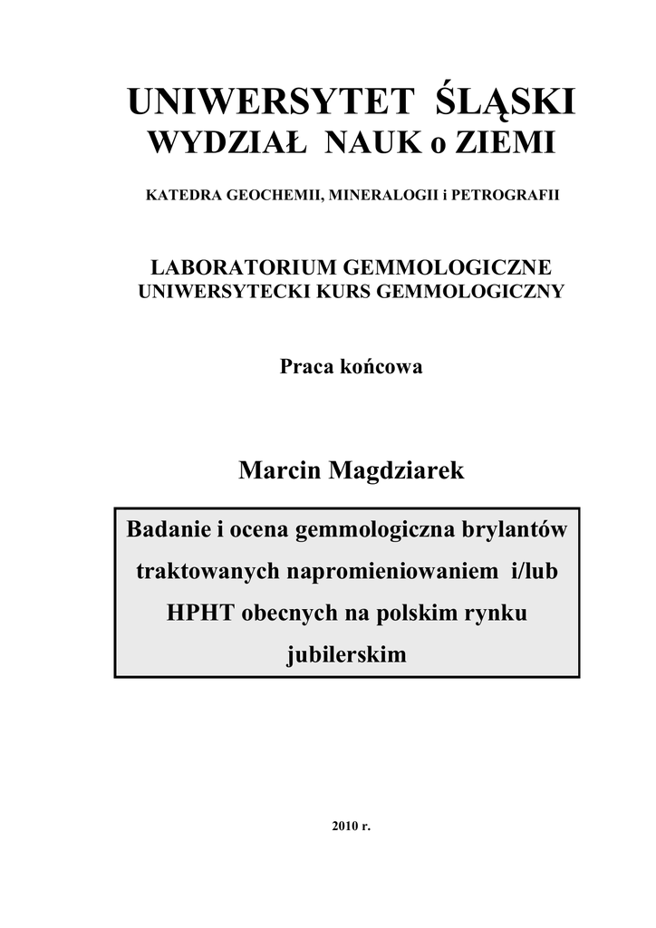 UNIWERSYTET ŚLĄSKI WYDZIAŁ NAUK o ZIEMI KATEDRA GEOCHEMII, MINERALOGII i PETROGRAFII LABORATORIUM GEMMOLOGICZNE UNIWERSYTECKI KURS GEMMOLOGICZNY Praca końcowa Marcin Magdziarek Badanie i ocena gemmologiczna brylantów traktowanych napromieniowaniem i/lub HPHT obecnych na polskim rynku jubilerskim 2010 r. Opiekun pracy: dr Włodzimierz Łapot 2 Serdeczne podziękowania dla dr Włodzimierza Łapota za przekazanie ogromu wiedzy i wprowadzenie w kolejny, laboratoryjny rozdział przygody z kamieniami jubilerskimi 3 SPIS TREŚCI 1. Wstęp 2. Diament 2.1. Pochodzenie 2.2. Właściwości 2.2.1. Właściwości chemiczne i fizyczne 2.2.2. Właściwości optyczne 2.2.3. Barwa 2.2.4. Czystość 2.3. Typy (klasyfikacja) 2.4. Metody traktowania 2.4.1. Yehuda 2.4.2. Laserowanie 2.4.3. Powlekanie 2.4.4. Napromieniowanie 2.4.5. HPHT 2.4.6. LPHT 3. Metodyka badania diamentów traktowanych 3.1. Metody podstawowe 3.2. Metody laboratoryjne 3.2.1. DiamondView 3.2.2. Fotoluminescencja i Raman/Fotoluminescencja 3.2.3. Spektroskopia UV-VIS-NIR 3.2.4. Spektroskopia FTIR 4. Badania grupy brylantów napromieniowanych i traktowanych HPHT 4.1. Charakterystyka brylantów wytypowanych do badań 4.2. Uzasadnienie wyboru metod badania 4.3. Wyniki badań 5. Wnioski 6. Bibliografia 4 1. Wstęp Działania prowadzące do zwiększenia atrakcyjności wizualnej diamentów podejmowane były od dawien dawna. Już w XVII wieku znane były techniki polegające na nakładaniu warstwy odblaskowej na tylną część kamienia mającej na celu uzyskanie większego zwrotu światła. Pierwsze skuteczne próby zmiany barwy diamentu przeprowadził w celach naukowych w 1904 r. Anglik sir William Crookes, wykorzystując silne promieniowanie radu (bromek radu). Współcześne metody poprawiania diamentów mają na celu polepszenie barwy, polepszenie czystości i powiększenie masy. Pojawianie się coraz to nowych technik poprawiania, zwłaszcza barwy i czystości, zmusza do szukania coraz to nowych metod analizy i oceny tych modyfikacji. Jedną z najskuteczniejszych sposobów modyfikacji barwy brylantów jest poddanie ich napromieniowaniu i/lub działaniu wysokich ciśnień i wysokich temperatur (High Pressure/High Temperature - HPHT). Pierwsze poprawione w ten sposób diamenty pojawiły się już w latach 70-tych minionego wieku za sprawą laboratoriów General Electric i De Beers. Były to jednak tylko diamenty eksperymentalne. Masowe pojawienie się na rynku poprawionych tak diamentów miało miejsce dopiero na przełomie minionego i ostatniego dziesięciolecia, a wprowadzenie ich do sprzedaży spowodowało spore zamieszanie na światowym rynku brylantów oraz przyczyniło się do powstania wielu problemów, szczególnie w zakresie ich identyfikacji i oceny handlowej. Nawet prestiżowe laboratoria gemmologiczne, jak np. Amerykański Instytut Gemmologiczny (GIA), nie potrafiły początkowo odróżniać ich od diamentów niepoprawianych. Jednak sytuację dość szybko opanowano. Współczesna wiedza i dostępna na rynku aparatura badawcza potrafią już sobie dobrze radzić z identyfikacją tego typu obiektów gemmologicznych. Identyfikacja ta jest możliwa jednak tylko w odpowiednio wyposażonych laboratoriach gemmologicznych dysponujących wysoko wykwalifikowanym personelem. 5 2. Diament 2.1. Pochodzenie Współczesne badania pozwalają wnioskować, że diamenty wykrystalizowały w przedziale 990-4250 mln lat temu z alkalicznej magmy maficznej w skałach płaszcza ziemskiego na głębokościach powyżej 120-150 km, w temperaturze powyżej 1000oC, przy ciśnieniu 4,5 – 6,0 GPa. Na powierzchnię ziemi wynoszone były głównie mechanizmem wulkanizmu kimberlitowego. Najstarsze kominy kimberlitowe mają ponad miliard lat (Afryka Południowa), najmłodsze - odkryte w zachodniej Australii - „tylko” 22 miliony lat. Współczesna wiedza nie zna naturalnych diamentów młodszych od około 0,5 miliarda lat. Najstarsze diamenty, w postaci wrostków w cyrkonach, odkryto w północno-zachodniej Australii. Są one wieku 4,25 miliarda lat. Sądzi się, że źródłem węgla dla powstania diamentu jak i innych odmian alotropowych tego pierwiastka były skały węglanowe dostające się do głębszych partii geosfery poprzez strefy subdukcji. Do strefy przypowierzchniowej, gdzie współcześnie są przedmiotem eksploracji w tak zwanych złożach pierwotnych, diamenty zostały przetransportowane w czasie gwałtownego wznoszenia się magmy w bardzo krótkim czasie co zdecydowało o trwaniu ich w stanie metastabilnym. Dowodów na to dostarcza badanie inkluzji w diamentach. Nie są one składem tożsame ze składem skał osłony, a ich wiek jest dużo starszy od ich współczesnego otoczenia. Złoża diamentów można podzielić na pierwotne i wtórne. Z kolei złoża pierwotne można podzielić, w zależności od charakteru skał tworzących diamentonośne stożki wulkaniczne na (fig.1): perydotytowe (kimberlitowe) eklogitowe lamproitowe. Kominy typu K1 (kimberlitowe) są najbardziej zasobne w diamenty i występują głównie w Afryce Południowej i Zachodniej, Ameryce Północnej i Południowej. Rosji, Chinach, a terenami perspektywicznymi są także Indie i Indonezja. Zawartość diamentów w kimberlitach waha się średnio od poniżej 0,2 ct/t do 4 ct/t. Najbogatsze kominy kimberlitowe zawierają do 5 ct diamentu w tonie a granica opłacalności wydobycia jest określona zawartością około 0,2 ct w tonie. Nazwa kimberlit pochodzi od miejscowości Kimberley w RPA. Jest to odmiana 6 perydotytu o charakterze alkalicznym w skład którego wchodzi flogopit, pirokseny rombowe, oliwiny, diopsyd chromowy, pirop chromowy, ilmenit, i inne. Kominy kimberlitowe mają strefową budowę pionową; w stropie występuje ziemia żółta, będąca skałą ilastą wzbogaconą w diamenty, powstałą w wyniku wietrzenia podścielającej ją ziemi niebieskiej – diamentonośnej brekcji perydotytowej. W dolnej partii komina kimberlitowego zalega niezmieniony kimberlit