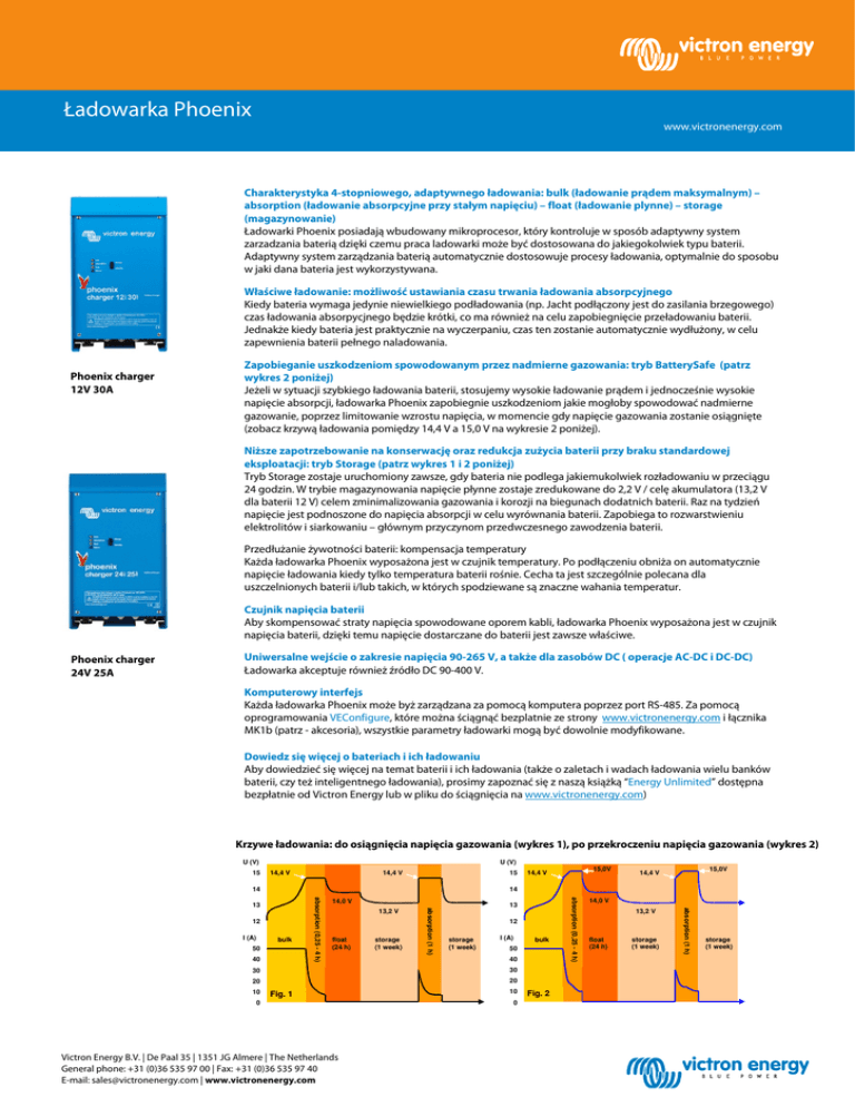 Ładowarka Phoenix www.victronenergy.com Charakterystyka 4-stopniowego, adaptywnego ładowania: bulk (ładowanie prądem maksymalnym) – absorption (ładowanie absorpcyjne przy stałym napięciu) – float (ładowanie plynne) – storage (magazynowanie) Ładowarki Phoenix posiadają wbudowany mikroprocesor, który kontroluje w sposób adaptywny system zarzadzania baterią dzięki czemu praca ladowarki może być dostosowana do jakiegokolwiek typu baterii. Adaptywny system zarządzania baterią automatycznie dostosowuje procesy ładowania, optymalnie do sposobu w jaki dana bateria jest wykorzystywana. Właściwe ładowanie: możliwość ustawiania czasu trwania ładowania absorpcyjnego Kiedy bateria wymaga jedynie niewielkiego podładowania (np. Jacht podłączony jest do zasilania brzegowego) czas ładowania absorpycjnego będzie krótki, co ma również na celu zapobiegnięcie przeładowaniu baterii. Jednakże kiedy bateria jest praktycznie na wyczerpaniu, czas ten zostanie automatycznie wydłużony, w celu zapewnienia baterii pełnego naladowania. Phoenix charger 12V 30A Zapobieganie uszkodzeniom spowodowanym przez nadmierne gazowania: tryb BatterySafe (patrz wykres 2 poniżej) Jeżeli w sytuacji szybkiego ładowania baterii, stosujemy wysokie ładowanie prądem i jednocześnie wysokie napięcie absorpcji, ładowarka Phoenix zapobiegnie uszkodzeniom jakie mogłoby spowodować nadmierne gazowanie, poprzez limitowanie wzrostu napięcia, w momencie gdy napięcie gazowania zostanie osiągnięte (zobacz krzywą ładowania pomiędzy 14,4 V a 15,0 V na wykresie 2 poniżej). Niższe zapotrzebowanie na konserwację oraz redukcja zużycia baterii przy braku standardowej eksploatacji: tryb Storage (patrz wykres 1 i 2 poniżej) Tryb Storage zostaje uruchomiony zawsze, gdy bateria nie podlega jakiemukolwiek rozładowaniu w przeciągu 24 godzin. W trybie magazynowania napięcie płynne zostaje zredukowane do 2,2 V / celę akumulatora (13,2 V dla baterii 12 V) celem zminimalizowania gazowania i korozji na biegunach dodatnich baterii. Raz na tydzień napięcie jest podnoszone do napięcia absorpcji w celu wyrównania baterii. Zapobiega to rozwarstwieniu elektrolitów i siarkowaniu – głównym przyczynom przedwczesnego zawodzenia baterii. Przedłużanie żywotności baterii: kompensacja temperatury Każda ładowarka Phoenix wyposażona jest w czujnik temperatury. Po podłączeniu obniża on automatycznie napięcie ładowania kiedy tylko temperatura baterii rośnie. Cecha ta jest szczególnie polecana dla uszczelnionych baterii i/lub takich, w których spodziewane są znaczne wahania temperatur. Czujnik napięcia baterii Aby skompensować straty napięcia spowodowane oporem kabli, ładowarka Phoenix wyposażona jest w czujnik napięcia baterii, dzięki temu napięcie dostarczane do baterii jest zawsze właściwe. Phoenix charger 24V 25A Uniwersalne wejście o zakresie napięcia 90-265 V, a także dla zasobów DC ( operacje AC-DC i DC-DC) Ładowarka akceptuje również źródło DC 90-400 V. Komputerowy interfejs Każda ładowarka Phoenix może byż zarządzana za pomocą komputera poprzez port RS-485. Za pomocą oprogramowania VEConfigure, które można ściągnąć bezplatnie ze strony www.victronenergy.com i łącznika MK1b (patrz - akcesoria), wszystkie parametry ładowarki mogą być dowolnie modyfikowane. Dowiedz się więcej o bateriach i ich ładowaniu Aby dowiedzieć się więcej na temat baterii i ich ładowania (także o zaletach i wadach ładowania wielu banków baterii, czy też inteligentnego ładowania), prosimy zapoznać się z naszą książką “Energy Unlimited” dostępna bezpłatnie od Victron Energy lub w pliku do ściągnięcia na www.victronenergy.com) Krzywe ładowania: do osiągnięcia napięcia gazowania (wykres 1), po przekroczeniu napięcia gazowania (wykres 2) U (V) 15 U (V) 14,4 V 14,4 V 15 14 float (24 h) storage (1 week) 13 12 storage (1 week) I (A) bulk 50 40 30 30 20 20 Fig. 1 0 Victron Energy B.V. | De Paal 35 | 1351 JG Almere | The Netherlands General phone: +31 (0)36 535 97 00 | Fax: +31 (0)36 535 97 40 E-mail: [email protected] | www.victronenergy.com 10 0 Fig. 2 14,0 V 13,2 V float (24 h) storage (1 week) absorption (1 h) 13,2 V absorption (0,25 - 4 h) 40 14,0 V absorption (1 h) bulk 50 absorption (0,25 - 4 h) 12 10 15,0V 14,4 V 14 13 I (A) 15,0V 14,4 V storage (1 week) Ładowarka Phoenix 12/30 12/50 IZakres napięcia na wejściu (V AC) 90-265 IZakres napięcia na wejściu (V AC) 90-400 Częstotliwość (Hz) 45-65 Czynnik mocy 24/16 24/25 1 Napięcie ładowania - absorpcja(V DC) 14,4 14,4 28,8 28,8 Napięcie ladowania – float (V DC) 13,8 13,8 27,6 27,6 Tryb magazynowania(V DC) 13,2 13,2 26,4 26,4 Prąd ładowania baterii głównej (A) (2) 30 50 16 25 Prąd ładowania baterii startowej (A) 4 4 4 4 100-200 100-400 Charakterystyka ładowania Adaptywne 4-stopniowe Pojemność baterii (Ah) 100-400 200-800 Czujnik temperatury √ √ √ √ Zastosowanie jako źródło zasilania √ √ √ √ Wymuszone chłodzenie √ √ √ √ Ochrona (1) a,b,c,d Praca w zakresie temperatur -20 to 60°C (0 - 140°F) Wilgotność (bez kondensacji) max 95% ZAŁĄCZNIKI Materiał i kolor aluminium (niebieski RAL 5012) Polączenie z baterią M6 Połączenie AC Zacisk śrubowy 4 mm² (AWG 6) Kategoria ochrony IP 21 Waga kg (funty) 3,8 (8) Wymiary (WxSZxG w mm i w calach) 350x200x108 mm (13.8x7.9x4.3 cala) STANDARDY Bezpieczeństwo EN 60335-1, EN 60335-2-29 Emisja EN 55014-1, EN 61000-3-2, Odporność EN 55014-2, EN 61000-3-3 Wibracje 1) Protection a) Przeciwzwarciowa b) Odwrotna polaryzacja baterii IEC68-2-6:10-150Hz/1.0G c) Zbyt wysokie napięcie baterii d) Zbyt wysoka temperatura 2) Aż do 40 °C (100 °F) otoczenia Alarm baterii Phoenix Charger Control Wizualizacja stanu baterii (stan niski lub wysoki) wraz z alarmem dźwiękowym. Panel PCC zapewnia kontrolę nad procesem ładowania Z ledową indykacją statusu tegoż procesu. Oferuje on Także możliwość dostosowania prądu 