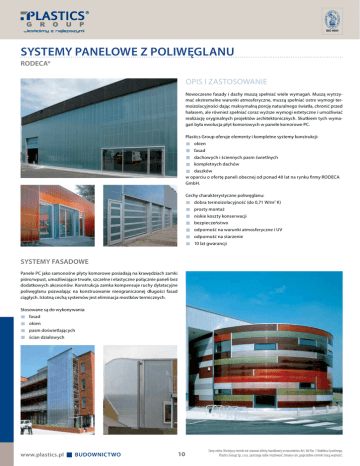 SYSTEMY PANELOWE Z POLIWĘGLANU RODECA® OPIS I ZASTOSOWANIE Nowoczesne fasady i dachy muszą spełniać wiele wymagań. Muszą wytrzymać ekstremalne warunki atmosferyczne, muszą spełniać ostre wymogi termoizolacyjności dając maksymalną porcję naturalnego światła, chronić przed hałasem, ale również spełniać coraz wyższe wymogi estetyczne i umożliwiać realizację oryginalnych projektów architektonicznych. Skutkiem tych wymagań była ewolucja płyt komorowych w panele komorowe PC. Plastics Group oferuje elementy i kompletne systemy konstrukcji: okien fasad dachowych i ściennych pasm świetlnych kompletnych dachów daszków w oparciu o ofertę paneli obecnej od ponad 40 lat na rynku firmy RODECA GmbH. Cechy charakterystyczne poliwęglanu: dobra termoizolacyjność (do 0,71 W/m2 K) prosty montaż niskie koszty konserwacji bezpieczeństwo odporność na warunki atmosferyczne i UV odporność na starzenie 10 lat gwarancji SYSTEMY FASADOWE Panele PC jako samonośne płyty komorowe posiadają na krawędziach zamki pióro/wpust, umożliwiające trwałe, szczelne i elastyczne połącznie paneli bez dodatkowych akcesoriów. Konstrukcja zamka kompensuje ruchy dylatacyjne poliwęglanu pozwalając na konstruowanie nieograniczonej długości fasad ciągłych. Istotną cechą systemów jest eliminacja mostków termicznych. Stosowane są do wykonywania: fasad okien pasm doświetlających ścian działowych www.plastics.pl BUDOWNICTWO 10 Ceny netto. Niniejszy cennik nie stanowi oferty handlowej w rozumieniu Art. 66 Par. 1 Kodeksu Cywilnego. Plastics Group Sp. z o.o. zastrzega sobie możliwość zmiany cen, poprzednie cenniki tracą ważność. SYSTEMY PANELOWE Z POLIWĘGLANU SKŁADOWANIE, OBRÓBKA, MONTAŻ Składowanie i obróbka jak dla płyt z poliwęglanu komorowego. MONTAŻ PANELI PIONOWYCH NA WPUST I PIÓRO - FASADY System montażu na pióro-wpust pozwala na tworzenie elewacji ciągłych bez używania profili łączących między pojedynczymi płytami. Możliwość produkcji paneli w dużych długościach, dopasowanych do projektu eliminuje konieczność używania poziomych profili łączących. Lekkość panelu komorowego pozwala nam budować struktury wielkopowierzchniowe ze zdecydowanie poprawioną estetyką i zredukowanym kosztem konstrukcji nośnej. Poprawie ulega również szczelność pokrycia i termoizolacyjność m. in. dzięki eliminacji mostków termicznych. Jedną z najważniejszych cech naszego systemu elewacji jest łatwość montażu.Dzięki lekkości każdej części oraz przejrzystości całego systemu, montaż okazuje się łatwy i szybki, dotyczy to zwłaszcza elewacji o dużej powierzchni. Dokumentacja techniczna dotycząca systemów panelowych i zasad montażu dostępna w oddziałach Plastics Group. 1 Profil ramowy górny 444040 2 Uszczelka wewnętrzna 902102 3 Uszczelka zewnętrzna 902101 Zasada montażu paneli na pióro-wpust z zastosowaniem kotwy ssącej Profil ramowy dolny 444041 Uzupełnieniem oferty są systemy okienne. Kilkanaście kombinacji schematu otwierania, sterowanie ręczne lub automatyczne. Niniejszy cennik nie stanowi oferty handlowej w rozumieniu Art. 66 Par. 1 Kodeksu Cywilnego. Ceny netto. Plastics Group Sp. z o.o. zastrzega sobie możliwość zmiany cen, poprzednie cenniki tracą ważność. 11 Doświetle z paneli 40 mm. System „ciepły” przekrój pionowy BUDOWNICTWO www.plastics.pl SYSTEMY PANELOWE Z POLIWĘGLANU CENNIK PANELE Z POLIWĘGLANU Aprobata Techniczna Długość paneli Rodeca: standard 6000 mm, na zamówienie od 1000 mm do 12000 mm Materiał dostępny na zamówienie (czas oczekiwania: 3 - 6 tygodni) AT-15-9095/2013 ASORTYMENT - PARAMETRY Typ paneli Systemy elewacyjne Szkic Grubość/szerokość krycia/ ilość ścian w przekroju [mm/mm/ilość] Ciężar [kg/m2] Wsp. przenikalności cieplnej [W/m2K]" Cena płyt bezbarwnych [PLN/m2]" PC 2333-16-4 16/333/4 2,40 2,10 99,60 PC 2333-20-4 20/333/4 2,60 2,00 106,90 PC 2530-4 30/500/4 3,60 1,40 147,60 PC 2540-4MC 40/500/4 4,00 1,30 164,00 PC 2540-10 40/500/10 4,40 0,99 176,40 PC 2540-7 40/500/7 4,30 1,00 176,40 PC 2550-10 50/500/10 5,00 0,80 205,00 PC 2560-12 60/500/12 5,50 0,71 240,00 Wybrane typy paneli posiadają klasyfikację NRO dla działania ognia od strony elewacji. Wybrane typy paneli posiadają klasyfikację B-s1, d0 wg EN13502-1:2007 - dopłata 10%. Dla wszystkich typów paneli możliwe wykończenie Heatblock, bi-color, no-drop. Wersja opal z dopłatą 5%. Dla określonych minimów ilościowych panele dostępne w kilkunastu kolorach. www.plastics.pl BUDOWNICTWO 12 Ceny netto. Niniejszy cennik nie stanowi oferty handlowej w rozumieniu Art. 66 Par. 1 Kodeksu Cywilnego. Plastics Group Sp. z o.o. zastrzega sobie możliwość zmiany cen, poprzednie cenniki tracą ważność. OSPRZĘT DO PANELI Z POLIWĘGLANU CENNIK PODSTAWOWE PROFILE SYSTEMÓW FASADOWYCH RODECA PC 2333-16-4 Panel 16 mm, 3-komorowy" PC 2333-20-4 Panel 20 mm, 3-komorowy Profil ramowy górny / boczny Przeznaczenie elementu Typ panelu PC 2530-4 Panel 30 mm, 3-komorowy 420040 z listwą 492002 461640 z listwą 492001 462040 z listwą 492001 420031 z listwą 492002 44,50 PLN/mb System standard System "ciepły" z eliminacją mostków termicznych 420040 z listwą 492001 444040 z listwą 492042/3 39,00 PLN/mb 420031 z listwą 492001 21,00 PLN/mb 25,00 PLN/mb 50,50 PLN/mb - - - - 63,00 PLN/mb - - 49404050 - - 5,35 PLN/szt. - - - - 93,00 PLN/mb 444041 z listwą 492042/3 112,00 PLN/mb 499080 Uszczelka wewnętrzna Kotwa montażowa Profil ramowy dolny z parapetem Profil ramowy dolny 28,50 PLN/mb PC 2540-4/6/7 Panel 40 mm, 3-, 5-, 6-komorowy 902902 (szara TPE) Uszczelka zewnętrzna 1,95 PLN/mb 902901 (szara TPE) 4,30 PLN/mb Powyższe akcesoria stanowią wąski fragment oferty Rodeca GmbH. Szeroka oferta obejmuje modyfikacje dostosowane do wysokości projektowanego przeszklenia i sposobu montażu do konstrukcji. Systemy obejmują również elementy wentylacyjne/dymowe w wielu wariantach uchylania wraz z opcjami sterowania aut