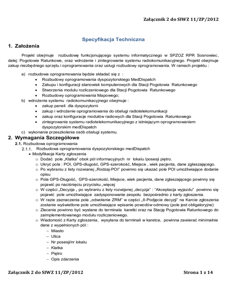 Załącznik 2 do SIWZ 11/ZP/2012 Specyfikacja Techniczna 1. Założenia Projekt obejmuje rozbudowę funkcjonującego systemu informatycznego w SPZOZ RPR Sosnowiec , dalej: Pogotowie Ratunkowe, oraz wdrożenie i zintegrowanie systemu radiokomunikacyjnego. Projekt obejmuje zakup niezbędnego sprzętu i oprogramowania oraz usługi rozbudowy oprogramowania. W ramach projektu : a) rozbudowa oprogramowania będzie składać się z : Rozbudowy oprogramowania dyspozytorskiego MedDispatch Zakupu i konfiguracji stanowisk komputerowych dla Stacji Pogotowia Ratunkowego Stworzenia modułu rozliczeniowego dla Stacji Pogotowia Ratunkowego Rozbudowy oprogramowania Mapowego; b) wdrożenie systemu radiokomunikacyjnego obejmuje : zakup paneli dla dyspozytorni zakup i wdrożenie oprogramowania do obsługi radiotelekomunikacji zakup oraz konfiguracje modułów radiowych dla Stacji Pogotowia Ratunkowego zintegrowanie systemu radiotelekomunikacyjnego z istniejącym oprogramowaniem dyspozytorskim medDispatch c) wykonanie przeszkolenia osób obsługi systemu. 2. Wymagania Szczegółowe 2.1. Rozbudowa oprogramowania 2.1.1. Rozbudowa oprogramowania dyspozytorskiego medDispatch Modyfikacja Karty zgłoszenia o Dodać pole „Klatka” obok pól informacyjnych nr lokalu /posesji piętro. o Ukryć pola : POI, GPS-długość, GPS-szerokość, Miejsce , wiek pacjenta, dane zgłaszającego. o Po wybraniu z listy rozwianej „Rodzaj-POI” powinno się ukazać pole POI umożliwiające dodanie opisu o Pola GPS-Długość, GPS-szerokość, Miejsce, wiek pacjenta, dane zgłaszającego powinny się pojawić po naciśnięciu przycisku „więcej o W części „Decyzja „ po wybraniu z listy rozwijanej „decyzja” : ”Akceptacja wyjazdu” powinno się pojawić pole umożliwiające zadysponowanie zespołu bezpośrednio z karty zgłoszenia. o W razie zaznaczenia pola „odwołanie ZRM” w części „II-Podjęcie decyzji” na Karcie zgłoszenia zostanie wyświetlone pole umożliwiające wpisanie powodów odmowy (pole jest obligatoryjne) o Zlecenie powinno być wysłane do terminala karetki oraz na Stację Pogotowia Ratunkowego do zaimplementowanego modułu rozliczeniowego. o Wiadomość z Karty zgłoszenia, wysyłana do terminali w karetce, powinna zawierać minimalnie dane z wypełnionych pól : Miasto Ulica Nr posesji/nr lokalu Klatka Piętro Opis zdarzenia Załącznik 2 do SIWZ 11/ZP/2012 Strona 1 z 14 Załącznik 2 do SIWZ 11/ZP/2012 Opis miejsca zdarzenia Dane pacjenta (imię i nazwisko) Telefon kontaktowy Uprawniony pracownik Pogotowia Ratunkowego powinien mieć możliwość dodania lub usunięcia pól z wiadomości wysyłanych do terminali . o Po zapisaniu zgłoszenia automatycznie powinno zostać wywołane połączenie z zadysponowanym zespołem na panelu dyspozytorskim do radiokomunikacji, ewentualna trwająca rozmowa powinna zostać zawieszona. Funkcja powinna mieć możliwość włączania i wyłączania przez administratora. W oknie głównym na zakładce Zdarzenia : Lista za kolumną „Miejsce” dodać kolumny „powód wezwania” oraz „zespół”, które będą pobierać dane z Karty zgłoszenia. Dodanie na końcu kolumny „potwierdzenie przyjęcia” do tabeli „zdarzenia” w oknie „Aktualne wyjazdy” Komórka będzie miała przypisany jeden ze stanów „potwierdzono” lub „nie potwierdzono” o Stan „potwierdzono” będzie mógł być ustawiony przy spełnieniu jednego z warunków: Potwierdzenie zostanie dokonane w module rozliczeniowym Stacji Pogotowia Ratunkowego za pomocą karty RFID Potwierdzenie zostanie włączone przez dyspozytora po odbyciu rozmowy telefonicznej, jeśli zespół był poza Stacją Pogotowia Ratunkowego i nie mógł potwierdzić przyjęcia kartą. o Niepotwierdzenie przez zespół lub dyspozytora w czasie 5 minut przyjęcia wyjazdu spowoduje włączenie lekkiego alarmu: zlecenie zapali się na czerwono oraz włączy się trzykrotny sygnał dźwiękowy na panelu dyspozytorskim. Po upływie kolejnych 10 minut uaktywni się twardy alarm: ciągły 3s sygnał alarmowy oraz zostanie wysłany mail do Kierownika Dyspozytorni. Moduł Administracyjny medDispatch o Powinien być stworzony w tej samej technologii opierający się o jedną bazę danych, wykorzystujący istniejący już system uprawnień o zostanie wyposażony w funkcję zarządzania kartami RFID o Dodawanie, usuwanie kart o Dodawanie, usuwanie kart do istniejących użytkowników systemu o Powinien umożliwić przeglądanie zdarzeń historycznych wraz z przypisanymi do zdarzenia wyjazdami. Po wybraniu zakładki „Monitoring Zdarzeń” otrzymujemy tabelę z listą zdarzeń „Monitoring Zdarzeń” będzie udostępniał dane : a) Uprawnieni użytkownicy będą mogli wybrać zdarzenie i zobaczyć szczegółowe dane w nim zawarte (wszystkie dane wpisane przez dyspozytora podczas przyjmowania zlecenia, uzupełnione czasy karetki wraz z danymi dotyczącymi realizacji zlecenia, oraz mapą przejazdu karetki). b) Dział techniczny karetek na liście będzie widział wszystkie wyjazdy karetek bez danych z kart zlecenia wyjazdu, na mapie będzie widoczna trasa przejazdu karetki z możliwością wyświetlenia takich informacji jak: prędkość w danym położeniu na mapie, czas wyjazdu, czas powrotu, długość trasy, spalanie. Logowanie do systemu medDispatch odbywać się będzie za pomocą karty RFID oraz indywidualnego Hasła. Załącznik 2 do SIWZ 11/ZP/2012 Strona 2 z 14 Załącznik 2 do SIWZ 11/ZP/2012 o Karta RFID będzie użytkowana w pierwszym etapie logowania do identyfikacji logującej się osoby (automatycznego wyboru nazwy użytkownika). o Hasło będzie wymagane do uwierzytelnienia osoby posiadającej kartę. o Po zbliżeniu karty do czytnika system powinien ją odczytać i wyświetlić okno logowania umożliwiające wpisanie hasła użytkownika przypisanego do karty, nazwa Użytkownika powinna być wyświetlona nad polem do wpisywania hasła. o Po prawidłowym zalogowaniu karta nie będzie musiała znajd