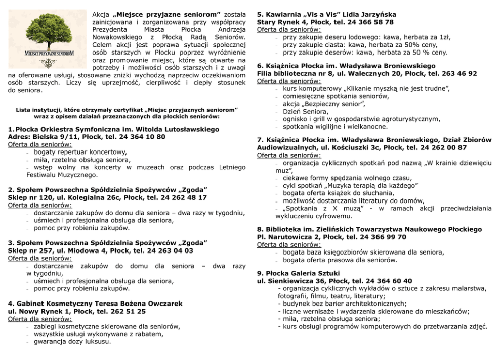 Akcja „Miejsce przyjazne seniorom” została zainicjowana i zorganizowana przy współpracy Prezydenta Miasta Płocka Andrzeja Nowakowskiego z Płocką Radą Seniorów. Celem akcji jest poprawa sytuacji społecznej osób starszych w Płocku poprzez wyróżnienie oraz promowanie miejsc, które są otwarte na potrzeby i możliwości osób starszych i z uwagi na oferowane usługi, stosowane zniżki wychodzą naprzeciw oczekiwaniom osób starszych. Liczy się uprzejmość, cierpliwość i ciepły stosunek do seniora. Lista instytucji, które otrzymały certyfikat „Miejsc przyjaznych seniorom” wraz z opisem działań przeznaczonych dla płockich seniorów: 1. Płocka Orkiestra Symfoniczna im. Witolda Lutosławskiego Adres: Bielska 9/11, Płock, tel. 24 364 10 80 Oferta dla seniorów: bogaty repertuar koncertowy, miła, rzetelna obsługa seniora, wstęp wolny na koncerty w muzeach oraz podczas Letniego Festiwalu Muzycznego. 2. Społem Powszechna Spółdzielnia Spożywców „Zgoda” Sklep nr 120, ul. Kolegialna 26c, Płock, tel. 24 262 48 17 Oferta dla seniorów: dostarczanie zakupów do domu dla seniora – dwa razy w tygodniu, uśmiech i profesjonalna obsługa dla seniora, pomoc przy robieniu zakupów. 3. Społem Powszechna Spółdzielnia Spożywców „Zgoda” Sklep nr 257, ul. Miodowa 4, Płock, tel. 24 263 04 03 Oferta dla seniorów: dostarczanie zakupów do domu dla seniora – dwa w tygodniu, uśmiech i profesjonalna obsługa dla seniora, pomoc przy robieniu zakupów. 4. Gabinet Kosmetyczny Teresa Bożena Owczarek ul. Nowy Rynek 1, Płock, tel. 262 51 25 Oferta dla seniorów: zabiegi kosmetyczne skierowane dla seniorów, wszystkie usługi wykonywane z rabatem, gwarancja dozy luksusu. razy 5. Kawiarnia „Vis a Vis” Lidia Jarzyńska Stary Rynek 4, Płock, tel. 24 366 58 78 Oferta dla seniorów: przy zakupie deseru lodowego: kawa, herbata za 1zł, przy zakupie ciasta: kawa, herbata za 50% ceny, przy zakupie deserów: kawa, herbata za 50 % ceny. 6. Książnica Płocka im. Władysława Broniewskiego Filia biblioteczna nr 8, ul. Walecznych 20, Płock, tel. 263 46 92 Oferta dla seniorów: kurs komputerowy „Klikanie myszką nie jest trudne”, comiesięczne spotkania seniorów, akcja „Bezpieczny senior”, Dzień Seniora, ognisko i grill w gospodarstwie agroturystycznym, spotkania wigilijne i wielkanocne. 7. Książnica Płocka im. Władysława Broniewskiego, Dział Zbiorów Audiowizualnych, ul. Kościuszki 3c, Płock, tel. 24 262 00 87 Oferta dla seniorów: organizacja cyklicznych spotkań pod nazwą „W krainie dziewięciu muz”, ciekawe formy spędzania wolnego czasu, cykl spotkań „Muzyka terapią dla każdego” bogata oferta książek do słuchania, możliwość dostarczania literatury do domów, „Spotkania z X muzą” - w ramach akcji przeciwdziałania wykluczeniu cyfrowemu. 8. Biblioteka im. Zielińskich Towarzystwa Naukowego Płockiego Pl. Narutowicza 2, Płock, tel. 24 366 99 70 Oferta dla seniorów: bogata baza księgozbiorów skierowana dla seniora, bogata oferta prasowa dla seniorów. 9. Płocka Galeria Sztuki ul. Sienkiewicza 36, Płock, tel. 24 364 60 40 - organizacja cyklicznych wykładów o sztuce z zakresu malarstwa, fotografii, filmu, teatru, literatury; - budynek bez barier architektonicznych; - liczne wernisaże i wydarzenia skierowane do mieszkańców; - miła, rzetelna obsługa seniora; - kurs obsługi programów komputerowych do przetwarzania zdjęć. 10. Zakład Ubezpieczeń Społecznych – Oddział w Płocku al. Stanisława Jachowicza 1, tel. 801 400 987, 22 560 16 00 Oferta dla seniorów: miła i profesjonalna obsługa dla seniora, budynek bez barier architektonicznych, organizacja „Dnia Seniora”. 11. Muzeum Mazowieckie ul. Tumska 8, Płock, tel. 24 364 70 71 Oferta dla seniorów: - audio-deskrypcja dla osób z dysfunkcjami wzroku, - windy przystosowane dla niepełnosprawnych, - budynek bez barier architektonicznych, - liczne wernisaże i wydarzenia skierowane dla seniorów. 12. Spółdzielczy Dom Kultury PSML-W ul. Krzywoustego 3, Płock, tel. 24 263 35 60 Oferta dla seniorów: wieczorki taneczne w każdy wtorek, zajęcia szachowe, rozgrywki brydżowe, zajęcia komputerowe – senior w zgodzie z elektroniką, zajęcia sportowe – postaw na zdrowie, kapele: „Stare Wiarusy”, „Malina Band”, chór „Serenada”, kabaret „Układ Koleżeński”, imprezy okolicznościowe. 13. Klub Osiedla Kochanowskiego PSML-W ul. Obrońców Westerplatte 6A, Płock, tel. 24 262 79 96 Oferta dla seniorów: wieczorki taneczne w każdą środę, rozgrywki brydżowe, gimnastyka poranna i popołudniowa dla pań, zajęcia manualne – kuźnia wyobraźni, imprezy okolicznościowe. 14. Klub Osiedla Łukasiewicza PSML-W ul. Łukasiewicza 28, Płock, tel. 24 263 94 12 Oferta dla seniorów: wieczorki taneczne w każdy czwartek, pracownia plastyczna dla seniorów, zajęcia ruchowe – rowerek i stepr, imprezy okolicznościowe. 15. Klub Osiedla Dworcowa PSML-W ul. Chopina 64A, Płock, tel. 24 262 72 08 Oferta dla seniorów: wieczorki taneczne w każdy poniedziałek, chór „Jesienny Promień”, kabaret „Z kapelusza” imprezy okolicznościowe. 16. PPHU Centrum Języków Obcych – YLC s.c. ul. Kościuszki 9, Płock, tel. 24 366 55 55 Oferta dla seniorów: kursy językowe skierowane swoją ofertą dla seniorów, profesjonalna nauka języków obcych - „Metoda Direct English”, herbata/kawa/ciastko dla słuchaczy, stała pomoc dydaktyczna. 17. Mazowiecka Spółdzielnia Mieszkaniowa „Klub Seniora” ul. Gierzyńskiego 17, Płock, tel. 24 263 60 70 Oferta dla seniorów: - spotkania integracyjne trzy razy w tygodniu: poniedziałek, wtorek, czwartek; - wieczorki taneczne w każdy wtorek; - gimnastyka korekcyjna dla Seniorów; - imprezy okolicznościowe. 18. Rodzinny Ogród Działkowy im. „Powstańców” ul. Szpitalna 7, 09-400 Płock Oferta dla seniorów: - letnie wczasy dla emerytów i rencistów; - organizacja w okresie letnim cyklicznych wieczorków tanec