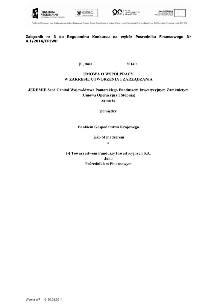 Załącznik nr 3 do Regulaminu Konkursu na wybór Pośrednika Finansowego Nr 4.1/2014/FPJWP [•], dnia ________________ 2014 r. UMOWA O WSPÓLPRACY W ZAKRESIE UTWORZENIA I ZARZĄDZANIA JEREMIE Seed Capital Województwa Pomorskiego Funduszem Inwestycyjnym Zamkniętym (Umowa Operacyjna I Stopnia) zawarta pomiędzy Bankiem Gospodarstwa Krajowego jako Menadżerem a [•] Towarzystwem Funduszy Inwestycyjnych S.A. Jako Pośrednikiem Finansowym Wersja WP_1.0_20.03.2014 Niniejsza umowa o utworzenie i zarządzanie funduszem inwestycyjnym zamkniętym (dalej zwana „Umową”) została zawarta w [••], w dniu [••] 2014 r. pomiędzy: Bankiem Gospodarstwa Krajowego w Warszawie, z siedzibą w Warszawie, Al. Jerozolimskie 7, 00-955 Warszawa, działającym na podstawie ustawy z dnia 14 marca 2003 r. o Banku Gospodarstwa Krajowego (Dz. U. Nr 65, poz. 594, z późn. zm.) oraz Statutu Banku Gospodarstwa Krajowego, nadanego rozporządzeniem Ministra Skarbu Państwa z dnia 11 maja 2010 r. (Dz. U. Nr 81, poz. 535), o numerze identyfikacji podatkowej NIP 525-00-12-372 i numerze REGON 000017319, reprezentowanym przez: 1. [•] – [•]; oraz 2. [•] – [•]; na podstawie [udzielonych pełnomocnictw] załączonych do niniejszej Umowy; zwanym dalej „Menadżerem Funduszu Powierniczego" lub „Menadżerem”, a [•] Towarzystwem Funduszy Inwestycyjnych S.A. z siedzibą w [•], ul. [•], kod pocztowy [•], wpisanym do rejestru przedsiębiorców prowadzonego przez Sąd [•], [•] Wydział Gospodarczy Krajowego Rejestru Sądowego, pod numerem KRS: [•], NIP [•], REGON [•], wysokość kapitału zakładowego: [•] złotych, opłacony w całości reprezentowaną przez: 1) [•] – [•] oraz 2. [•] – [•]; na podstawie [odpisu z KRS wygenerowanego na dzień zawarcia niniejszej Umowy], załączonego do niniejszej Umowy; zwanym dalej „Pośrednikiem Finansowym” lub „Towarzystwem”; zwanymi dalej łącznie „Stronami”, a każdy z osobna „Stroną”; o następującej treści: Wersja WP_1.0_20.03.2014 2 PREAMBUŁA Zważywszy w szczególności, że: (A) Inicjatywa Wspólne Europejskie Zasoby dla Mikro, Małych i Średnich Przedsiębiorstw – JEREMIE (Joint European Resources for Micro to Medium Enterprises) (zwana dalej „JEREMIE”) została opracowana jako jeden z instrumentów wykorzystywania środków w ramach Europejskiego Funduszu Rozwoju Regionalnego wspólnie przez Komisję Europejską i Europejski Fundusz Inwestycyjny, w celu finansowania wydatków na operacje obejmujące zwrotne wkłady we wsparcie instrumentów inżynierii finansowej, między innymi takich jak instrumenty mikrofinansowania, instrumenty poręczeniowe, instrumenty kapitału ryzyka dla mikro, małych i średnich przedsiębiorstw, dzięki którym środki do wykorzystania w ramach inicjatywy JEREMIE mają zostać udostępnione i wykorzystane zgodnie z art. 44 Rozporządzenia Rady (WE) nr 1083/2006 z dnia 11 lipca 2006 r., ustanawiające przepisy ogólne dotyczące Europejskiego Funduszu Rozwoju Regionalnego, Europejskiego Funduszu Społecznego oraz Funduszu Spójności i uchylające rozporządzenie (WE) 1260/1999 (Dz. U. UEL210zdnia 31 lipca 2006 r. z późń. zm.; zwane dalej „Rozporządzeniem Nr 1083/2006”) i Rozporządzeniem Komisji (WE) nr 1828/2006 z dnia 8 grudnia 2006 r. ustanawiające szczegółowe zasady wykonania rozporządzenia Rady (WE) nr 1083/2006, ustanawiającego przepisy ogólne, dotyczące Europejskiego Funduszu Rozwoju Regionalnego, Europejskiego Funduszu Społecznego oraz Funduszu Spójności oraz rozporządzenia (WE) 1080/2006 Parlamentu Europejskiego i Rady w sprawie Europejskiego Funduszu Rozwoju Regionalnego (Dz. U. UE L371/1 z dnia 27 grudnia 2006 r. z późń. zm.; zwane dalej „Rozporządzeniem Nr 1828/2006”). (B) JEREMIE to inicjatywa uruchomiona przez Komisję Europejską i prowadzona w województwie pomorskim wspólnie przez Instytucję Zarządzającą (jak zdefiniowano poniżej) i Menadżera, na podstawie regulacji dotyczących rozwoju regionalnego, w szczególności [•]. (C) W celu realizacji założeń Projektu (jak zdefiniowano poniżej) Strony dołożą wszelkich starań, aby zapewnić, że wszelkie Operacje (jak zdefiniowano poniżej) wspierające instrumenty inżynierii finansowej w województwie pomorskim będą podejmowane w kontekście inicjatywy JEREMIE zgodnie z Rozporządzeniem Nr 1083/2006, w szczególności zgodnie z art. 44 powyższego Rozporządzenia. (D) Niniejsza Umowa ma na celu poprawę dostępu mikro i małych przedsiębiorstw regionu województwa pomorskiego do zewnętrznych źródeł finansowania poprzez realizację Projektu. W wykonaniu niniejszej Umowy, zadaniem Pośrednika Finansowego jest udzielanie wsparcia MŚP (jak zdefiniowano poniżej) poprzez nabywanie i obejmowanie instrumentów udziałowych (akcje spółek akcyjnych i komandytowo- akcyjnych, udziały w spółkach z ograniczoną odpowiedzialnością) oraz dłużnych emitowanych przez MŚP ze środków pozyskanych w ramach emisji certyfikatów inwestycyjnych Funduszu skierowanych do Menadżera oraz Inwestorów Prywatnych (jak zdefiniowano poniżej). (E) Pośrednik Finansowy na podstawie zezwolenia Komisji Nadzoru Finansowego z dnia [•] roku nr [•] jest uprawniony do tworzenia i zarządzania funduszem inwestycyjnym zamkniętym. Pośrednik Finansowy posiada doświadczenie i wiedzę (i) w zakresie tworzenia funduszy inwestycyjnych, zgodnie z obowiązującymi w tym zakresie przepisami, a w szczególności przepisami ustawy z dnia 27 maja 2004 r. o funduszach inwestycyjnych (Dz. U. Nr 146 poz. 1546, ze zm.) oraz (ii) w zakresie zarządzania takimi funduszami, (F) Pośrednik Finansowy został wyłoniony w wyniku przeprowadzenia w dniach [•] konkursu nr [•], zgodnie z regulaminem konkursu „Wybór pośredników finansowych w ramach wsparcia z Funduszu Powierniczego Województwa Pomorskiego; produkt finansowy Fundusz Kapitałowy”, poprzez podjęcie decyzji o wyborze Pośrednika Finans