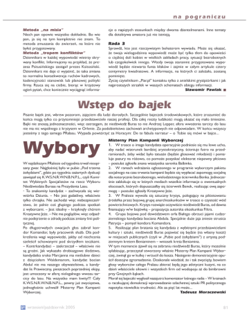 na pograniczu Metoda „na misia” 9TPNS [LY Z[ZbTP b^ed^_VZ OZVčLOYTP -Z bTP [LY UL ^Tí YL _dX VZX[WP_YTP YTP eYLX ?Z XP_ZOL eX`^eLYTL OZ ebTP]ePď YL V_Ç]P YTP MdčPĦ []edRZ_ZbLYd Metoda „tropem konfliktów” /eTPYYTVL]eb VLŇOPUbd[ZbTPOeTbTP_]ed^V]d bLYdVZYQWTV_4YQZ]X`UPXdYL[]edVčLOŇP[]P eP^L ;^T_`^Tď^VTPRZ eL^_Ù[Tč []PeP^ 6^T_Z^Tď^VT /eTPYYTVL]eYTPOLUPNTbdULĦYTÛŇP_LVLeXTLYL _Z YZ]XLWYL VZY^PVbPYNUL ]`NSÇb VLO]ZbdNS VLOPYNdUYZĦNT ^_LYZbT^V W`M [WLYZbPU [ZWT_dVT QT]Xd =e`NL ^Tí YL NTPMTP MTZ]ÙN b V]edŇZbd ZRTPď[d_LďNSNPVZYTPNeYTPbdNTÙRYÙÛTYQZ]XL NUP Z YL[Tí_dNS ^_Z^`YVLNS XTíOed ObZXL OŇPY_PWXPYLXT 4YYP _PXL_d OWL OP_PV_dbL LXL_Z]LU`Ň YTPT^_YTPUÙ Rada 3 >[]LbOŅ V_Z UP^_ ]ePNedbT^_dX MZSL_P]PX bdbTLO` 8ZŇP ^Tí ZVLeLÛ ŇP _bZUL bTPWZRZOeTYYL bd[ZbTPOŅ XZŇP MdÛ _dWVZ _čPX OZ Z[ZbTPĦNT Z NTíŇVTPU OZWT VZMTP_ b bTPWVTNS eLVčLOLNS []LNd ^d_`LNUT MPe]ZMZ_YdNS W`M NePRZVZWbTPV TYYPRZ B_POd _bZUL ^_L]LYYTP []edRZ_ZbLYL bd[Z bTPOŅ MíOeTP YTPbL]_L Q`Y_L VčLVÇb T eLUXTP b NLčdX L]_dV`WP Ne_P]d NPY_dXP_]d VbLO]L_ZbP , TYQZ]XLNUP YL V_Ç]dNS NT eLWPŇLčZ eZ^_LYÙ [ZXTYTí_P ņdNeíNed_PWYTVZXk;TL][WuVZY_LV_`_dWVZeLYTPW^VTXTR]deT[TÇ]VLXTTULV YLU[]Z^_^edNS ^_]eLčPVb bL^edNS ^NSPXL_LNSZMTPR`TYQZ]XLNUT Sławomir Pawlak Wstęp do bajek ;T^LYTP MLUPV UP^_ bM]Pb [ZeZ]ZX eLUíNTPX OWL W`OeT OZ]Z^čdNS >eNePRÇWYTP MLUPNePV Ħ]ZOZbT^VZbdNS V_Ç]P e]Ze`XTPÛ OZ VZďNL XZRÙ _dWVZ NZ []ed_ZXYTPU^T []ePO^_LbTNTPWP YL^ePU []ZQP^UT /WL NLčPU ]P^e_d W`OeVZĦNT XZRÙ ZVLeLÛ ^Tí XLčZ ĦXTP^eYP -LUVTYTPeYZ^eÙUPOYZeYLNeYZĦNTbTíNZ^_]ePRLXŇPYTPOŅbTPOŅ-`]L^_Z YTP ,YO]ePU 7P[[P] LQP]L bbZŇPYTL _L]NTNd OZ WL^` YTPXLYTNb^[ÇWYPRZeV]ded^PXb:]WPYTPEL[ZOZMTPď^_bZeLNSZbLďL]NSP_d[ZbdNSYTPZO[ZbTLOLXBVZďN`b^ed^Nd UP^_PĦXd e _PRZ^LXPRZ ;=LWL^` Bd[LOL [Zb_Ç]edÛ eL 3Z]LNdX% /P _P QLM`WL YL]]L_`] w Z ?ZMTP ^Tí XÇbT b MLUNP Wybory BYLUOeTV^edX;=LWP^TPZO_dRZOYTL_]bLčYTPZ[T ^LYdRbL]9LURčZĦYTPUMdčZb[`MTPk;ZO_]ePXL ŇZčíOeTLXTuROeTP[Z_dRZOYT`eLŇL]_dNSOd^V`^UT eLbTÙeLč^Tí6B>9=B9-9;7NedWT6ZXT _P_ BdMT_YdNS >[PNULWT^_Çb YL ]ePNe BdMZ]` 9TPOŅbTPOeTL-`]L^LYL;]PedOPY_L7L^` ?Z eYLVZXT_d VLYOdOL_ w eLNSbdNLčL ^Tí bTP bTÇ]VL /eT`YTL w 9TP UP^_ RLOL_WTbd bčLĦNTbTP _dWVZ NS]eÙVL 9TP eLNSZOeT bTíN YTPMPe[TPNePď ^_bZ ŇP [LWYTP NZĦ Rč`[TPRZ [ZONeL^ ^[Z_VLď e bdMZ]NLXT w 5P^_ TOPLWYd w V]edVYíčd NSÇ]PX 6]PL_dbYP5PŇPw9TPXL[ZRWÙOÇbbTíNZO[LO YTP[ZOPU]ePYTPZeO]LOí[ZONeL^eXTLYdWTYTT[ZWT _dNeYPU ;Z Oč`RZ_]bLčdNS ZbLNULNS RčZ^ eLM]Lč VZY OZ] 6ZXLYOZ] Mdčd []LNZbYTV ^č`ŇM /WL [ZO V]PĦWPYTL bLRT bd[ZbTPOeT ULVMd ZO YTPNSNPYTL ^ePWPĦNTč ^NSZbLYdXT [ZO ^V]edOčPX _PNeVLXT w 6ZY_]VLYOdOLNT w eL^V]ePNeLč w bčLĦNTbTP YTP ^Ù R]ZŅYT 5LV bdVLeLčZ O]ZMTLeRZbP ĦWPOe_bZ VLYOdOL_VL^]ZVL8L]NULYYLXLYTPĦW`MYPOeTPNT e OeTíNTZčPX BLWOPXL]PX VLYOdOL_ MZNTLY ,MO`W YTP XL YL^ePRZ ZMdbL_PW^_bL L VLYOd OL_WT^;]LbTPNeYd[TP^eNeZNS[Z[]ePOYTPUPVT[d UP^_`XZNeZYdb LQP]íYTPWPRLWYPRZbbZe`_L] NTNd OZ WL^` 9L b^ed^_VZ XLX VbT_d .Lčd 6B>9=B9-9;7[PbYdU`ŇebdNTí^_bL UPOYZRčZĦYTP `NSbLWTč 8T^_P]Yd ;WLY 6LX[LYTT BdMZ]NePU b]eP^TPď[LŅOeTP]YTV Misterny Plan Kampanii Wyborczej B_]Z^NPZTXLRPVLYOdOL_LZ[P]LNdUYTP[ZOYTP^TP^TíX`WPbP`NSZ LMd YLOLÛ bTeP]`YPV ML]OeTPU L]d^_ZV]L_dNeYd ĦNTPYT`UP Q`_]Z YL []ePO ]LXTZYLNS ŇPMd bTOLÛ MdčZ _L_`LŇP MíOeTP RčZ^ZbLÛ XčZOeTPŇ T [ZXL W`UP[Le`]dYL]ÇŇZbZNZ[ZXZŇP[Zed^VLÛPWPV_Z]L_YTP[PbYd[čNTZbZ w[Z^_`WL_eRčZ^TčLeYLYLbTeLŇd^_VL^L]PYVL-LWMTYVL B ]LXLNS bO]LŇLYTL ZRčZ^eZYPRZ b []ZR]LXTP bdMZ]NedX [LVTP_` ^ZNULWYPRZYLNeL^_]bLYTLVLX[LYTTMíOeTP^Tíbd[čLNLÛeL[ZXZRí^ZNULWYÙ OWLYZ_Z]dNeYTPMPe]ZMZ_YPRZbTPWZOeTP_YPRZĦNTP]bYTVL-PYVL5POYZNeP ĦYTPeLMWZV`UP^TíbWPĦYdNSXPOTLNSb^ePWVTPTYQZ]XLNUPZPbPY_`LWYdNS PV^NP^LNSV_Ç]dNSOZ[`^eNeLčMd^TíĦNTP]bYTV-PYPV]PLWTe`UÙNZbÙeL[Z XZRíw[Z^_`WL_eRčZ^Tčd6]PL_dbYP5PŇP B ;]LWP^TP bdbZčL ^Tí ^e_`NeYd V]ded^ [ZWPRLUÙNd YL [TVTP_ZbLYT` Ņ]ÇOPčVL[]ePeMZUZbÙR]`[íLYL]NSTZ^V`YV^Çbb_]Z^NPZNed^_ZĦÛbÇO [ZbTP]eNSYTZbdNS6]ded^]ZebTÙŇPZNedbTĦNTPYTPOŅbTPOŅ-`]L^ZOOLbYL QTYLY^`UÙNdbbMZUÇbVíw[]Z[ZedNULL`_Z]^VLPVZ^V`YV^L1TW_]L 2]`[L MZUZbL [ZO OZbÇOe_bPX Z]čL -TLčPRZ ZM]e`NT ULULXT N`OeZ eTPX^VTPRZVLYOdOL_LMZNTLYL,MO`WL>[PNULWYTPO`ŇPULULeYTP^TP^_]`^TNL ;L_]dNULw[ZXd^čVZYOZ]L6ZXLYOZ]L =PLWTe`UÙN [WLY M]L_LYTL ^Tí VLYOdOL_L e bdMT_YdXT []ePO^_LbTNTPWLXT V`W_`]d T ^e_`VT YTPOŅbTPOŅ -`]L^ [ZULbTLÛ ^Tí MíOeTP YL bčL^Yd VZ^e_ b XTPU^NLNS [`MWTNeYdNS NedWT b k;`MTP [ZO ŇZčíOeTLXTu e L]_d^_Ù [ZO eTPXYdXV]P_PX-PYTLXTYPXwbYTZ^PVV]P_L-PYTLXTYL B_dXXZXPYNTPeULbTč^TíYLePM]LYT`YTPOŅbTPOŅ-`]L^V_Ç]dXZeZWYTP ^dWLMTe`UÙN[]ePNed_Lč^_bZ]eZYdbčLĦYTP8T^_P]Yd;WLY6LX[LYTTBdMZ] NePUebTYÙčRZbV`WVíTb]e`NTčOZVZ^eL9L^_í[YTPOPXZY^_]LNdUYTPZ[` ĦNTčOZ^_ZUYPeR]ZXLOePYTP/Z^VZYLWPbTPOeTLčŇPT_LVebdNTíŇdMZbTPX RčZ^dbdMZ]NÇbNLčPRZ;]LWL^`eMTP]LÛMíOÙUPRZL_WP_dNeYTV`edYTYLNZ OeTPďbčLĦNTNTPWP^TčZbYTTb^ed^_VTNSQT]XZObZOZ[ZU`LŇOZMTXM]ZbYT []ed2YZUYdNSČÙVLNS 8Z]Lč_PUMLUPNeVTbdRčZ^TčYLeLU`_]eVZXPY_L_Z]WPĦYPRZ]LOTLwBV]LTYLNS Z]LNeV`UÙNPUOPXZV]LNUTb[]ZbLOeLYTP^eWLNSP_YPU^e_`VT;=[ZWT_dNeYPRZ YL[Z_dVLYTPbTPWVTP_]`OYZĦNT,WPeL[TíÛWL_XZŇP Tadeusz Moraczewski #