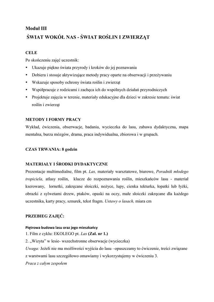 Moduł III ŚWIAT WOKÓŁ NAS - ŚWIAT ROŚLIN I ZWIERZĄT CELE Po skończeniu zajęć uczestnik: Ukazuje piękno świata przyrody i kroków do jej poznawania Dobiera i stosuje aktywizujące metody pracy oparte na obserwacji i przeżywaniu Wskazuje sposoby ochrony świata roślin i zwierząt Współpracuje z rodzicami i zachęca ich do wspólnych działań przyrodniczych Projektuje zajęcia w terenie, materiały edukacyjne dla dzieci w zakresie tematu: świat roślin i zwierząt METODY I FORMY PRACY Wykład, ćwiczenia, obserwacje, badania, wycieczka do lasu, zabawa dydaktyczna, mapa mentalna, burza mózgów, drama, praca indywidualna, zbiorowa i w grupach. CZAS TRWANIA: 8 godzin MATERIAŁY I ŚRODKI DYDAKTYCZNE Prezentacje multimedialne, film pt. Las, materiały warsztatowe, biurowe, Poradnik młodego tropiciela, atlasy roślin, klucze do rozpoznawania roślin, mieszkańców lasu - materiał kserowany, lornetki, zakręcane słoiczki, nożyce, lupy, cienka tekturka, łopatki lub łyżki, obrazki z sylwetami drzew, ptaków, opaski na oczy, małe słoiczki zakręcane dla każdego uczestnika, karty pracy, sznurek, tekst fragm. Ustawy o lasach, miara cm PRZEBIEG ZAJĘĆ: Piętrowa budowa lasu oraz jego mieszkańcy 1. Film z cyklu: EKOLEGO pt. Las (Zał. nr 1.) 2. „Wizyta” w lesie- wszechstronne obserwacje (wycieczka) Uwaga: Jeżeli nie ma możliwości wyjścia do lasu –opuszczamy to ćwiczenie, treści związane z warstwami lasu szczegółowo omawiamy i wykorzystujemy w ćwiczeniu 3. Praca z całym zespołem Materiały: atlasy roślin, arkusze papieru, mazaki, klucze do rozpoznawania mieszkańców lasów a) wyróżnianie zasadniczych warstw lasu (warstwowa budowa lasu pozwala roślinom na optymalne wykorzystanie przestrzeni, światła, wody i gleby): - warstwa drzew – czyli drzewostan - warstwa krzewów- czyli podszyt - warstwa zbudowana z bylin, krzewinek - warstwa mchów i porostów b) rozpoznawanie i nazywanie poszczególnych roślin (wykorzystanie atlasów roślin, odwołanie się do filmu) 3. Praca w grupach 4-5 osobowych, zadanie: Las, to ogromny, wielopiętrowy dom Materiały: jak w poprzednim ćwiczeniu, materiał kserowany- życie związane z drzewem – Ośrodek Edukacji Ekologicznej w Krakowie (Zał. nr 2.) - sporządzenie schematu warstwowej budowy lasu - przypisanie mieszkańców poszczególnym warstwom - prezentacja i omówienie 4. Praca w grupach( podczas wycieczki w lesie lub próbki pobrane z rejonu miejsca zajęć) ćwiczenie: Świat pod naszymi stopami Materiały : nożyce, cienka tektura, łopatki, lupy, kartki do odnotowania spostrzeżeń - wycięcie z tektury 1 „stopy” - wyciętą „stopę” przykładamy do powierzchni gleby i pobieramy próbkę górnej warstwy gleby spod „stopy” - delikatnie rozdrabniamy pobrany materiał spod „stopy” - obserwacje przez lupę, odnotowywanie, wyszukanie w atlasach nazw żywych organizmów - omówienie. Kroki do poznawania świata roślin i zwierząt 1.Kroki do poznawania roślin (przykład poznawania drzew) (Zał. nr 3.) Praca w parach Materiały : plansze z sylwetami drzew i ich nazwy, kartki do zapisywani swoich spostrzeżeń, lupy Przebieg: - obserwacja wybranego drzewa z daleka (określanie wysokości, grubości pnia, kształtu korony, ustawienia gałęzi) - obserwacja drzewa z bliska (określanie koloru- szara, brązowa, biała itd.; faktury kory, powierzchni-gładka czy szorstka, twarda, łuskowata, błyszcząca, omszała, sucha, matowa, zimna, ciepła, wilgotna, śliska, itp.) - kalkowanie kory różnych drzew - obserwacja drzewa przez lupę (określanie wielkości i kształtu liścia – co przypomina, jaki w dotyku, jak wyrastają liście na gałęzi: przemiennie, naprzeciw siebie, w pęczkach; obserwacja blizny liściowej przez lupę-kropki, przecinki, kreski; obserwacja glonów, porostów itp Omówienie i podsumowanie wykonanego zadania. 2. Które to drzewo? Materiały: opaski na oczy Praca w parach, zadanie: odszukanie drzewa, do którego doprowadzona została osoba jedna przez drugą z pary z zawiązanymi oczami. Dokładnie „bada” drzewo przy którym stoi, stara się zapamiętać jak najwięcej cech charakterystycznych. Po „zbadaniu” zostaje krętymi drogami odprowadzona do punktu wyjścia. Po odwiązaniu oczu, rozgląda się i próbuje dotrzeć do swojego drzewa - zmiana zadań w parze - refleksje i podsumowanie 3. Praca w grupach 4-5 osobowych, zabawa dydaktyczna: Rozmowa z drzewem Materiały: notatnik, długopis Przebieg: Każda grupa wybiera jedno drzewo, z którym przeprowadzi wywiad, rozmowę, przygotuje opowiadanie. Przygotowuje tekst nie wymieniając nazwy tego drzewa. Może to być dialog, monolog, z którego dowiadujemy się pewnych informacji o danym drzewie. - prezentacja przez poszczególne grupy, pozostałe osoby odgadują nazwę drzewa - refleksje - podsumowanie 4. Kroki do poznawania zwierząt, nauka rozpoznawania śladów i tropów zwierząt - znajdowanie śladów bytowania zwierząt - rozpoznawanie właścicieli śladów Uwaga: Jeżeli nie ma możliwości bycia w lesie, więcej czasu poświęcamy na analizę Poradnika młodego tropiciela i budowanie przykładowych pytań do zajęć terenowych związanych z rozpoznawaniem śladów i tropów z wykorzystaniem Poradnika młodego tropiciela Praca w grupach 4-5 osobowych, zadanie z wykorzystaniem Poradnika młodego tropiciela, szukamy śladów mieszkańców lasu: Materiały: Poradnik młodego tropiciela, karty do odnotowania spostrzeżeń Przykładowe pytania: (Zał. nr 4.) - jaki kształt ma trop? - czy należy do ssaka kopytnego, drapieżnego czy gryzonia?, - czy jest to trop zwierzęcia młodego czy dorosłego? Prezentacja Podsumowanie zadania: omówienie 5. Obserwacja sylwet ptaka i ich cech charakterystycznych Materiały: plansze z sylwetami ptaków i ich nazwami, atlasy ptaków, kartki/notesy , ołówki - obserwacje - notowanie (schemat) - odszukiwanie w atlasach - prezentacja i omówienie. 6. Praca w grupach 4-5 osobowych, za