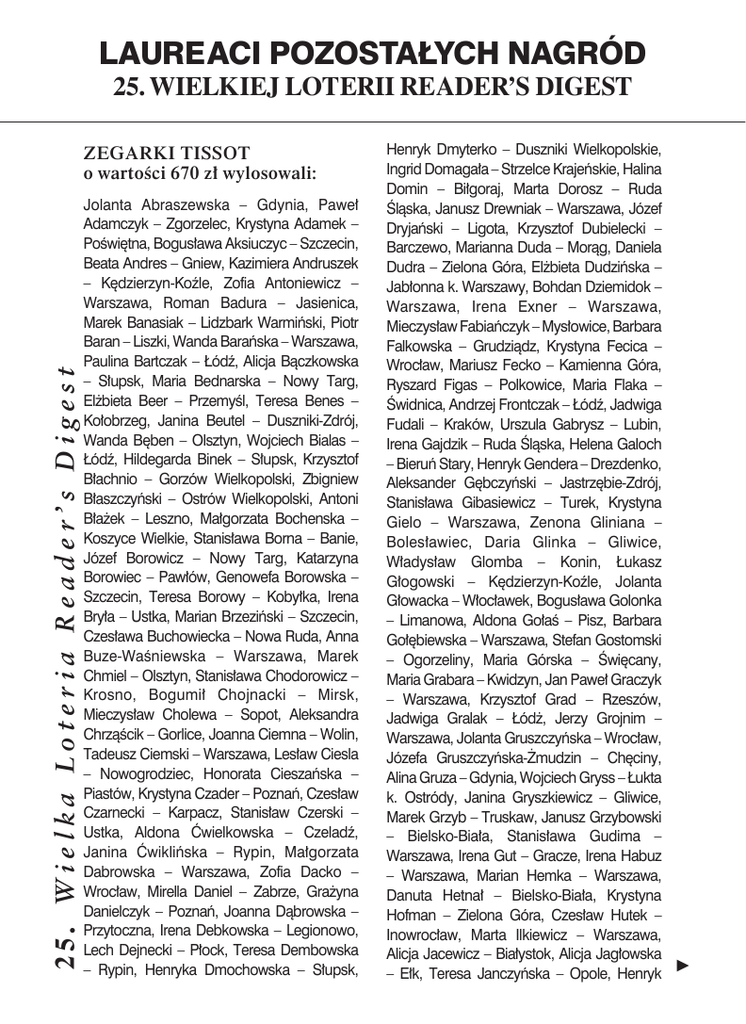 LAUREACI POZOSTAŁYCH NAGRÓD 25. WIELKIEJ LOTERII READER’S DIGEST ZEGARKI TISSOT o wartości 670 zł wylosowali: 25. W i e l k a L o t e r i a R e a d e r ’ s D i g e s t Jolanta Abraszewska – Gdynia, Paweł Adamczyk – Zgorzelec, Krystyna Adamek – Poświętna, Bogusława Aksiuczyc – Szczecin, Beata Andres – Gniew, Kazimiera Andruszek – Kędzierzyn-Koźle, Zofia Antoniewicz – Warszawa, Roman Badura – Jasienica, Marek Banasiak – Lidzbark Warmiński, Piotr Baran – Liszki, Wanda Barańska – Warszawa, Paulina Bartczak – Łódź, Alicja Bączkowska – Słupsk, Maria Bednarska – Nowy Targ, Elżbieta Beer – Przemyśl, Teresa Benes – Kołobrzeg, Janina Beutel – Duszniki-Zdrój, Wanda Bęben – Olsztyn, Wojciech Bialas – Łódź, Hildegarda Binek – Słupsk, Krzysztof Błachnio – Gorzów Wielkopolski, Zbigniew Błaszczyński – Ostrów Wielkopolski, Antoni Błażek – Leszno, Małgorzata Bochenska – Koszyce Wielkie, Stanisława Borna – Banie, Józef Borowicz – Nowy Targ, Katarzyna Borowiec – Pawłów, Genowefa Borowska – Szczecin, Teresa Borowy – Kobyłka, Irena Bryła – Ustka, Marian Brzeziński – Szczecin, Czesława Buchowiecka – Nowa Ruda, Anna Buze-Waśniewska – Warszawa, Marek Chmiel – Olsztyn, Stanisława Chodorowicz – Krosno, Bogumił Chojnacki – Mirsk, Mieczysław Cholewa – Sopot, Aleksandra Chrząścik – Gorlice, Joanna Ciemna – Wolin, Tadeusz Ciemski – Warszawa, Lesław Ciesla – Nowogrodziec, Honorata Cieszańska – Piastów, Krystyna Czader – Poznań, Czesław Czarnecki – Karpacz, Stanisław Czerski – Ustka, Aldona Ćwielkowska – Czeladź, Janina Ćwiklińska – Rypin, Małgorzata Dabrowska – Warszawa, Zofia Dacko – Wrocław, Mirella Daniel – Zabrze, Grażyna Danielczyk – Poznań, Joanna Dąbrowska – Przytoczna, Irena Debkowska – Legionowo, Lech Dejnecki – Płock, Teresa Dembowska – Rypin, Henryka Dmochowska – Słupsk, Henryk Dmyterko – Duszniki Wielkopolskie, Ingrid Domagała – Strzelce Krajeńskie, Halina Domin – Biłgoraj, Marta Dorosz – Ruda Śląska, Janusz Drewniak – Warszawa, Józef Dryjański – Ligota, Krzysztof Dubielecki – Barczewo, Marianna Duda – Morąg, Daniela Dudra – Zielona Góra, Elżbieta Dudzińska – Jabłonna k. Warszawy, Bohdan Dziemidok – Warszawa, Irena Exner – Warszawa, Mieczysław Fabiańczyk – Mysłowice, Barbara Falkowska – Grudziądz, Krystyna Fecica – Wrocław, Mariusz Fecko – Kamienna Góra, Ryszard Figas – Polkowice, Maria Flaka – Świdnica, Andrzej Frontczak – Łódź, Jadwiga Fudali – Kraków, Urszula Gabrysz – Lubin, Irena Gajdzik – Ruda Śląska, Helena Galoch – Bieruń Stary, Henryk Gendera – Drezdenko, Aleksander Gębczyński – Jastrzębie-Zdrój, Stanisława Gibasiewicz – Turek, Krystyna Gielo – Warszawa, Zenona Gliniana – Bolesławiec, Daria Glinka – Gliwice, Władysław Glomba – Konin, Łukasz Głogowski – Kędzierzyn-Koźle, Jolanta Głowacka – Włocławek, Bogusława Golonka – Limanowa, Aldona Gołaś – Pisz, Barbara Gołębiewska – Warszawa, Stefan Gostomski – Ogorzeliny, Maria Górska – Święcany, Maria Grabara – Kwidzyn, Jan Paweł Graczyk – Warszawa, Krzysztof Grad – Rzeszów, Jadwiga Gralak – Łódż, Jerzy Grojnim – Warszawa, Jolanta Gruszczyńska – Wrocław, Józefa Gruszczyńska-Żmudzin – Chęciny, Alina Gruza – Gdynia, Wojciech Gryss – Łukta k. Ostródy, Janina Gryszkiewicz – Gliwice, Marek Grzyb – Truskaw, Janusz Grzybowski – Bielsko-Biała, Stanisława Gudima – Warszawa, Irena Gut – Gracze, Irena Habuz – Warszawa, Marian Hemka – Warszawa, Danuta Hetnał – Bielsko-Biała, Krystyna Hofman – Zielona Góra, Czesław Hutek – Inowrocław, Marta Ilkiewicz – Warszawa, Alicja Jacewicz – Białystok, Alicja Jagłowska – Ełk, Teresa Janczyńska – Opole, Henryk V LAUREACI POZOSTAŁYCH NAGRÓD 25. WIELKIEJ LOTERII READER’S DIGEST 25. W i e l k a L o t e r i a R e a d e r ’ s D i g e s t Jankowski – Milanówek, Jerzy Januszewski – Sulejówek, Eugenia Jaraszek – Nysa, Maria Jaroszek – Gilowice, Zygmunt Jasieński – Wrocław, Łukasz Jasiński – Częstochowa, Krzysztof Jaworski – Żelistrzewo, Joanna Jażdżewska-Rurys – Tczew, Krzysztof Jedrzejczak – Warszawa, Janina Jeglorz – Świętochłowice, Katarzyna Jensz – Poznań, Krystyna Jędrzejczyk – Mrągowo, Jan Juchacz – Katowice, Krystyna Jurewicz – Giżycko, Zbigniew Kaczmarek – Brzeg, Tadeusz Kaklin – Wrocław, Grażyna Kaleta – Gdynia, Andrzej Kalinowski – Warszawa, Julian Kaliński – Białystok, Łukasz Kaliski – Kramsk, Maciej Kamiński – Gdańsk, Hanna Kantorska – Tułowice, Grażyna Kapuścińska – Gdynia, Krystyna Karankiewicz – Jugowice, Monika Karasińska – Górzyca, Zofia Karczewska – Strzegom, Cecylia Kargol – Siedlce, Anna Kasinska – Siedlce, Celina Kielak – Radzymin, Mirosława Kisiell – Łódź, Bogumiła Klich – Bielsko-Biała, Maria Klimek – Chorzów, Barbara Klimkowska – Radom, Piotr Kłosowski – Chełmno, Krystyna Knapek – Katowice, Maria Knapik – Wiele, Wiesława Koba – Kańczuga, Zdzisława Kobus – Polanica-Zdrój, Mirosław Kociemba – Zgierz, Irena Kociołek – Strzelce Wielkie, Marian Kocjan – Olkusz, Aneta Kocot – Piaseczno, Joanna Kocunek – Szczecin, Barbara Kolerska – Bydgoszcz, Józef Koleśnicki – Warszawa, Józefa Konatkowska – Końskie, Sonia Konieczna – Olsztyn, Teresa Kopa – Poznań, Józef Kosmala – Gliwice, Halina Kostrzewska – Elbląg, Maria Kościelska – Białogard, Teresa Kot – Piekoszów, Angelika Kotaba – Niepołomice, Mariusz Kotlarek – Poznań, Teresa Kowalczyk – Lublin, Jan Kowalkowski – Bydgoszcz, Jolanta Kowalska – Krasnosielc, Maria Kowalska – Bydgoszcz, Władysława Kozik – Podłęże, Małgorzata Kozłowska – Kielce, Waldemar Krauze – Warszawa, Jan Król – Warszawa, Regina Król – Bydgoszcz, Romuald