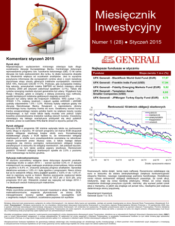 Miesięcznik Inwestycyjny Numer 1 (28) ● Styczeń 2015 Komentarz styczeń 2015 Rynek akcji Najważniejszym wydarzeniem minionego miesiąca była długo oczekiwana decyzja Europejskiego Banku Centralnego dotycząca wprowadzenia programu tzw. luzowania ilościowego (QE). O ile sama decyzja nie była zaskoczeniem dla rynku, to skala luzowania okazała się dwukrotnie większa od oczekiwań analityków. Jest to wyraźnie pozytywna informacja dla europejskich rynków akcji o czym świadczą styczniowe stopy zwrotu głównych indeksów europejskich: niemiecki DAX +9%, francuski CAC40 +7,7%. Podczas, gdy europejskie indeksy biją rekordy, amerykański indeks S&P500 od dwóch miesięcy utknął w okolicy 2000 pkt (styczeń zakończył spadkiem -3,1%). Także dla rynków emerging markets styczeń generalnie był udany. Wyjątkami były Rosja i Brazylia, gdzie w związku z dalszą przeceną ropy naftowej, spadki tamtejszych indeksów giełdowych sięgnęły ponad 6%. Styczeń był udany także dla krajowych indeksów. WIG zyskał 1,3%, WIG20 1,1%, indeksy średnich i małych spółek mWIG40 i sWIG80 zyskały odpowiednio 1,5% i 3,3%. Wzrosty byłyby większe gdyby nie decyzja Narodowego Banku Szwajcarii o zaprzestaniu obrony minimalnego kursu wymiany franka do euro. Gwałtowny wzrost kursu franka szwajcarskiego naraża polskie banki na większe koszty ryzyka kredytowego, a być może także będą musiały one pokryć część kosztów przewalutowania kredytów według starych kursów. Inwestorzy obawiający się takiego scenariusza pozbywali się akcji polskich banków, przez co subindeks WIG-Banki stracił w styczniu ponad 3%. Najlepsze fundusze w styczniu Fundusz Stopa zwrotu 1 m-c (%) UFK Generali - BlackRock World Gold Fund (EUR) 17,97 UFK Generali - Franklin India Fund (USD) 17,94 UFK Generali - Fidelity Emerging Markets Fund (EUR) 9,82 UFK Generali - Templeton Asian Smaller Companies (USD) 8,95 UFK Generali - JPMorgan Turkey Equity Fund (EUR) 8,75 Rynek obligacji Decyzja ECB o programie QE istotnie wpłynęła także na zachowanie rynku długu w styczniu. W ramach programu od marca ECB skupywał będzie obligacje skarbowe krajów strefy euro. Konsekwencją dodatkowego popytu z ECB będzie to, że rentowności obligacji skarbowych w strefie euro prawdopodobnie pozostaną na rekordowo niskich poziomach przez dłuższy czas, a także nastąpi dalsze zawężanie się różnicy pomiędzy rentownościami obligacji krajów peryferyjnych w stosunku do obligacji niemieckich. Jak pokazał styczeń, skorzystają na tym także polskie papiery skarbowe. Rentowność polskich 10-letnich obligacji skarbowych spadła do 2,0% z poziomu 2,5% notowanego na koniec grudnia. Sytuacja makroekonomiczna W styczniu poznaliśmy wstępne dane dotyczące dynamiki produktu krajowego brutto w całym 2014 r. - wzrost wyniósł 3,3% r/r. Z danych miesięcznych na uwagę zasługuje produkcja przemysłowa, która wrosła w grudniu o 8,4% r/r, znacznie powyżej prognoz analityków. Sprzedaż detaliczna wzrosła o 1,8% r/r i była zgodna z prognozami. Nieco niższy był za to wskaźnik inflacji, który pogłębił spadek z -0,6% r/r do -1,0% r/r. Jest to najniższy wynik w historii. Bardzo pozytywnie zaskoczył także wskaźnik PMI dla Polski, który wzrósł do 55.2 pkt z 52.8 pkt, przy prognozie 53.0 pkt. Wskaźnik znalazł się najwyżej od lutego 2014 r. i w okolicach swoich historycznych maksimów. Podsumowanie Wiele czynników przemawia na korzyść inwestycji w akcje. Dobre dane makroekonomiczne, wsparcie płynnościowe ze strony ECB, niewygórowane wyceny spółek giełdowych, szczególnie tych z segmentu małych i średnich, oczekiwana poprawa ich wyników Źródło: opracowanie własne finansowych, także dzięki taniej ropie naftowej. Dynamiczne osłabiające się euro w stosunku do dolara amerykańskiego zwiększa konkurencyjność eksportu Niemiec, naszego największego partnera handlowego. Dodatkowo coraz niższa rentowność obligacji skarbowych powoduje, że rynek akcji, relatywnie, staje się coraz bardziej atrakcyjny. Widać, że coraz więcej inwestorów dostrzega powyższe czynniki, niemniej aby wyrwać polski rynek akcji z marazmu, w jakim się znajduje od ponad roku, niezbędna jest większa determinacja strony popytowej. Departament Inwestycji Generali Życie T.U. S.A. Niniejszy dokument jest przeznaczony wyłącznie do celów informacyjnych i nie stanowi oferty kupna ani sprzedaży, zachęty ani porady inwestycyjnej ze strony Generali Życie Towarzystwo Ubezpieczeń S.A. (dalej „Towarzystwo”). Niniejsze opracowanie nie ma charakteru rekomendacji dotyczącej instrumentów finansowych w rozumieniu zapisów Rozporządzenia Ministra Finansów z 19 października 2005 roku w sprawie informacji stanowiących rekomendacje dotyczące instrumentów finansowych, ich emitentów lub wystawców. Wszystkie prezentowane opinie są opiniami własnymi Towarzystwa. Pomimo dołożenia należytej staranności przy sporządzaniu niniejszego dokumentu Towarzystwo nie może zapewnić, że prezentowane opinie okażą się trafne, a sytuacja na rynku nie ulegnie zmianie. Ubezpieczający musi liczyć się z możliwością utraty przynajmniej części wpłaconych lub zainwestowanych środków. Wszelkie szczegółowe zasady zawarcia i wykonywania poszczególnych umów ubezpieczenia oferowanych przez Towarzystwo, określone są w odpowiednich Ogólnych Warunkach Ubezpieczenia (dalej „OWU”) oraz w innych dokumentach związanych z umową ubezpieczenia. W zależności od umów zawartych z klientami Towarzystwa, w przypadku inwestowania środków (w tym także zmianą jego sposobów) Towarzystwo informuje, iż z tego tytułu mogą zostać pobrane opłaty m.in. wskazane w tabelach opłat i limitów stanowiących załącznik do OWU. Ubezpieczeniowe fundusze kapitałowe nie gwarantują realizacji założonego celu inwestycyjnego ani określonego wyniku inwestycyjnego, a Klient powinien mieć świadomość ryzyk związanych z inwes
