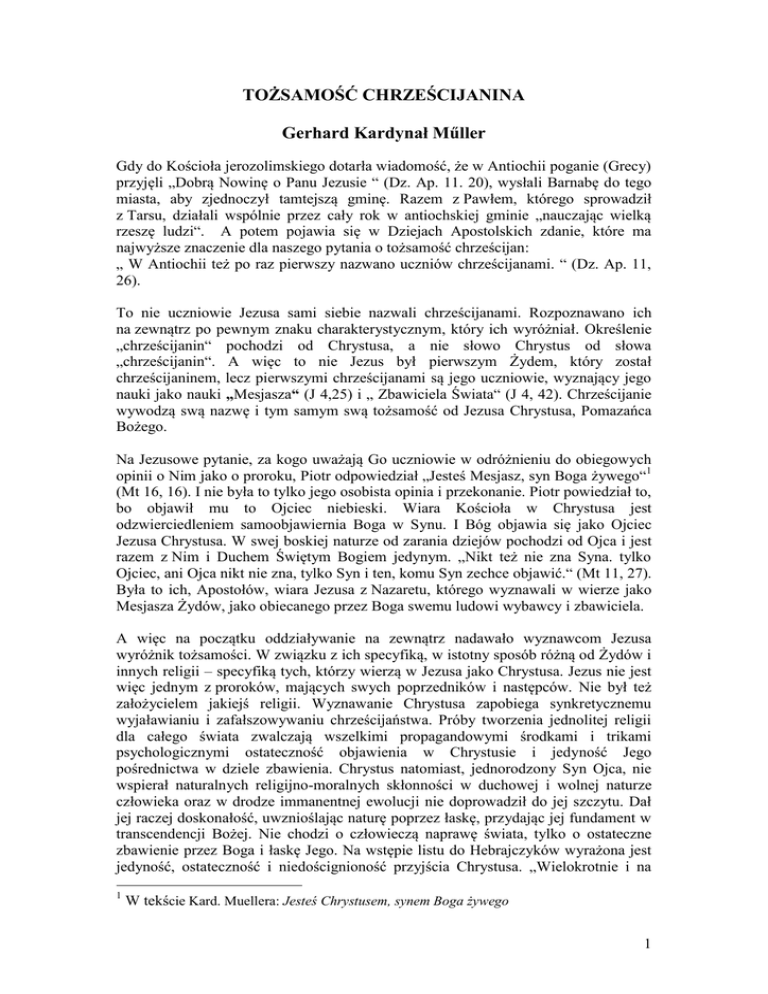 TOŻSAMOŚĆ CHRZEŚCIJANINA Gerhard Kardynał Műller Gdy do Kościoła jerozolimskiego dotarła wiadomość, że w Antiochii poganie (Grecy) przyjęli „Dobrą Nowinę o Panu Jezusie “ (Dz. Ap. 11. 20), wysłali Barnabę do tego miasta, aby zjednoczył tamtejszą gminę. Razem z Pawłem, którego sprowadził z Tarsu, działali wspólnie przez cały rok w antiochskiej gminie „nauczając wielką rzeszę ludzi“. A potem pojawia się w Dziejach Apostolskich zdanie, które ma najwyższe znaczenie dla naszego pytania o tożsamość chrześcijan: „ W Antiochii też po raz pierwszy nazwano uczniów chrześcijanami. “ (Dz. Ap. 11, 26). To nie uczniowie Jezusa sami siebie nazwali chrześcijanami. Rozpoznawano ich na zewnątrz po pewnym znaku charakterystycznym, który ich wyróżniał. Określenie „chrześcijanin“ pochodzi od Chrystusa, a nie słowo Chrystus od słowa „chrześcijanin“. A więc to nie Jezus był pierwszym Żydem, który został chrześcijaninem, lecz pierwszymi chrześcijanami są jego uczniowie, wyznający jego nauki jako nauki „Mesjasza“ (J 4,25) i „ Zbawiciela Świata“ (J 4, 42). Chrześcijanie wywodzą swą nazwę i tym samym swą tożsamość od Jezusa Chrystusa, Pomazańca Bożego. Na Jezusowe pytanie, za kogo uważają Go uczniowie w odróżnieniu do obiegowych opinii o Nim jako o proroku, Piotr odpowiedział „Jesteś Mesjasz, syn Boga żywego“1 (Mt 16, 16). I nie była to tylko jego osobista opinia i przekonanie. Piotr powiedział to, bo objawił mu to Ojciec niebieski. Wiara Kościoła w Chrystusa jest odzwierciedleniem samoobjawiernia Boga w Synu. I Bóg objawia się jako Ojciec Jezusa Chrystusa. W swej boskiej naturze od zarania dziejów pochodzi od Ojca i jest razem z Nim i Duchem Świętym Bogiem jedynym. „Nikt też nie zna Syna. tylko Ojciec, ani Ojca nikt nie zna, tylko Syn i ten, komu Syn zechce objawić.“ (Mt 11, 27). Była to ich, Apostołów, wiara Jezusa z Nazaretu, którego wyznawali w wierze jako Mesjasza Żydów, jako obiecanego przez Boga swemu ludowi wybawcy i zbawiciela. A więc na początku oddziaływanie na zewnątrz nadawało wyznawcom Jezusa wyróżnik tożsamości. W związku z ich specyfiką, w istotny sposób różną od Żydów i innych religii – specyfiką tych, którzy wierzą w Jezusa jako Chrystusa. Jezus nie jest więc jednym z proroków, mających swych poprzedników i następców. Nie był też założycielem jakiejś religii. Wyznawanie Chrystusa zapobiega synkretycznemu wyjaławianiu i zafałszowywaniu chrześcijaństwa. Próby tworzenia jednolitej religii dla całego świata zwalczają wszelkimi propagandowymi środkami i trikami psychologicznymi ostateczność objawienia w Chrystusie i jedyność Jego pośrednictwa w dziele zbawienia. Chrystus natomiast, jednorodzony Syn Ojca, nie wspierał naturalnych religijno-moralnych skłonności w duchowej i wolnej naturze człowieka oraz w drodze immanentnej ewolucji nie doprowadził do jej szczytu. Dał jej raczej doskonałość, uwznioślając naturę poprzez łaskę, przydając jej fundament w transcendencji Bożej. Nie chodzi o człowieczą naprawę świata, tylko o ostateczne zbawienie przez Boga i łaskę Jego. Na wstępie listu do Hebrajczyków wyrażona jest jedyność, ostateczność i niedoścignioność przyjścia Chrystusa. „Wielokrotnie i na 1 W tekście Kard. Muellera: Jesteś Chrystusem, synem Boga żywego 1 różne sposoby przemawiał niegdyś Bóg do ojców przez proroków, a w tych ostatecznych dniach przemówił do nas przez syna. Jego to ustanowił dziedzicem wszystkich rzeczy, przez niego też stworzył wszechświat. Ten [Syn], który jest odblaskiem Jego chwały i odbiciem Jego istoty“ (Hebr 1,1-3). „Anioł Pański“ zwiastował pasterzom na pastwiskach Betlejem „radość wielką, ,która będzie udziałem całego narodu: dziś w mieście Dawida narodził się wam Zbawiciel, którym jest Mesjasz, Pan“. (Lk 2,11), Tym samym wymienione zostały trzy istotne tytuły soteriologiczne. Jezus jest Zbawcą i Mesjaszem, albowiem jest Panem, a mianowicie Bogiem w jedności Syna z Ojcem w Duchu Świętym. Bycie chrześcijaninem nie polega jedynie na wewnętrznym przekonaniu, lecz także na świadectwie życia. „Bo sercem przyjęta wiara prowadzi do usprawiedliwienia, a wyznawanie jej ustami – do zbawienia.“ (Rz 10, 10). Dlatego wyznawanie Jezusa jednoczy jego wyznawców. Są wspólnotą w Chrystusie i podzielają to samo wyznanie wiary, tę samą liturgię i powszechną misję na całym świecie. Bycie chrześcijaninem jest z immanentnej konieczności katolickie. Kościół jest katolicki, albowiem jest świadectwem powszechnego zbawczego pośrednictwa Jezusa, urzeczywistniając je w swym nauczaniu, życiu i sakramentalnym wymiarze. W czwartym wieku Pacjan z Barcelony w liście swym przeciwko heretykom i schizmatykom swych czasów „Epistola ad Sempronianum de Catholico nomine“ konkretyzuje to: Christianus mihi nomen est, Catholicus vero cognomen (Nr 1). Zmysłowo i empirycznie dostępnym działaniom Kościoła odpowiada realno-duchowe oddziaływanie u Boga. Sakramenty bowiem określają świętą wspólnotę życia [obcowania] z Bogiem w Trójcy jedynym. Oznacza to tożsamość bycia chrześcijaninem we wspólnocie wiernych i spełnianiu misji, otrzymanej od Chrystusa. Chrześcijanin żyje we wspólnocie z Chrystusem i uczestniczy w Jego uniwersalnej misji Ojca dla zbawienia świata. Kościół to communio z Chrystusem i misja chrystusowa w świecie. II Sobór watykański tak oto rozpoczyna swą definicję Kościoła jako sakramentu zbawienia świata w Chrystusie: „Ponieważ Chrystus jest światłością narodów, obecny Sobór święty, w Duchu Świętym zgromadzony, pragnie gorąco oświecić wszystkich ludzi blaskiem Jego jaśniejącym na obliczu Kościoła, głosząc Ewangelię wszelkiemu stworzeniu (Lumen gentium 1). Psychologia mówi o tożsamości osoby, jeżeli ta pozostaje wierna sobie. W teologii chrześcijańskiej 