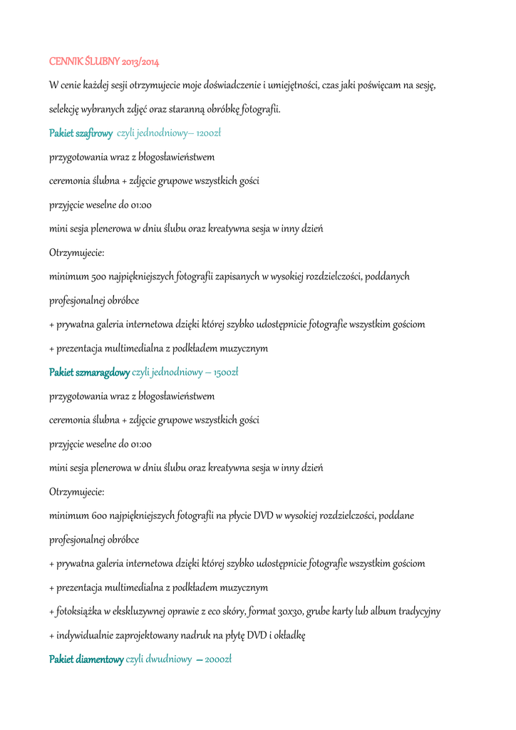 CENNIK ŚLUBNY 2013/2014 W cenie każdej sesji otrzymujecie moje doświadczenie i umiejętności, czas jaki poświęcam na sesję, selekcję wybranych zdjęć oraz staranną obróbkę fotografii. Pakiet szafirowy czyli jednodniowy– 1200zł przygotowania wraz z błogosławieństwem ceremonia ślubna + zdjęcie grupowe wszystkich gości przyjęcie weselne do 01:00 mini sesja plenerowa w dniu ślubu oraz kreatywna sesja w inny dzień Otrzymujecie: minimum 500 najpiękniejszych fotografii zapisanych w wysokiej rozdzielczości, poddanych profesjonalnej obróbce + prywatna galeria internetowa dzięki której szybko udostępnicie fotografie wszystkim gościom + prezentacja multimedialna z podkładem muzycznym Pakiet szmaragdowy czyli jednodniowy – 1500zł przygotowania wraz z błogosławieństwem ceremonia ślubna + zdjęcie grupowe wszystkich gości przyjęcie weselne do 01:00 mini sesja plenerowa w dniu ślubu oraz kreatywna sesja w inny dzień Otrzymujecie: minimum 600 najpiękniejszych fotografii na płycie DVD w wysokiej rozdzielczości, poddane profesjonalnej obróbce + prywatna galeria internetowa dzięki której szybko udostępnicie fotografie wszystkim gościom + prezentacja multimedialna z podkładem muzycznym + fotoksiążka w ekskluzywnej oprawie z eco skóry, format 30x30, grube karty lub album tradycyjny + indywidualnie zaprojektowany nadruk na płytę DVD i okładkę Pakiet diamentowy czyli dwudniowy – 2000zł przygotowania wraz z błogosławieństwem ceremonia ślubna + zdjęcie grupowe wszystkich gości przyjęcie weselne do 01:00 drugi dzień do 22.00 mini sesja plenerowa w dniu ślubu oraz kreatywna sesja w inny dzień Otrzymujecie: minimum 800 najpiękniejszych fotografii na płycie DVD w wysokiej rozdzielczości, poddane profesjonalnej obróbce +prywatna galeria internetowa dzięki której szybko udostępnicie fotografie wszystkim gościom +prezentacja multimedialna z podkładem muzycznym + fotoksiążka w ekskluzywnej oprawie z eco skóry, format 30x30, grube karty lub album tradycyjny + indywidualnie zaprojektowany nadruk na płytę DVD i okładkę Zachęcam do wybierania pleneru w inny dzień niż ślub, gdyż nie ma to wpływu na cenę usługi a jest gwarancją udanej sesji plenerowej i bezstresowego dnia ślubu. Pakiety są propozycją, więc jeśli chcecie coś dodać, zamienić lub z czegoś zrezygnować, jestem otwarta na propozycje i z przyjemnością dopasuję ofertę do Waszych potrzeb. Pakiet turkusowy Pakiet turkusowy dostępny od poniedziałku do piątku. Wyjątkowo w 2013 roku można skorzystać z tej opcji także w weekendy. przygotowania wraz z błogosławieństwem 200zł pierwsze 2h przyjęcia weselnego 200zł kreatywny plener fotograficzny 400zł ceremonia ślubna + zdjęcie grupowe wszystkich gości + życzenia 400zł przyjęcie weselne od początku do 01:00 500zł Ten pakiet przygotowałam z myślą o tych którzy nie planują "pełnego" przyjęcia a pragną mieć profesjonalne fotografie z ceremonii, przyjęcia weselnego czy pleneru. W tym pakiecie sami wybieracie co Was interesuje. Rozumiem że wybór fotografa nie jest prosty dlatego zachęcam do niezobowiązującego spotkania, gdzie przedstawię ofertę i będziemy mieli okazję się bliżej poznać :)