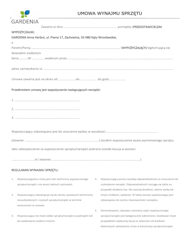 UMOWA WYNAJMU SPRZĘTU Zawarta w dniu .............................................................. pomiędzy (PRZEDSTAWICIELEM WYPOŻYCZALNI): GARDENIA Anna Herbut, ul. Piwna 17, Zachowice, 55-080 Kąty Wrocławskie, a Panem/Panią ……………………………………………………………………………………………….… (WYPOŻYCZAJĄCY) legitymującą się dowodem osobistym Seria…………Nr …………… wydanym przez ………………………………………………………………….……………………………………………..… adres zamieszkania ul. ……………………………………………………………………………………………………………..………..……………………… Umowa zawarta jest na okres od ………………….do…………………. do godz.……………….. Przedmiotem umowy jest wypożyczenie następujących narzędzi: 1. ………………………………………………………………………. 2. ………………………………………………………………………. 3. ………………………………………………………………………. Wypożyczający zobowiązany jest do uiszczenia wpłaty w wysokości ……………………………………………………….. (słownie: …………………………………………………………………………………) tytułem wypożyczenia wyżej wymienionego sprzętu. Jako zabezpieczenie za wypożyczenie sprzętu/narzędzi pobrana została kaucja w postaci: ……………….……….zł ( słownie:………………………………………………………………………………………………….) REGULAMIN WYNAJMU SPRZĘTU: 1. Wypożyczającemu znany jest stan techniczny wypożyczonego 4. sprzętu/narzędzi i nie wnosi żadnych zastrzeżeń. Wypożyczający ponosi wszelką odpowiedzialność za zniszczenie lub uszkodzenie narzędzi. Odpowiedzialność rozciąga się także na przypadki działania tzw. Siły wyższej (kradzież, zalanie wodą lub 2. Wypożyczający zobowiązuje się do zwrotu sprawnych technicznie, innym środkiem, spalenie). W takiej sytuacji wypożyczający jest nieuszkodzonych i czystych sprzętu/narzędzi w terminie zobowiązany do zwrotu równowartości narzędzia. oznaczonym w umowie. 5. 3. Demontowanie, naprawa i wymiana części wypożyczonego Wypożyczający nie może oddać sprzętu/narzędzi w podnajem lub sprzętu/narzędzi jest kategorycznie zabroniona i skutkować może do użytkowania osobom trzecim. przepadkiem wpłaconej kaucji w zależności od wielkości dokonanych samowolnie zmian w konstrukcji sprzętu/narzędzi. 6. W przypadku zwrotu sprzętu/narzędzi uszkodzonych na skutek 9. Za wypadki powstałe na skutek niewłaściwej eksploatacji, niewłaściwego użytkowania, zniszczonego lub niekompletnego, niezgodnej z przeznaczeniem sprzętu/narzędzi i na skutek braku wypożyczający jest uprawniony do zajęcia części zabezpieczenia umiejętności lub niesprawności wypożyczającego oraz na skutek równoważne poniesionej szkodzie lub żądania dopłaty. nie przestrzegania przepisów BHP oraz instrukcji użytkowania odpowiada wypożyczający. 7. Przekroczenie terminu oznaczonego w umowie powoduje naliczenie kary umownej, równej stawce za każdą godzinę (dobę) 10. Wypożyczający oświadcza, potwierdzając to własnoręcznym wypożyczenia powiększoną o 100% podpisem, iż znane mu są warunki niniejszej umowy oraz zasady eksploatacji sprzętu/narzędzi. 8. Wypożyczający pokrywa z własnych środków kosztów eksploatacjipaliwa, części eksploatacyjnych, oraz bieżących napraw związanych 11. Umowę sporządzono w dwóch jednobrzmiących egzemplarzach po z niewłaściwym użytkowaniem, oraz koszt transportu sprzętu. jednym dla stron. Dnia ……………………………… pobrano kwotę …………………………zł tytułem kaucji za wypożyczenie Dnia………………………………. zwrócono wypożyczającemu kwotę…………………….zł. z tytułu wcześniejszego pobrania kaucji. UWAGI: …………………………………………………………………………………………………………………………………………………………………………… …………………………………………………………………………………………………………………………………………………………………………… …………………………………………………………………………………………………………………………………………………………………………… WYPOŻYCZAJĄCY- KLIENT …………………………………………………………………. PRZEDSTAWICIEL WYPOŻYCZALNI ………………………………………………………………….