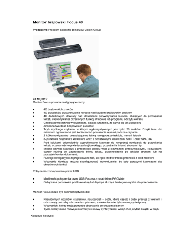 Monitor brajlowski Focus 40 Producent: Freedom Scientific Blind/Low Vision Group Co to jest? Monitor Focus posiada następujące cechy: 40 brajlowskich znaków 40 przycisków przywoływania kursora nad każdym brajlowskim znakiem 40 dodatkowych klawiszy nad klawiszami przywoływania kursora, służących do przewijania tekstu i wykonywania określonych funkcji Windows lub programu odczytu ekranu Gładka powierzchnia wyświetlacza, dająca wrażenie, że czyta się jak z papieru Zmienna twardość brajlowskich punktów Tryb szybkiego czytania, w którym wykorzystywanych jest tylko 20 znaków. Dzięki temu do minimum ograniczona jest konieczność poruszania rękami podczas czytania 2 kółka nawigacyjne pozwalające na łatwą nawigację po tekście, menu i listach 8-punktowa brajlowska klawiatura wraz z dodatkowymi klawiszami SHIFT oraz SPACJA Pod kciukami odpowiednio wyprofilowane klawisze do wygodnej nawigacji: do przewijania tekstu o zawartość wyświetlacza brajlowskiego, przewijania liniami, stronami itp. Można używać klawiszy z przedniego panelu wraz z klawiszami przesuwającymi, i klawiszami cursor routing do zaznaczania bloku tekstu, przechodzenia po tekście stronami lub na początek/koniec dokumentu Funkcje nawigacyjne zaprojektowane tak, że ręce rzadko trzeba przenosić z nad monitora Wszystkie klawisze można skonfigurować indywidualnie, by były gorącymi klawiszami dla określonych funkcji Połączenie z komputerem przez USB Możliwość połączenia przez USB Focusa z notatnikiem PACMate Odłączana podstawka pod klawiaturę lub laptopa służąca także jako rączka do przenoszenia Monitor Focus może być dobrodziejstwem dla: Niewidomych uczniów, studentów, nauczycieli – osób, które często i dużo pracują z tekstem i odczuwają potrzebę obcowania z pismem, a niekoniecznie tylko mową syntetyczną Wszystkich, którzy mają potrzebę obcowania ze słowem pisanym Tych, którzy mimo rozwoju informatyki i mowy syntetycznej, wciąż chcą czytać książki w brajlu Kluczowe korzyści: Umożliwia czytanie tekstów brajlem Zapewnia komfort pracy, szczególnie w zestawie z programem odczytu ekranu JAWS Daje komfort sprawowania pełnej kontroli nad redagowanym tekstem i pozwala na lepsze jego zrozumienie. Można sprawdzać tekst pod kątem poprawności ortograficznej oraz formatowania Daje możliwość podglądu pracy komputera, pozwala na szybką i łatwą orientację w położeniu i rodzaju kursora Jest niezastąpiony w pokazywaniu obcojęzycznych znaków, które nie są czytane przez syntezatory mowy Jest niezbędny dla poprawnego redagowania tekstów Zalety najnowszej wersji: Monitory Focus i BrailleMate mają tę unikalną cechę, że ich wyświetlacze brajlowskie mają gładką powierzchnię. Nie ma, jak w innych monitorach, wyczuwalnych przejść między sąsiednimi modułami brajlowskimi. Dzięki temu użytkownik ma wrażenie, jakby czytał informację wydrukowaną na papierze Za wyświetlaczem znajdują się dwa rzędy przycisków. Pierwszy rząd zawiera przyciski do przywoływania kursora, drugi zaś do przewijania tekstu oraz przyciski programowalne do wykonywania określonych funkcji Windows i programu odczytu ekranu Do przemieszczania się po tekście, menu oraz listach służą dwa pokrętła umieszczone po lewej i prawej stronie wyświetlacza, podobne do tych, jakie są zastosowane w komputerowej myszce. Kręcąc nimi, można przesuwać się po tekście o wiersz, zdanie albo akapit. Skok przesuwu ustawia się wciskając kółko Ponadto do dyspozycji jest brajlowska klawiatura do pisania i pracy ze screenreaderem i systemem Windows. Klawisze nie wystają ponad obudowę, dzięki czemu nie można ich przypadkowo wcisnąć. Klawiaturę można przykryć specjalną klapką, gdybyśmy nie chcieli jej w danej chwili używać Na przedniej ściance urządzenia umieszczone są kolejne klawisze funkcyjne, poprawiające komfort pracy z Windows i programem odczytu ekranu Monitory Focus mają bardzo ładną, solidną, plastikową obudowę Wszystkie wymienione cechy sprawiają, że Podczas pracy z monitorem nie ma potrzeby wielokrotnego przekładania dłoni z klawiatury brajlowskiej na klawiaturę komputera Focus zasilany jest z portu USB, bezpośrednio z komputera Specyfikacja techniczna: Monitor 40-znakowy: Maksymalne wymiary: 34,79 x 13,46 x 4,32 cm Waga: 1,19 kg Co w komplecie? monitor brajlowski Focus 40; składana podstawka pod klawiaturę; kabel USB; walizka; instrukcja obsługi w brajlu i czarnym druku; płyta CD z oprogramowaniem; karty gwarancyjne.