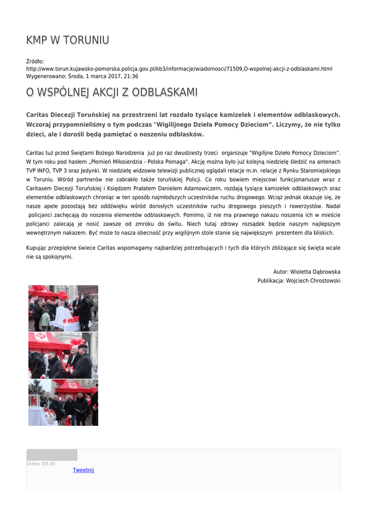 KMP W TORUNIU Źródło: http://www.torun.kujawsko-pomorska.policja.gov.pl/kb3/informacje/wiadomosci/71509,O-wspolnej-akcji-z-odblaskami.html Wygenerowano: Środa, 1 marca 2017, 21:36 O WSPÓLNEJ AKCJI Z ODBLASKAMI Caritas Diecezji Toruńskiej na przestrzeni lat rozdało tysiące kamizelek i elementów odblaskowych. Wczoraj przypomnieliśmy o tym podczas "Wigilijnego Dzieła Pomocy Dzieciom”. Liczymy, że nie tylko dzieci, ale i dorośli będą pamiętać o noszeniu odblasków. Caritas tuż przed Świętami Bożego Narodzenia już po raz dwudziesty trzeci organizuje "Wigilijne Dzieło Pomocy Dzieciom”. W tym roku pod hasłem „Płomień Miłosierdzia - Polska Pomaga". Akcję można było już kolejną niedzielę śledzić na antenach TVP INFO, TVP 3 oraz Jedynki. W niedzielę widzowie telewizji publicznej oglądali relacje m.in. relacje z Rynku Staromiejskiego w Toruniu. Wśród partnerów nie zabrakło także toruńskiej Policji. Co roku bowiem miejscowi funkcjonariusze wraz z Caritasem Diecezji Toruńskiej i Księdzem Prałatem Danielem Adamowiczem, rozdają tysiące kamizelek odblaskowych oraz elementów odblaskowych chroniąc w ten sposób najmłodszych uczestników ruchu drogowego. Wciąż jednak okazuje się, że nasze apele pozostają bez oddźwięku wśród dorosłych uczestników ruchu drogowego pieszych i rowerzystów. Nadal policjanci zachęcają do noszenia elementów odblaskowych. Pomimo, iż nie ma prawnego nakazu noszenia ich w mieście policjanci zalecają je nosić zawsze od zmroku do świtu. Niech tutaj zdrowy rozsądek będzie naszym najlepszym wewnętrznym nakazem. Być może to nasza obecność przy wigilijnym stole stanie się największym prezentem dla bliskich. Kupując przepiękne świece Caritas wspomagamy najbardziej potrzebujących i tych dla których zbliżające się święta wcale nie są spokojnymi. Autor: Wioletta Dąbrowska Publikacja: Wojciech Chrostowski Ocena: 0/5 (0) Tweetnij