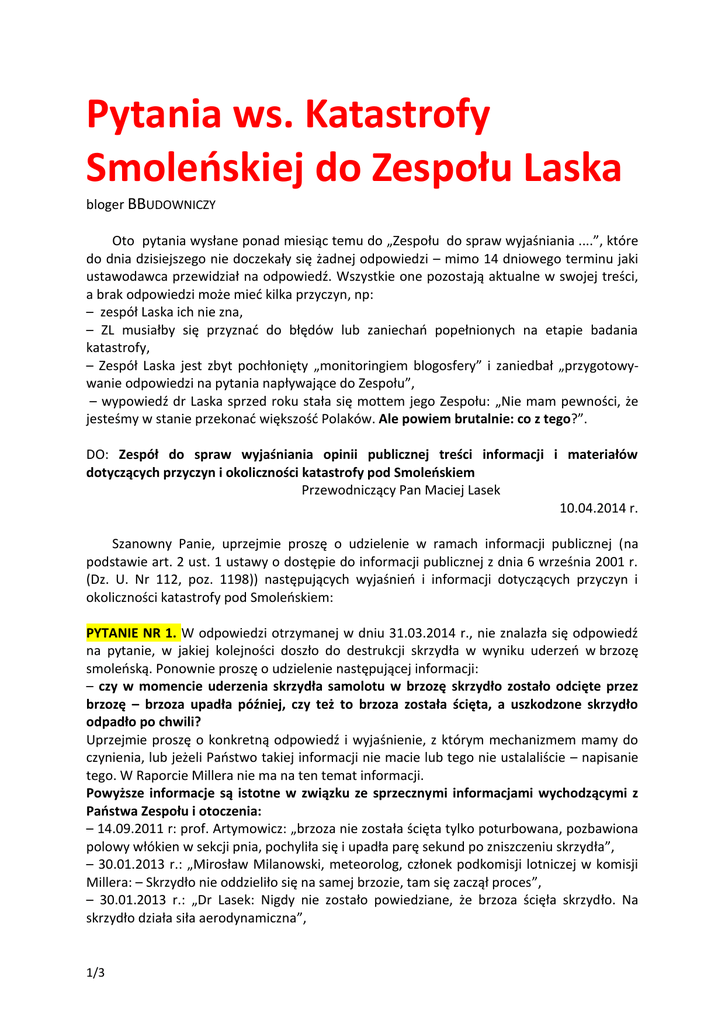 Pytania ws. Katastrofy Smoleńskiej do Zespołu Laska bloger BBUDOWNICZY Oto pytania wysłane ponad miesiąc temu do „Zespołu do spraw wyjaśniania ....”, które do dnia dzisiejszego nie doczekały się żadnej odpowiedzi – mimo 14 dniowego terminu jaki ustawodawca przewidział na odpowiedź. Wszystkie one pozostają aktualne w swojej treści, a brak odpowiedzi może mieć kilka przyczyn, np: – zespół Laska ich nie zna, – ZL musiałby się przyznać do błędów lub zaniechań popełnionych na etapie badania katastrofy, – Zespół Laska jest zbyt pochłonięty „monitoringiem blogosfery” i zaniedbał „przygotowywanie odpowiedzi na pytania napływające do Zespołu”, – wypowiedź dr Laska sprzed roku stała się mottem jego Zespołu: „Nie mam pewności, że jesteśmy w stanie przekonać większość Polaków. Ale powiem brutalnie: co z tego?”. DO: Zespół do spraw wyjaśniania opinii publicznej treści informacji i materiałów dotyczących przyczyn i okoliczności katastrofy pod Smoleńskiem Przewodniczący Pan Maciej Lasek 10.04.2014 r. Szanowny Panie, uprzejmie proszę o udzielenie w ramach informacji publicznej (na podstawie art. 2 ust. 1 ustawy o dostępie do informacji publicznej z dnia 6 września 2001 r. (Dz. U. Nr 112, poz. 1198)) następujących wyjaśnień i informacji dotyczących przyczyn i okoliczności katastrofy pod Smoleńskiem: PYTANIE NR 1. W odpowiedzi otrzymanej w dniu 31.03.2014 r., nie znalazła się odpowiedź na pytanie, w jakiej kolejności doszło do destrukcji skrzydła w wyniku uderzeń w brzozę smoleńską. Ponownie proszę o udzielenie następującej informacji: – czy w momencie uderzenia skrzydła samolotu w brzozę skrzydło zostało odcięte przez brzozę – brzoza upadła później, czy też to brzoza została ścięta, a uszkodzone skrzydło odpadło po chwili? Uprzejmie proszę o konkretną odpowiedź i wyjaśnienie, z którym mechanizmem mamy do czynienia, lub jeżeli Państwo takiej informacji nie macie lub tego nie ustalaliście – napisanie tego. W Raporcie Millera nie ma na ten temat informacji. Powyższe informacje są istotne w związku ze sprzecznymi informacjami wychodzącymi z Państwa Zespołu i otoczenia: – 14.09.2011 r: prof. Artymowicz: „brzoza nie została ścięta tylko poturbowana, pozbawiona polowy włókien w sekcji pnia, pochyliła się i upadła parę sekund po zniszczeniu skrzydła”, – 30.01.2013 r.: „Mirosław Milanowski, meteorolog, członek podkomisji lotniczej w komisji Millera: – Skrzydło nie oddzieliło się na samej brzozie, tam się zaczął proces”, – 30.01.2013 r.: „Dr Lasek: Nigdy nie zostało powiedziane, że brzoza ścięła skrzydło. Na skrzydło działa siła aerodynamiczna”, 1/3 – 08.03.2014 r. Dr Lasek do blogera Frycek: „Ze śladów zderzenia (pod brzozą rosnącą na działce dr. Bodina znaleziono m.in. element siłownika napędu klap skrzydłowych, co by sugerowało, że skrzydło zostało odcięte wskutek zderzenia) oraz zeznań dr Bodina wynika, że skrzydło rzeczywiście zostało odcięte w tym miejscu”, – 06.04.2014 r. prof. Sibilski: „To w końcu skrzydło ścięło brzozę czy brzoza skrzydło? – Drzewo zostało ścięte przez skrzydło”. PYTANIE NR 2. Ponawiam pytanie, czy znalezione we wrześniu/październiku 2010 roku metalowe fragmenty samolotu przed miejscem jego uderzenia w ziemię, mające ślady „okopcenia”, „osmalenia” i „mocno przepalone”, mogą świadczyć że elementy te mogą nosić ślady wybuchu? Zgodnie z Państwa komunikatem na stronie internetowej „osmalenia i nadtopienia” są charakterystycznymi śladami wybuchu: „Brak charakterystycznych śladów wybuchu, takich jak osmalenia i nadtopienia, na szczątkach samolotu. Przy eksplozji materiałów wybuchowych powstają gazy o temperaturze sięgającej 3000 stopni Celsjusza, które powodują nadtopienia i osmalenia powierzchni znajdujących się w ich zasięgu. Tego rodzaju śladów nie stwierdzono na żadnych szczątkach samolotu Tu-154M i jego wyposażenia ani na ciałach ofiar i należących do nich przedmiotach. PYTANIE NR 3. W odpowiedzi z dnia 31.03.2014 napisaliście Państwo o tzw. „raporcie archeologów”: Według opinii jednego z autorów tego raportu wykorzystywanie rezultatów badań archeologicznych do prób wyjaśniania przyczyn katastrofy jest znaczącym nadużyciem”. Zespół zgadza się z tym stanowiskiem. Proszę o odpowiedź, czy w świetle poniższych cytatów pochodzących z tego raportu, podtrzymujecie Państwo to stanowisko: „Wyżej opisane spostrzeżenia są bardzo ważnym, dodatkowym elementem umożliwiającym zrekonstruowanie ostatnich chwil samolotu TU-154M. Dokładna analiza fragmentów duraluminium i skonfrontowanie ich z ogólnym planem zalegania w terenie, może wnieść wiele cennych informacji do śledztwa”. Na temat fragmentów samolotu znajdowanych przed miejscem uderzenia: „Powyższe spostrzeżenia powinny być skonfrontowane z opinią specjalisty ds. katastrof lotniczych celem poddania ich ewentualnej weryfikacji. Mogą one stanowić dodatkowy element umożliwiający zrekonstruowanie ostatnich chwil samolotu TU-154M”. PYTANIE NR 4. Zgodnie z Państwa komunikatami, na żadnych szczątkach samolotu TU154M nie znaleziono śladów osmaleń i nadtopień. Proszę o informację i wytłumaczenie, jak Państwo tłumaczą fakt, że biegli, wykonujący na zlecenie prokuratury opinię fizykochemiczną wyselekcjonowali kilkadziesiąt miejsc na wraku w oparciu o ślady osmaleń, a także stwierdzili obecność elementów blach noszących ślady nadtopień metalu? „Zgodnie z wyżej opisanymi zasadami biegli wyselekcjonowali miejsca na szczątkach wraku i drobnych jego elementach noszące przede wszystkim ślady osmalenia i napylenia (...) Elementy blach noszące ślady nadtopień metalu (...) nie były wytypowane do dalszych badań”. To cytat z Opinii dostępnej na stronie NPW: http://www.npw.internetdsl.pl/Dokument