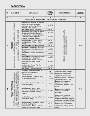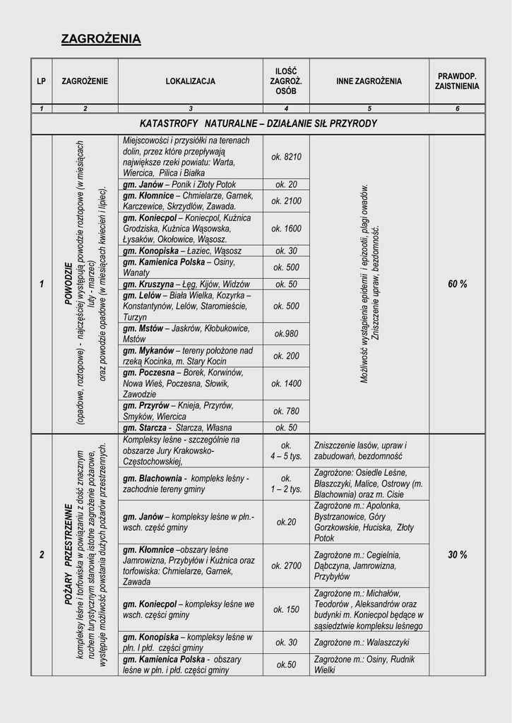 ZAGROŻENIA LP ZAGROŻENIE LOKALIZACJA ILOŚĆ ZAGROŻ. OSÓB INNE ZAGROŻENIA PRAWDOP. ZAISTNIENIA 1 2 3 4 5 6 2 POŻARY PRZESTRZENNE kompleksy leśne i torfowiska w powiązaniu z dość znacznym ruchem turystycznym stanowią istotne zagrożenie pożarowe, występuje możliwość powstania dużych pożarów przestrzennych. Miejscowości i przysiółki na terenach dolin, przez które przepływają największe rzeki powiatu: Warta, Wiercica, Pilica i Białka gm. Janów – Ponik i Złoty Potok gm. Kłomnice – Chmielarze, Garnek, Karczewice, Skrzydlów, Zawada. gm. Koniecpol – Koniecpol, Kuźnica Grodziska, Kużnica Wąsowska, Łysaków, Okołowice, Wąsosz. gm. Konopiska – Łaziec, Wąsosz gm. Kamienica Polska – Osiny, Wanaty gm. Kruszyna – Łęg, Kijów, Widzów gm. Lelów – Biała Wielka, Kozyrka – Konstantynów, Lelów, Staromieście, Turzyn gm. Mstów – Jaskrów, Kłobukowice, Mstów gm. Mykanów – tereny położone nad rzeką Kocinka, m. Stary Kocin gm. Poczesna – Borek, Korwinów, Nowa Wieś, Poczesna, Słowik, Zawodzie gm. Przyrów – Knieja, Przyrów, Smyków, Wiercica gm. Starcza - Starcza, Własna Kompleksy leśne - szczególnie na obszarze Jury KrakowskoCzęstochowskiej, ok. 8210 ok. 20 ok. 2100 ok. 1600 ok. 30 ok. 500 ok. 50 ok. 500 ok.980 ok. 200 ok. 1400 Możliwość wystąpienia epidemii i epizootii, plagi owadów. Zniszczenie upraw, bezdomność. 1 POWODZIE (opadowe, roztopowe) - najczęściej występują powodzie roztopowe (w miesiącach luty - marzec) oraz powodzie opadowe (w miesiącach kwiecień i lipiec). KATASTROFY NATURALNE – DZIAŁANIE SIŁ PRZYRODY ok. 780 ok. 50 ok. 4 – 5 tys. Zniszczenie lasów, upraw i zabudowań, bezdomność Zagrożone: Osiedle Leśne, Błaszczyki, Malice, Ostrowy (m. Blachownia) oraz m. Cisie Zagrożone m.: Apolonka, Bystrzanowice, Góry Gorzkowskie, Huciska, Złoty Potok gm. Blachownia - kompleks leśny zachodnie tereny gminy ok. 1 – 2 tys. gm. Janów – kompleksy leśne w płn.wsch. część gminy ok.20 gm. Kłomnice –obszary leśne Jamrowizna, Przybyłów i Kuźnica oraz torfowiska: Chmielarze, Garnek, Zawada ok. 2700 Zagrożone m.: Cegielnia, Dąbczyna, Jamrowizna, Przybyłów ok. 150 Zagrożone m.: Michałów, Teodorów , Aleksandrów oraz budynki m. Koniecpol będące w sąsiedztwie kompleksu leśnego ok. 30 Zagrożone m.: Walaszczyki ok.50 Zagrożone m.: Osiny, Rudnik Wielki gm. Koniecpol – kompleksy leśne we wsch. części gminy gm. Konopiska – kompleksy leśne w płn. I płd. części gminy gm. Kamienica Polska - obszary leśne w płn. i płd. części gminy 60 % 30 % 1 2 3 3 ANOMALIA POGODOWE w związku z następującymi zmianami klimatu nasila się prawdopodobieństwo wystąpienia kataklizmów pogodowych – odchylenia temperatury (susze, mrozy), intensywne opady (deszcz, śnieg, grad), prędkości wiatru (burze, huragany, trąby powietrzne – tornada). Zagrożenie dla wszystkich gmin powiatu częstochowskiego 4 EPIDEMIE (epizootia - wśród zwierząt, epifitia - wśród roślin) - szybkie rozprzestrzenianie się ostrych chorób zakaźnych i niezakaźnych. Epidemia może stać się przyczyną klęski żywiołowej. gm. Kruszyna – kompleks leśny w płn. – wsch. części gminy gm. Lelów – kompleksy leśne we wsch. część gminy gm. Mykanów – las na północy gminy gm. Olsztyn – duże kompleksy leśne w zach. i płn. części gminy gm. Poczesna – kompleks leśny we wschodniej części gminy gm. Przyrów – kompleks leśny w zachodniej części gminy Zagrożenie dla wszystkich gmin powiatu częstochowskiego 4 5 - - ok. 70 Zagrożone m.: Gródek, Bogumiłek Zagrożone m.: Stary Broniszew ok.100 Zagrożone m.: Odrzykoń ok. 60 6 ok. 20 - ok. 20 Zagrożone m.: Julianka, Osada Stawki Trudne do określenia Straty w uprawach i hodowlach, brak wody. Możliwość wystąpienia epidemii i epizootii. Awarie sieci energet., wodociągowych, ciepłowniczych, plagi, uwolnienie substancji niebezp. Zniszczenia drzewostanu, budowli. Osuwisko gm. Kłomnice 5% Trudne do określenia Możliwość wystąpienia pandemii. Trudności w zabezpieczeniu logistycznym. 5% 1 2 5 OSUWISKA nagłe przemieszczenie się mas ziemnych powierzchniowej zwietrzeliny i mas skalnych podłoża 3 4 gm. Kłomnice – w rejonie m. Karczewice - WGS 84; sz. 50 53 04, dł. 19 25 05 Trudne do określenia 5 Zatarasowanie biegu rzeki Warta, lokalne podtopienia. 6 1% 6 7 KATASTROFY KOMUNIKACYJNE (drogowe, kolejowe, lotnicze) - postępująca cywilizacja, ciągła rozbudowa sieci komunikacyjnych i różnorodność przewożonych ładunków potęgują zagrożenia powstania wypadków. KATASTROFY TECHNICZNE Zagrożenie przede wszystkim dla gmin powiatu częstochowskiego przez które przebiegają główne szlaki komunikacji drogowej i kolejowej. gm. Blachownia – droga krajowa nr 46 Częstochowa – Opole , linia kolejowa Częstochowa - Opole gm. Janów – droga krajowa nr 46 Częstochowa – Kielce, linia kolejowa Częstochowa - Kielce gm. Kłomnice –droga krajowa nr 91 Częstochowa – Radomsko, linia kolejowa Śląsk – Warszawa gm. Koniecpol – trasy drogowe i kolejowe przebiegające przez m. Koniecpol. gm. Kamienica Polska – droga krajowa DK 1 Warszawa - Katowice gm. Kruszyna - droga krajowa DK 1 Warszawa – Katowice i nr 91 Częstochowa - Radomsko gm. Lelów – droga krajowa nr 46 Częstochowa - Kielce, linia kolejowa CMK gm. Mstów – droga powiatowa nr 786 Częstochowa - Koniecpol gm. Olsztyn – droga krajowa nr 46 Częstochowa – Kielce, linia kolejowa Częstochowa - Kielce gm. Poczesna - droga krajowa DK 1 Warszawa – Katowice, linia kolejowa Śląsk – Warszawa gm. Przyrów - , linia kolejowa Częstochowa - Kielce gm. Rędziny - droga krajowa DK 1 Warszawa – Katowice i nr 91 Częstochowa - Radomsko Zagrożenie w miejscach położenia tych obiektów. gm. Blachownia - ZOZ Szpital im. Rudolfa Weigla, Dom Pomocy Społecznej, Ośrodek Sportu i Rekreacji, obiekty szkolne. Pożary paliwa i przewożonych ładunków, duża il