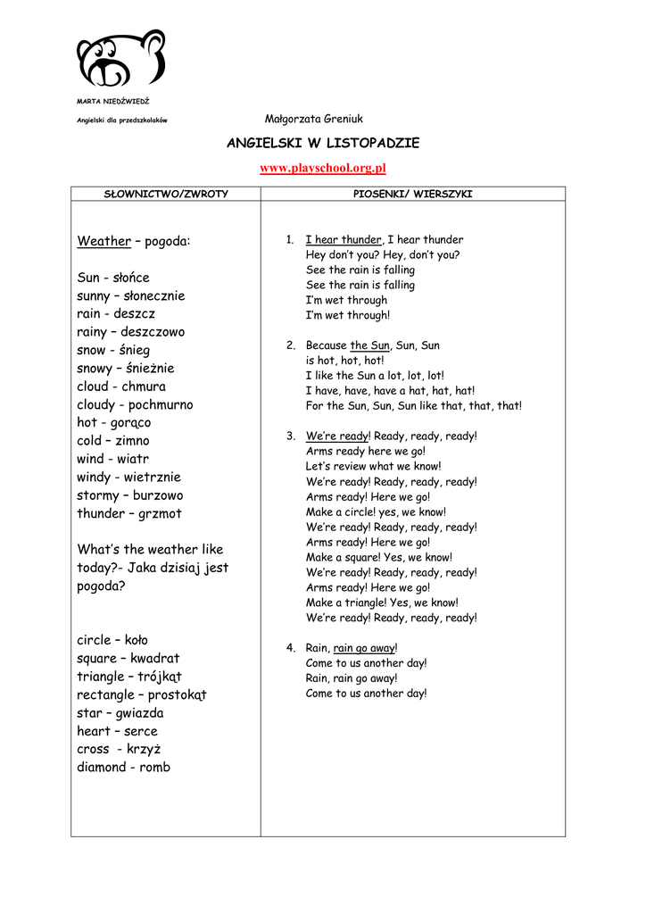 MARTA NIEDŹWIEDŹ Małgorzata Greniuk Angielski dla przedszkolaków ANGIELSKI W LISTOPADZIE www.playschool.org.pl SŁOWNICTWO/ZWROTY Weather – pogoda: Sun - słońce sunny – słonecznie rain - deszcz rainy – deszczowo snow - śnieg snowy – śnieżnie cloud - chmura cloudy - pochmurno hot - gorąco cold – zimno wind - wiatr windy - wietrznie stormy – burzowo thunder – grzmot What’s the weather like today?- Jaka dzisiaj jest pogoda? circle – koło square – kwadrat triangle – trójkąt rectangle – prostokąt star – gwiazda heart – serce cross - krzyż diamond - romb PIOSENKI/ WIERSZYKI 1. I hear thunder, I hear thunder Hey don’t you? Hey, don’t you? See the rain is falling See the rain is falling I’m wet through I’m wet through! 2. Because the Sun, Sun, Sun is hot, hot, hot! I like the Sun a lot, lot, lot! I have, have, have a hat, hat, hat! For the Sun, Sun, Sun like that, that, that! 3. We’re ready! Ready, ready, ready! Arms ready here we go! Let’s review what we know! We’re ready! Ready, ready, ready! Arms ready! Here we go! Make a circle! yes, we know! We’re ready! Ready, ready, ready! Arms ready! Here we go! Make a square! Yes, we know! We’re ready! Ready, ready, ready! Arms ready! Here we go! Make a triangle! Yes, we know! We’re ready! Ready, ready, ready! 4. Rain, rain go away! Come to us another day! Rain, rain go away! Come to us another day!