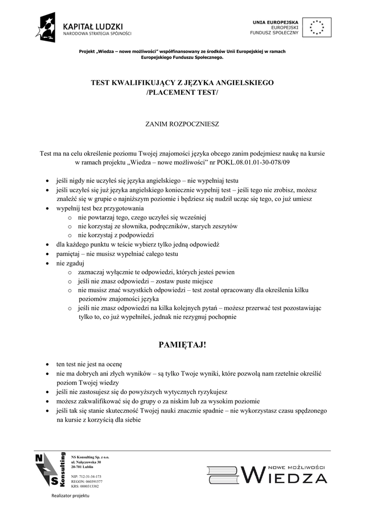 Projekt „Wiedza – nowe możliwości” współfinansowany ze środków Unii Europejskiej w ramach Europejskiego Funduszu Społecznego. TEST KWALIFIKUJĄCY Z JĘZYKA ANGIELSKIEGO /PLACEMENT TEST/ ZANIM ROZPOCZNIESZ Test ma na celu określenie poziomu Twojej znajomości języka obcego zanim podejmiesz naukę na kursie w ramach projektu „Wiedza – nowe możliwości” nr POKL.08.01.01-30-078/09 jeśli nigdy nie uczyłeś się języka angielskiego – nie wypełniaj testu jeśli uczyłeś się już języka angielskiego koniecznie wypełnij test – jeśli tego nie zrobisz, możesz znaleźć się w grupie o najniższym poziomie i będziesz się nudził ucząc się tego, co już umiesz wypełnij test bez przygotowania o nie powtarzaj tego, czego uczyłeś się wcześniej o nie korzystaj ze słownika, podręczników, starych zeszytów o nie korzystaj z podpowiedzi dla każdego punktu w teście wybierz tylko jedną odpowiedź pamiętaj – nie musisz wypełniać całego testu nie zgaduj o zaznaczaj wyłącznie te odpowiedzi, których jesteś pewien o jeśli nie znasz odpowiedzi – zostaw puste miejsce o nie musisz znać wszystkich odpowiedzi – test został opracowany dla określenia kilku poziomów znajomości języka o jeśli nie znasz odpowiedzi na kilka kolejnych pytań – możesz przerwać test pozostawiając tylko to, co już wypełniłeś, jednak nie rezygnuj pochopnie PAMIĘTAJ! ten test nie jest na ocenę nie ma dobrych ani złych wyników – są tylko Twoje wyniki, które pozwolą nam rzetelnie określić poziom Twojej wiedzy jeśli nie zastosujesz się do powyższych wytycznych ryzykujesz możesz zakwalifikować się do grupy o za niskim lub za wysokim poziomie jeśli tak się stanie skuteczność Twojej nauki znacznie spadnie – nie wykorzystasz czasu spędzonego na kursie z korzyścią dla siebie NS Konsulting Sp. z o.o. ul. Nałęczowska 30 20-701 Lublin NIP: 712-31-34-173 REGON: 060391577 KRS: 0000313382 Realizator projektu Projekt „Wiedza – nowe możliwości” współfinansowany ze środków Unii Europejskiej w ramach Europejskiego Funduszu Społecznego. Test sprawdzający Imię i nazwisko ............................................................................. Uzyskana ilość punktów: ……..........................……. / 50 Podpis sprawdzającego: ................................................................. Data ................................ I. Where can you see these notices? Mark A, B or C. Only one answer is correct. 1. Price per night: £ 200 single room, £ 350 double room a) in a museum b) in a police station c) in a hotel 2. No alcohol served to under 18s a) at a restaurant in a school c) in a library 3. Do not use mobile phones during the flight. a) in a taxi b) on a plane c) on a bus 4. 50% wool and 50% acrylic a) on food c) on furniture c) at a travel agent’s b) b) on clothes 5. Last minute offer: a tour of Australia for only £ 2000 a) in a bank b) in a station II. Choose the word or phrase which best completes each sentence. Mark A, B or C. Only one answer is correct. 6. Luc lives in Paris. He is … a) French c) Frank 7. Tom and Ted are Betty’s brothers. Betty is … sister. a) they b) them c) their 8. Come and meet Tracey … is my best friend. a) which b) what c) who NS Konsulting Sp. z o.o. ul. Nałęczowska 30 20-701 Lublin NIP: 712-31-34-173 REGON: 060391577 KRS: 0000313382 Realizator projektu b) France Projekt „Wiedza – nowe możliwości” współfinansowany ze środków Unii Europejskiej w ramach Europejskiego Funduszu Społecznego. 9. Waiter! … like a cup of coffee, please. a) I’m b) I’d 10. I never … shopping on weekdays, because I don’t have much time. a) go b) buy c) I’ve c) make III. Choose the word or phrase which best completes each sentence. Mark A, B, C or D. Only one answer is correct. 11. X: I’m going to bake a cake. Is there any milk in the fridge? Y: Yes, there is ……. a) any c) some b) many d) lot 12. X: Excuse me, where’s the flower shop? Y: It’s …… to the newsagent’s. a) opposite b) next c) d) near in front 13. X: How old are you? Y: Well, I …… in 1955. a) was old b) was c) d) was born born 14. X: Look, it’s raining again! Y: I think we are going to …… television all day long! a) see c) b) look d) watch observe 15. X: Hello, this is Melanie Brown from Central Bank. Can I speak to Mr. Clark? Y: Please ……. I’ll put you through. a) hold on c) hang on b) keep d) stay NS Konsulting Sp. z o.o. ul. Nałęczowska 30 20-701 Lublin NIP: 712-31-34-173 REGON: 060391577 KRS: 0000313382 Realizator projektu Projekt „Wiedza – nowe możliwości” współfinansowany ze środków Unii Europejskiej w ramach Europejskiego Funduszu Społecznego. 16. X: What’s going on with Peter? Have you seen him recently? Y: Yes, I …… him last Monday. a) have met c) was meeting b) meet d) met 17. X: Whose house is this? Y: It’s …… a) my b) our c) d) them ours 18. X: What was the worst day in your life? Y: Once I got lost in a forest and I completely didn’t …… where I was going. a) expect c) think b) know d) find 19. X: Are you going to buy a house? Y: No, we are thinking of buying a flat. It’ s …… than a house. a) cheap c) cheaper b) more cheap d) cheapest 20. X: I saw Barbara buying a “Perfect Body in 30 Days” video cassette. Y: Well, she wants to get fit …… she’s going to do more exercises. a) because c) but b) so d) until IV. Choose the word or phrase which best completes each sentence. Mark A, B, C or D. Only one answer is correct. 21. What was the weather …… in Barcelona? a) liked b) enjoyed c) d) like beautiful 22. When I was younger I was really …… of being alone at home and sometimes I even cried. Today it’s OK. a) pleased c) interested b) afraid d) embarrassed NS Konsulting Sp. z o.o. ul. Nałęczowska 30 20-701 Lublin NIP: 712-31-34-173 REGON: 060391577 KRS: 0000313382 Realizator projektu Projekt „Wiedza – nowe możliwości” wsp