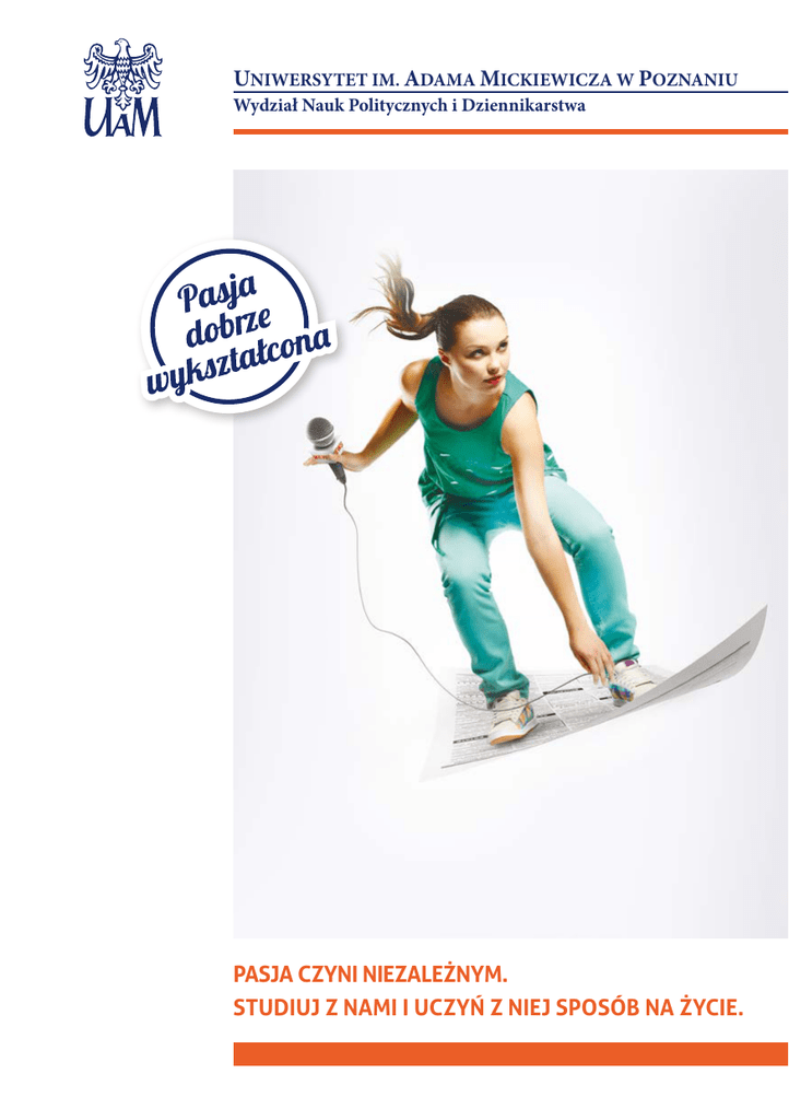 UNIWERSYTET IM. ADAMA MICKIEWICZA W POZNANIU Wydział Nauk Politycznych i Dziennikarstwa PASJA CZYNI NIEZALEŻNYM. STUDIUJ Z NAMI I UCZYŃ Z NIEJ SPOSÓB NA ŻYCIE. O WYDZIALE Wydział Nauk Politycznych i Dziennikarstwa UAM powstał w 2008 r. w wyniku podziału Wydziału Nauk Społecznych UAM i przekształcenia Instytutu Nauk Politycznych i Dziennikarstwa. Naszą siedzibą jest nowoczesny budynek na terenie kampusu UAM na Morasku. WYDZIAŁ W LICZBACH 18 multimedialnych sal wykładowych 3 profesjonalnie wyposażone studia 4000 studentów ponad 90 pracowników naukowych 12 kierunków studiów podyplomowych 28 tys. woluminów bibliotecznych oraz 110 tytułów czasopism (w tym ok. 20 tytułów obcojęzycznych) 6 redakcji studenckich 11 kół naukowych 7 pism naukowych SPIS KIERUNKÓW I SPECJALNOŚCI 2014/2015 STUDIA STACJONARNE I ST. II ST. STUDIA NIESTACJONARNE BEZPIECZEŃSTWO NARODOWE BEZPIECZEŃSTWO NARODOWE BEZPIECZEŃSTWO NARODOWE /ośrodek w Słubicach/ BEZPIECZEŃSTWO NARODOWE /ośrodek w Słubicach/ DZIENNIKARSTWO I KOMUNIKACJA SPOŁECZNA DZIENNIKARSTWO I KOMUNIKACJA SPOŁECZNA DZIENNIKARSTWO I KOMUNIKACJA SPOŁECZNA /ośrodek w Pile/ POLITOLOGIA POLITOLOGIA /Collegium Europaeum Gnesnense im. Jana Pawła II w Gnieźnie/ STOSUNKI MIĘDZYNARODOWE STOSUNKI MIĘDZYNARODOWE /studia prowadzone w języku angielskim/ ZARZĄDZANIE PAŃSTWEM I ST. II ST. DZIENNIKARSTWO I KOMUNIKACJA SPOŁECZNA /ośrodek w Pile/ POLITOLOGIA POLITOLOGIA /Collegium Europaeum Gnesnense im. Jana Pawła II w Gnieźnie/ STOSUNKI MIĘDZYNARODOWE ZARZĄDZANIE PAŃSTWEM Stan na dzień: 1.07.2013 Aktualne informacje na temat kierunków i specjalności: www.rekrutacja.amu.edu.pl OFERTA STUDIÓW III STOPNIA Studia doktoranckie na Wydziale Nauk Politycznych i Dziennikarstwa prowadzone są w dziedzinie nauk społecznych w zakresie: nauki o polityce w trybach stacjonarnym i niestacjonarnym. Więcej o studiach doktoranckich na: www.wnpid.amu.edu.pl/ studia-doktoranckie. OFERTA STUDIÓW PODYPLOMOWYCH Wydział prowadzi obecnie 12 kierunków studiów podyplomowych: odyplomowe Studia Zarządzania Zasobami P Ludzkimi odyplomowe Studia Bezpieczeństwa WewnętrzP nego i Międzynarodowego Podyplomowe Studia Dziennikarstwa odyplomowe Studia Historii i Wiedzy P o Społeczeństwie Podyplomowe Studia Zarządzania Funduszami i Projektami Unii Europejskiej CZEGO I JAK UCZYMY Wydział posiada nowoczesne, multimedialne sale, dzięki czemu zajęcia urozmaicane są o wszelkiego rodzaju materiały audiowizualne (przygotowywane są materiały wideo oraz prezentacje multimedialne). Studenci mogą korzystać z pracowni komputerowych wyposażonych w najnowocześniejszy i zróżnicowany pod względem oprogramowania sprzęt (Mac OS X, Linux, Windows). Dostępne są także w pełni wyposażone studia radiowe i telewizyjne, w których rejestrować można audycje radiowe oraz programy telewizyjne, a także poznać świat współczesnych mediów. W ramach zajęć praktycznych studenci mają możliwość korzystania z nowoczesnego sprzętu i przygotowywania własnych materiałów, a także tworzenia własnych mediów. Na Wydziale działają najróżniejsze media: od drukowanych przez wirtualne, radiowe aż po telewizyjne serwisy informacyjne. Wszystkie przygotowywane są przez studentów. Podyplomowe Studia Administracji Europejskiej Podyplomowe Studia Reklamy i Promocji Podyplomowe Studia Public Relations Podyplomowe Studia dla Liderów Samorządowych Podyplomowe Studia Zamówień Publicznych Podyplomowe Studia Media Relations Podyplomowe Studia Zarządzanie Projektami wg Metody TenStep Pełna oferta studiów podyplomowych na stronie www.wnpid.amu.edu.pl/studia-podyplomowe CO PO STUDIACH Studia na WNPiD otwierają przed absolwentami szerokie perspektywy dalszego rozwoju. Wiele instytucji, firm czy agencji czeka na naszych absolwentów. W zależności od kierunku mogą być to m.in.: POLITOLOGIA: s amorządowe instytucje publiczne (urzędy gminy, powiatów, województw, urzędy pracy, samorządowe jednostki organizacyjne, inspekcje i straże) r ządowe instytucje publiczne (ministerstwa, agencje rządowe, inspekcje, nadzory, administracja rządowa, państwowe jednostki organizacyjne) p artie polityczne i organizacje społeczne s ztaby polityczne i komitety wyborcze a gencje marketingowe i PR o środki badań społecznych i rynku fi rmy doradztwa personalnego i nstytucje kulturalne i nstytucje Unii Europejskiej fi rmy zajmujące się pozyskiwaniem funduszy europejskich s łużby specjalne z espoły reagowania kryzysowego b iznes r zecznicy prasowi STOSUNKI MIĘDZYNARODOWE: p lacówki dyplomatyczne i konsularne a gendy organizacji międzynarodowych s amorządowe i rządowe instytucje publiczne w zakresie współpracy zagranicznej o rganizacje społeczne i instytucje kulturalne m edia i nstytucje Unii Europejskiej b iznes w zakresie pozyskiwania funduszy i współpracy międzynarodowej s łużby specjalne firmy logistyczne i agencje spedycyjne izby gospodarcze biura turystyczne DZIENNIKARSTWO: stacje telewizyjne i radiowe czasopisma media społecznościowe portale internetowe agencje marketingowe i PR ośrodki badań społecznych i rynku biznes działy reklamy i promocji biura rzeczników prasowych własna firma medialna lub świadcząca usługi w zakresie promocji i reklamy BEZPIECZEŃSTWO: samorządowe instytucje publiczne (urzędy gminy, powiatów, województw, urzędy pracy, samorządowe jednostki organizacyjne) rządowe instytucje publiczne (ministerstwa, agencje rządowe, inspekcje, administracja rządowa, państwowe jednostki organizacyjne) zespoły reagowania kryzysowego Policja Inspekcja Transportu Drogowego Agencja Bezpieczeństwa Wewnętrznego Centralne Biuro Antykorupcyjne Agencja Wywiadu Służba Kontrwywiadu Wojskowego Służba Wywiadu Wojskowego Biuro Ochrony Rządu Straż Graniczna i Służba Celna Służba Więzienna Straż Ochrony Lotnisk Państwowa Straż Pożarna Formacje Obrony Cywilnej Kraju Siły Zbrojne RP agencje ochrony osób i mieni