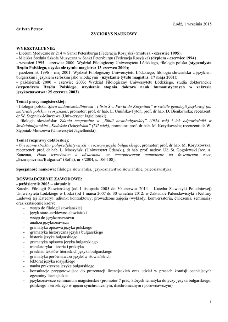 Łódź, 1 września 2015 dr Ivan Petrov ŻYCIORYS NAUKOWY