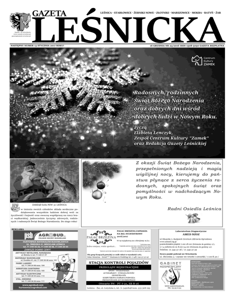 GAZETA Wydawca: Centrum Kultury Zamek” we Wrocławiu www.zamek.wroclaw.pl [email protected] LEŚNICA · STABŁOWICE · ŻERNIKI NOWE · ZŁOTNIKI · MARSZOWICE · MOKRA · RATYŃ · ŻAR LEŚNICKA NASTĘPNY NUMER 13 STYCZNIA 2017 ROKU! 16 GRUDNIA NR 23/2016 ISSN-1508-5090 GAZETA BEZPŁATNA Z okazji Świąt Bożego Narodzenia, przepełnionych nadzieją i magią wigilijnej nocy, kierujemy do państwa płynące z serca życzenia radosnych, spokojnych świąt oraz pomyślności w nadchodzącym Nowym Roku. ZARZĄD koła PZW 31 LEŚNICA w imieniu swoich członków składa serdeczne podziękowania wszystkim ludziom dobrej woli za życzliwość i hojność oraz owocną współpracę na rzecz braci wędkarskiej. Jednocześnie życzymy zdrowych, rodzinnych i radosnych Świąt Bożego Narodzenia. Do siego roku! REKLAMA Radni Osiedla Leśnica RUBRYKA REDAGOWANA PRZEZ RADĘ OSIEDLA LEŚNICA WWW.LESNICA.ORG LEŚNICA STABŁOWICE ZŁOTNIKI MARSZOWICE MOKRA RATYŃ ŻAR ŻERNIKI NOWE RADA OSIEDLA INFORMUJE: Osiedlowe imprezy Mikołajkowe Informujemy Państwa, że zgodnie z uchwałą Rady Osiedla, w grudniu br. został sfinansowany zakup paczek świątecznych dla 180 dzieci i młodzieży będących pod opieką Centrum Rozwoju aktywności Dzieci Młodzieży „Źródełko” przy parafii pw. św. Jadwigi w Leśnicy, świetlicy środowiskowej „Andrzejówka” przy parafii pw. św. Andrzeja Apostoła w Stabłowicach, świetlicy socjoterapeutycznej Antynarkotycznego Stowarzyszenia Katolickiego „KARAN” przy ul. Skoczylasa 8 oraz rekomendowanych przez Zespół Terenowej Pracy Socjalnej nr 2 MOPS. Paczki te zostały wręczone w ramach przygotowanych i przeprowadzonych przez wyżej wymienione ośrodki uroczystości mikołajkowych, za co dziękujemy ich kierownictwu i pracownikom. Szczególnie dziękujemy Wrocławskiemu Centrum Rozwoju Społecznego Urzędu Miasta za wspaniałomyślność i wsparcie naszego przedsięwzięcia – projektu zgłoszonego przez Radę Osiedla – dodatkową kwotą 1320 zł. Ponadto funduszami naszej rady wsparliśmy uroczystości mikołajkowe organizowane w dniu 4 XII br. przez CK „Zamek”. Za ich przygotowanie i przeprowadzenie na ręce pani dyrektor Elżbiety Lenczyk składamy serdeczne podziękowania personelowi Centrum Kultury „Zamek”. Łączna wartość tych obu świątecznych akcji (wraz z dotacją) wyniosła w tym roku 6820 zł. Przy tej okazji zwracamy się do mieszkańców Osiedla, w tym szczególnie potencjalnych sponsorów i darczyńców, o niezapominanie podczas zbliżających się Świąt Bożego Narodzenia o osobach potrzebujących, samotnych i chorych, dla których każdy dar serca może być niezapomnianą „gwiazdką z nieba”. Zmiany w składzie Zarządu Osiedla Leśnica Informujemy, że z ważnych powodów osobistych radna osiedla Dorota Kokurewicz złożyła rezygnację z funkcji wiceprzewodniczącej Zarządu Osiedla Leśnica. Bardzo serdecznie dziękujemy pani Dorocie za dotychczasowy duży wkład pracy i zaangażowanie w działalność społeczną. Zgodnie z uchwałą Rady funkcję tę objął radny Kazimierz Wilk. Panie Kazimierzu, życzymy wielu sukcesów w pracy społecznej w Zarządzie na stanowisku Wiceprzewodniczącego. Kontenery na odpady 16 i 20 grudnia br. wielkogabarytowe – Informujemy, że w grudniu, ostatni raz w tym roku, będą rozstawiane kontenery na odpady wielkogabarytowe. 16 grudnia w Stabłowicach w następujących lokalizacjach: zbieg ulic Ananasowa– Stabłowicka; Chwałkowska–Górecka (koło transformatora); Jeleniogórska–Kruszcowa; Jeleniogórska–Śnieżna; Lazurowa–Boguszowska; Samotna– Wełniana; Starogajowa–Przesiecka; Starogajowa 6; Śnieżna (z tyłu pawilonu handlowego Dino); ul. Żółta (naprzeciw ulicy Białej). Natomiast 20 grudnia kontenery będą rozstawione na osiedlach Ratyń: ul. Gromadzka (przy pętli autobusowej); zbieg ulic Miodowa–Batorego; Gromadzka (przy transformatorze); Gromadzka 49; Mokra: zbieg ulic Chobieńska–Mojęcicka, zbieg ulic Świerkowa–Ulowa; Marszowice: ul. Marszowicka 30, zbieg ulic Marszowicka–Wilkszyńska (od strony rzeki Bystrzycy); Żar: zbieg ulic Lutyńska– Lubska (przy transformatorze) i Żerniki Nowe: ul. Grabowa (na końcu ulicy); ul. Lewa (na końcu ulicy); ul. Trójkątna (naprzeciw nr 36); zbieg ulic Białodrzewna–Bukowa (obok bunkra). Czas na świąteczne porządki. Prosimy o wcześniejsze przygotowanie rzeczy, których chcemy się pozbyć. Przypominamy, że na stronie internetowej sp. Ekosystem zostały również wskazane miejsca i podane terminy ustawienia kontenerów zaproponowane przez spółdzielnie i duże wspólnoty mieszkaniowe np. TBS. Do precyzyjnego zlokalizowania miejsca rozmieszczenia wymienionych kontenerów można również wykorzystać wirtualną mapę. Projekt Ratyń I – na finiszu Wykonawca realizuje obecnie prace odtworzeniowe nawierzchni ulic objętych budową i modernizacją sieci wodociągowej i kanalizacji sanitarnej. Położono nakładkę asfaltową na ulicy Serowarskiej, odtwarzane będą ubytki w wybrukowanych ciągach spływu wody opadowej, naprawiane popękane i zapadnięte chodniki i wjazdy oraz fragmenty krawężników. Zaplanowano również oczyszczenie ulic z odpadów i śmieci budowlanych, wyrównanie i obsianie trawą poboczy gruntowych ulic objętych wymienioną inwestycją oraz oznakowanie progów spowalniających. Prosimy jeszcze o trochę cierpliwości i o niepozostawianie swoich pojazdów w obrębie jezdni i chodników, szczególnie w miejscach planowanych i prowadzonych prac. Przypominamy, żeby swoje uwagi szczególnie dotyczące podjazdów i chodników w pierwszej kolejności zgłaszać do wykonawcy, firmy AG System. Należy też zwrócić uwagę na uszkodzenia powstałe w obrębie swoich posesji, np. chodniki, ogrodzenia, trawniki, elementy architektury ogrodowej itp. Kontakt: inżynier budowy 519 138 605, kierownik budowy 512 040 925. Radny Zbigniew Mianowski został upoważniony do kontaktów z kierownict