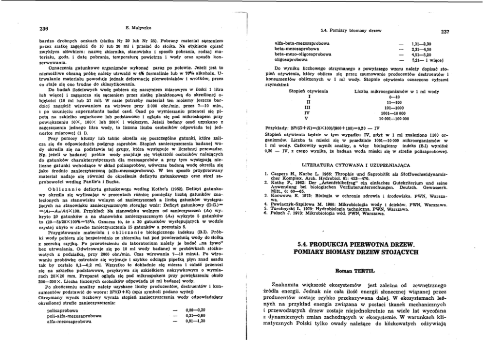 236 E. Malyszko I I bardzo drobnych oczkach (siatka Nr 20 lub Nr 25). Pobrany material sqcveniem przez siatkg zaggScit do 10 lub 20 ml i przelat do sloika. Na etykiecle opisat zwyklym d6wkiem: nazwg zbiornika, stanowisko i spos6b pobrania, rodzaj mat e r i a l ~ ,godz. i datg pobrania, temperature powietrza i wody oraz spos6b konserwowania. Oznaczenia gatunkowe organizmbw wykonat zaraz po polowie. Jeieli jest to niemoiliwe obrana pr6bg naleiy utrwalit w 4% formalinie Iub w 70% alkoholu. Utrwalanie materialu powoduje jednak deformacjg pierwotniak6w 1 wrotk6w, przez co staje sig ono trudne do sklasyfikowania. Do badad ilo6ciowych wodg pobiera sig naczyniem miarowym w ilokci 1 litra lub wigcej i zaggszcza sig sqczeniem przez siatkg planktonowq do okrdlonej objgtoSci (10 ml lub 23 ml). W razie potrzeby material ten moiemy jeszcze bardziej zaggScif wirowaniem na wir6wce przy 2000 obr.lmin. przez 7-10 min., i po usunigciu supernatantu badat osad. Osad po wymieszaniu przenosi sig pipet3 na szkielko zegarkowe lub podstawowe i oglqda sig pod mikroskopem przy powigkszeniu 50X, lOOX lub 200X i wigkszym. Jeieli badany osad uzyskano z zaggszqzenia jednego litra wody, to liczona liczba osobnik6w odpowiada tej jednostce miarowej (1 1). Przy pomocy kluczy lub tablic okreSla sig poszczegdlne gatunki, kt6re zalicza sig do odpowiednich podgrup saprob6w. Stopied zanieczyszczenia badanej WOdy okreSla sig na podstawie tej grupy, kt6ra wystgpuje W liczebnej przewadze. Np. jeieli w badanej pr6bie wody znajduje sig wigkszoSt osobnik6w naleiqcych do gatunk6w charakterystycznych dla mezosaprob6w a przy tym wystepujq nieliczne gatunki wchodzgce w sklad polisaprob6w, w6wczas badanq wodg okreSla sig jako Srednio zanieczfizczonq (alfa-mezosaprobowa). W ten spos6b przygotowany material nadaje sig r6wniei do okreSlenia deficytu gatunkowego oraz stref saprobowoSci wedlug Pantle'a i Bucka. 0 b 1i c z a n i e deficytu gatunkowego wedlug Kothe'a (1962). Deficyt gatunkowy okre6la sig wyliczajac w procentach r6inicg pomigdzy liczbq gatunk6w malezionych na stanowisku wolnyrn od zanieczyszczed a liczbq gatunk6w wyskpujqcych n a stanowisku zanieczyszczonm stosujqc wzbr: Deficyt gatunkowy (D.GSS =(A1--AdAf)X100. Przyklad: Na stanowisku woInym od zanieczyszcd (Ai) wykryto 20 gatunk6w a na stanowisku zanieczyszczonym (Az) wykryto 5 gatunk6w to (20-5)120X100%=75°/o. Oznacza to, i e z 20 gatunk6w wystwujqcych w wodzie czystej ubylo w strefie zanieczyszczenia 15 gatunkdw a pozostalo 5. Przygotowanie materialu i o b 1i c z a n i e biologicznego indeksu (B.1). Pr6bki wody pobiera sig bezpoirednio ze zbiornika t u i pod powierzchniq wody do sloika z szerokq szyjkg. Po przewiezieniu do laboratorium nalety je badat ,,M iywo" bez utrwalania. Odwirowuje sig po 10 ml wody badanej w probdwkach stoikowatych z podziaikg, przy 2000 obrlmin. Czas wirowania 7-10 minut. Po wirowaniu prob6wkg ostroinie sig wyjmuje i szybko odciqga pipetkq plyn znad osadu tak by zostalo 0 , 1 4 , 2 ml. Wszystko to dokladnie sig miesza i caloSt przenosi sig na szkielko podstawowe, przykrywa sig szkieikiem nakrywkowym o wymiarach 20x20 mm. Preparat oglqda sig pod mikrospokem przy powigkszeniu okolo 200-300X. Liczba liczonych osobnik6w odpowiada 10 ml badanej wody. Po skodczeniu analizy naleiy uzyskane liczby producent6w, destruent6w i konsumentbw podstawid do wzoru: 2PI(D+K) (op;s symboli podano wyiej) Otrzymany wynik liczbowy wyraia stopie6 zanieczyszczenia wody odpowiadajacy okreSlonej strefle zanieczyszczenia: polisaprobowa poli-alfa-mezosaprobowa alfa-mezosaprobowa 5.4. Pomiary blomasy drzew - alfa-beta-mezosaprobowa beta-mezosaprobowa beta-mezo-oligosaprobowa oligosaprobowa 1,31-2,30 2,314,50 4,51-5,20 521- i wigcej Do wyniku liczbowego otrzymanego z powyiszego wzoru naleky dopisat st+ pied oiywienia, kt6ry oblicza sig przez zsumowanie producent6w destruent6w i konsumentbw obliczonych w 1 ml wody. Stopnle oiywienla oznaczono cyframi rzymskimi: Stopied oiywienia Llczba mikroorganizm6w w 1 ml wody I 0-10 I1 11-100 111 101-1000 N 1001-10000 v 10001-100000 Przyklady: 2P/(D+K)=(~X100)/(900+100)=0,20 - IV .Stopied oiywienia k d z i e w tym wypadku IV, gdyi w 1 ml znaleziono 1100 organim6w. Liczba ta mieSci sig w przedziale 1001-10000 mikroorganizm6w w 1 ml wody. Calkowity wynik analizy, a wigc biologiczny indeks (B.1) wynibsl 0,20 - IV, z czego wynika, i e badana woda miehci sig w strefie polisaprobowej. LITERATURA CYTOWANA I UZUPELNIAJACA 1. Caspers H., Karbe L. 1966: Throphie und Saprobittit aIs Stoffwechseldynamischer Komplex. Arch. Hydrobiol. 61: 45-70, 2. Kothe P., 1962: Der ,,Artenfehlbefragn ein einfaches Gutekriterium und seine Anwendung bei biologischen Vorfluteruntersuchungen. Deutsch. Gewasserk. Mitt., 6: 60-65. 3. Kocwowa E. 1975: Biologia w ochronie zdrowia i Srodowiska. PWN, Warszawa. 4. PawlaczJrk-Szpilowa M. 1980: Mikrobiologia wody i Sciek6w. PWN, Warszawa. 5. Turoboyskl L. 1979: Hydrobiologia techniczna. PWN, Warszawa. 6. P a h c h J. 1973: Mikrobiologia w6d. PWN, Warszawa. 5.4. PRODUKCJA PIERWOTNA DRZEW. POMIARY BIOMASY DRZEW STOJACYCH Bornan TERTIL ' Znakomita wiekszoSC: ekosystem6w jest zaleina od zewnetrznego zrddla energii. Jednak nie cala iloSC energii slonecznej wiqzanej przez producent6w zostaje szybko przekazywana dalej. W ekosystemach leSnych na przykhd energia zwiqzana w postaci tkanek mechanicznych i przewodzqcych drzew zostaje niejednokrotnie na wiele lat wycofana z dynamicznych zmian zachodzqcych w ekosystemie. W warunkach klimatycznych Polski tylko owady naleiqce do kdzkowatych odiywiajq 5.4. Pomiary biomasy drzew 238 239" R Tertil I sic drewnem iywych drzew. Dla wiekszogci organizm6w energia zwiqzana w drewnie drzew jest calkowicie niedostepna i wldciwie moze by& uznana za retencje energii, czyli odlofenie jej w ekosystemie. WielkoB& tej retencji w r6inych ekosystemach leBnych jest bardzo zmienna. Odkladanie energii w produkcji drzewostan6w ma dla czlowieka ogromne znaczenie gospodarcze, jest to bowiem produkcja cennego surowca - drewna