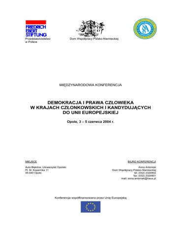 Przedstawicielstwo w Polsce Dom Współpracy Polsko-Niemieckiej MIĘDZYNARODOWA KONFERENCJA DEMOKRACJA I PRAWA CZŁOWIEKA W KRAJACH CZŁONKOWSKICH I KANDYDUJĄCYCH DO UNII EUROPEJSKIEJ Opole, 3 – 5 czerwca 2004 r. MIEJSCE BIURO KONFERENCJI Aula Błękitna, Uniwersytet Opolski Pl. M. Kopernika 11 45-040 Opole Anna Antoniak Dom Współpracy Polsko-Niemieckiej tel. (032) 2324902 fax: (032) 2324901 mail: [email protected] Konferencja współfinansowana przez Unię Europejską Czwartek, 3 czerwca 2004 9.30-13.15 MŁODE DEMOKRACJE I ROZWIJAJĄCE SIĘ SPOŁECZEŃSTWA OBYWATELSKIE W NOWYCH KRAJACH CZŁONKOWSKICH I KRAJACH KANDYDUJĄCYCH DO UNII EUROPEJSKIEJ 10.00 Powitanie. Wprowadzenie Thaddäus Schäpe, Dom Współpracy Polsko-Niemieckiej prof. Stanisław L. Stadniczeńko, Uniwersytet Opolski 10.30 Transformacja systemu i stabilizacja struktur demokratycznych w krajach Europy Środkowo-Wschodniej – uwarunkowanie polityczne, prawne i społeczne N.N. 11.00 Instrumenty wzmacniania społeczeństwa obywatelskiego jako elementu demokracji ks. prof. Stanisław Rabiej, Uniwersytet Opolski 11.30 Przerwa 11.45 Dyskusja panelowa: Nowa definicja relacji pomiędzy państwem a obywatelem Moderacja: prof. Stefan Marek Grochalski, Uniwersytet Opolski Uczestnicy: ks. prof. Stanisław Rabiej, Uniwersytet Opolski, N.N., Przedstawiciel Polskiej Fundacji im. Roberta Schumana, Daniel Skobla, Regionalne Centrum Ekologiczne REC, Słowacja, Anastazja Gajda, Uniwersytet Opolski 13.15 Przerwa na obiad 14.15-17.00 WDROŻENIE ACQUIS COMMUNAUTAIRE W ZAKRESIE PRAW CZŁOWIEKA 14.15 Ustawodawstwo UE w obronie praw człowieka Alain Brun, Departament Prawa Podstawowe i Obywatelstwo UE, Dyrekcja Generalna Wymiar Sprawiedliwości i Sprawy Wewnętrzne, Komisja Europejska 14.45 Przykłady nieprzestrzegania praw człowieka w nowych krajach członkowskich i krajach kandydujących do Unii Magdalena Kmak, Helsińska Fundacja Praw Człowieka, Warszawa 15.15 Przerwa 15.30 Dyskusja panelowa: Czy Unia Europejska mogłaby przejąć więcej odpowiedzialności w zakresie ochrony praw człowieka i instrumentów ich realizacji? Moderacja: prof. Andrzej Korybski, Uniwersytet Marii Skłodowskiej–Curie Uczestnicy: Alain Brun, Departament Prawa Podstawowe i Obywatelstwo UE, Dyrekcja Generalna Wymiar Sprawiedliwości i Sprawy Wewnętrzne, Komisja Europejska, Magdalena Kmak, Helsińska Fundacja Praw Człowieka, dr Lilla Farkas, Węgierski Komitet Helsiński, Janka Debreceniova, Stowarzyszenie Obywatelstwo i Demokracja, Słowacja, Calin Rus, Międzykulturowy Instytut w Timisoarze 17.00 Zakończenie dyskusji Dom Współpracy Polsko-Niemieckiej www.haus.pl 2 Piątek, 4 czerwca 2004 9.30-12.15 NIE MA PRAWORZĄDNOŚCI BEZ DOBRZE ZORGANIZOWANEGO I EFEKTYWNEGO SĄDOWNICTWA 9.30 Dorobek prawny Unii Europejskiej dotyczący sądownictwa Teresa Romer, sędzia Sądu Najwyższego w stanie spoczynku, Prezes Stowarzyszenia Sędziów Polskich JUSTITIA 10.00 Faza transformacji systemu sądownictwa w nowych krajach członkowskich i krajach kandydujących do Unii Europejskiej (na wybranym przykładzie) dr Andras Kovacs, Sąd Administracyjny w Budapeszcie 10.30 Przerwa 10.45 Dyskusja panelowa: Czy powinniśmy dążyć do bardziej spójnego systemu sądownictwa na szczeblu Unii Europejskiej? Moderacja: dr Artur Mudrecki, Uniwersytet Opolski, Wojewódzki Sąd Administracyjny w Opolu Uczestnicy: Teresa Romer, sędzia Sądu Najwyższego w stanie spoczynku, dr Andras Kovacs, Sąd Administracyjny w Budapeszcie, Ryszard Pęk, Krajowa Rada Sądownictwa, dr Tadeusz Cielecki, Uniwersytet Opolski, ppłk Andrzej Majewski, Dyrektor Okręgowy Służby Więziennej w Opolu 12.15 Przerwa na obiad 13.15-16.00 PRAWA KOBIET TO PRAWA CZŁOWIEKA 13.15 Gender-mainstreaming w polityce i prawie Unii Europejskiej Marianne Hürten, Landtag Północnej Nadrenii i Westfalii, Düsseldorf 13.45 Polityka równouprawnienia kobiet i mężczyzn w nowych krajach członkowskich i krajach kandydujących (na wybranym przykładzie) Alena Kralikova, Gender Studies, o.p.s., Czechy 14.15 Przerwa 14.30 Dyskusja panelowa: Polityka „gender” a jej rzeczywistość w nowych krajach członkowskich i krajach kandydujących do UE Moderacja: Ewa Mróz, Dom Współpracy Polsko-Niemieckiej Uczestnicy: Marianne Hürten, Landtag Północnej Nadrenii i Westfalii, Alena Kralikova, Gender Studies, N.N., Przedstawiciel Pełnomocnika Rządu ds. Równego Statusu Kobiet i Mężczyzn, Urszula Nowakowska, Centrum Praw Kobiet, Genoveva Tischeva, Bułgarska Fundacja Badań Genderowych, Apolonia Klepacz, senator, Magdalena Gołowkin-Hudala, Uniwersytet Opolski, Prezes Regionalnego Towarzystwa Przyjaciół Dzieci 16.00 Zakończenie dyskusji Dom Współpracy Polsko-Niemieckiej www.haus.pl 3 Sobota, 5 czerwca 2004 9.30-12.15 WOLNA PRASA I JEJ FUNKCJA KONTROLI WŁADZY 9.30 Wolność i niezależność prasy jako warunek funkcjonowania demokracji dr Ireneusz C. Kamiński, Zespół Prawa Europejskiego i Międzynarodowego, Instytut Nauk Prawnych Polskiej Akademii Nauk 10.00 Ramy prawne zabezpieczające niezależność prasy w UE dr Herbert Ungerer, Departament Informacja, Komunikacja i Media, Dyrekcja Generalna Konkurencja, Komisja Europejska 10.30 Przerwa 10.45 Dyskusja panelowa: Czy w Europie istnieją niezależne media i wolna prasa? Moderacja: dr Bogusław Nierenberg, Prezes Regionalnej Rozgłośni Polskiego Radia w Opolu "PRO FM" S.A. Uczestnicy: dr Ireneusz C. Kamiński, Zespół Prawa Europejskiego i Międzynarodowego, Instytut Nauk Prawnych Polskiej Akademii Nauk, dr Herbert Ungerer, Departament Informacja, Komunikacja i Media, Dyrekcja Generalna Konkurencja, Komisja Europejska, Michał Smolorz, Andrzej Krajewski, Centrum Monitoringu Wolności Prasy, Joanna Ryszka, Uniwersytet Opolski, Michał Balcerzak, Uniwersytet Mikołaja Kopernika w Toruniu 12.15 Przerwa na obiad 13.15-16.00 MNIEJSZOŚCI ETNICZNE I NARODOWE W POLITYCE UNII EUROPEJSKIEJ I POLITYKACH KRAJÓW KANDYDUJĄCYCH 13.15 Dlaczego musimy chronić mniejszości narodowe