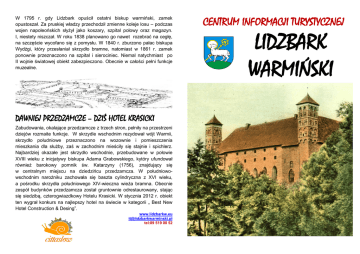 W 1795 r. gdy Lidzbark opuścił ostatni biskup warmiński, zamek opustoszał. Za pruskiej władzy przechodził zmienne koleje losu – podczas wojen napoleońskich słyżył jako koszary, szpital polowy oraz magazyn. I, niestety niszczał. W roku 1838 planowano go nawet rozebrać na cegłę, na szczęście wycofano się z pomysłu. W 1840 r. zburzono pałac biskupa Wydżgi, który przesłaniał skrzydło bramne, natomiast w 1861 r. zamek ponownie przeznaczono na szpital i sierociniec. Niemal natychmiast po II wojnie światowej obiekt zabezpieczono. Obecnie w całości pełni funkcje muzealne. DAWNIEJ PRZEDZAMCZE – DZIŚ HOTEL KRASICKI Zabudowania, okalające przedzamcze z trzech stron, pełniły na przestrzeni dziejów rozmaite funkcje. W skrzydle wschodnim rezydował wójt Warmii, skrzydło południowe przeznaczono na wozownie i pomieszczenia mieszkania dla służby, zaś w zachodnim mieściły się stajnie i spichlerz. Najbardziej okazałe jest skrzydło wschodnie, przebudowane w połowie XVIII wieku z inicjatywy biskupa Adama Grabowskiego, kytóry ufundował również barokowy pomnik św. Katarzyny (1756), znajdujący się w centralnym miejscu na dziedzińcu przedzamcza. W południowowschodnim narożniku zachowała się baszta cylindryczna z XVI wieku, a pośrodku skrzydła południowego XIV-wieczna wieża bramna. Obecnie zespół budynków przedzamcza został gruntownie odrestaurowany, stając się siedzibą, czterogwiazdkowy Hotelu Krasicki. W stycznia 2012 r. obiekt ten wygrał konkurs na najlepszy hotel na świecie w kategorii „ Best New Hotel Construction & Desing”. www.lidzbarkw.eu [email protected] tel:89 519 00 52 CENTRUM INFORMACJI TURYSTYCZNEJ LIDZBARK WARMIŃSKI MIASTO LIDZBARK WARMIŃSKI –PERŁA WARMII Około 1240 r. osada Lecbarg, zasiedlona dotychczas przez pruskie plemiona Warmów i Bartów, została zdobyta przez krzyżaków i przemianowana na długie lata na Heilsberg. W 1308 r. otrzymała prawa miejskie. W drugiej połowie XIV wieku, wraz z budową zamku, powstało miasto. Zbudowano ratusz, kościół, szpital oraz rzadkość w ówczesnych czasach – wodociągi, które służyły miejscowej ludności do 1904 r. W latach 1350-1795 na zamku urzędowało kolejno trzynastu biskupów warmińskich, a sam Lidzbark był historyczną stolicą Warmii. Z miastem związane są nazwiska wybitnych osobistości. To tutaj Kopernik „wstrzymał Słońce a poruszył Ziemię”. To tutaj w 1749 r. słynny mecenas i niepospolity znawca sztuki biskup Adam Grabowski jako pierwszy wydobył z mroku zapomnienia kronikę Galla Anonima i ogłosił ją drukiem. To właśnie na lidzbarskim zamku Ignacy Krasicki (nazywany Księciem Poetów) stworzył swoje najwybitniejsze dzieła. W 1807 r. na błoniach pod miastem miała miejsce jedna z największych bitew wojsk napoleońskich, znana jako „bitwa pod Heilsbergiem”, dowodzonych osobiście przez Cesarza Francuzów. Wydarzenie to zostało upamiętnione inskrypcją na paryskim Łuku Triumfalnym. Niestety obecnemu Lidzbarkowi daleko do dawnej świetności. Zniszczyły je liczne pożary, a podczas II wojny światowej jego centrum zostało zniszczone w 80 procentach. Świadkiem historii pozostał jednak zamek biskupów warmińskich, czuwający nieprzerwanie nad miastem od prawie siedmiuset lat. Warto doń zawitać. ZAMEK BISKUPÓW WARMIŃSKICH Nazywany „Wawelem Północy, chluba i symbol miasta. Jeden z najcenniejszych gotyckich zabytków w Polsce. Wzniesiony na wąskim półwyspie przy ujściu rzek Symasrn i Łyny, z inicjatywy biskupa Jana I z Miśni (1350–1401). Na zamku rezydowali m.in.: Jan Dantyszek, Michał Kromer, Stanisław Hozjusz, Adam Grabowski. Mikołaj Kopernik napisał tutaj komentarz do swego wiekopomnego dzieła „O obrotach sfer niebieskich”. Jednak najsłynniejszym mieszkańcem był ostatni biskup warmiński Ignacy Krasicki - poeta i autor słynnych bajek, jeden z najwybitniejszych twórców polskiego oświecenia, uczynił z zamku rezydencję godną książęcych rodów. Zgromadził ogromną kolekcję malarstwa i rzeźb, wzbogacił o ponad 600 tomów zamkową bibliotekę. Założył przepiękne ogrody w stylu francuskim. Ozdobą zamku jest uroczy wewnętrzny dziedziniec z dwukondygnacyjnymi krużgankami, jedynymi w Polsce jakie zachowały się w nienaruszonym stanie. Można w nich podziwiać wspaniałe freski z końca XIV wieku. Do zwiedzania udostępniono: kaplicę, wielki i mały refektarz, kapitularz, salę audiencyjną i komnaty biskupie. Pomieszczenia, do których prowadzą drzwi obramowane gotyckimi i renesansowymi portalami, wieńczą spektakularne gwiaździste sklepienia. Wielki refektarz (niegdyś sala sądowa), o wymiarach 27 x 9 m i wysokości 10 m, zdobi frez heraldyczny z herbami wszystkich biskupów warmińskich. Na jego południowej ścianie znajduje się odsłonięte podczas renowacji jedno z najstarszych malowideł (z końca XIV wieku), średniowieczną polichromię przedstawiającą koronację Matki Boskiej. Natomiast wejście do kaplicy zdobi herb Michała Radziejowskiego (biskupa w latach 1678–1688); gwiaździste sklepienie i rokokową ornamentację, ufundował biskup Adam Grabowski, o czym świadczy jego herb umieszczony obok organów. Podziemne zamkowe kondygnacje, czyli piwnice z gotyckimi sklepieniami, służyły niegdyś jako składy żywności, piwa i wina zaś przyziemne spełniały funkcje gospodarcze. Te w północnym skrzydle mieściły browar, we wschodnim spiżarnię, zaś w zachodnim kuchnię i piekarnię.