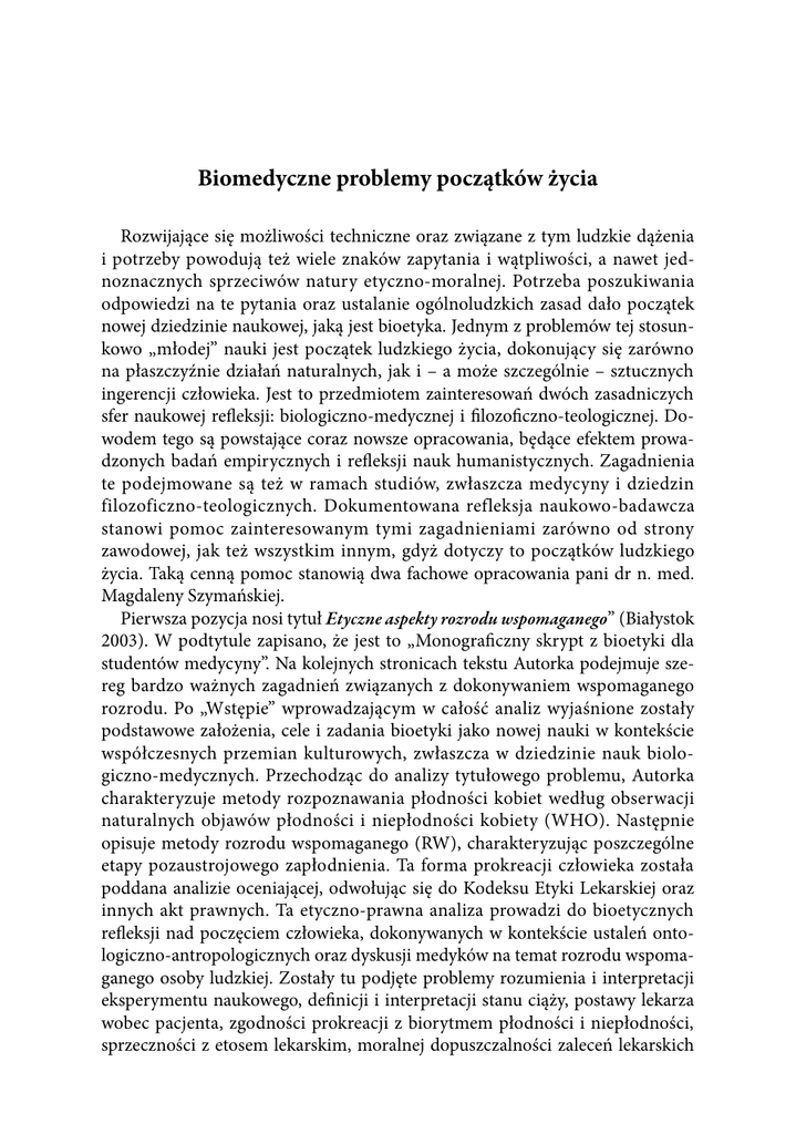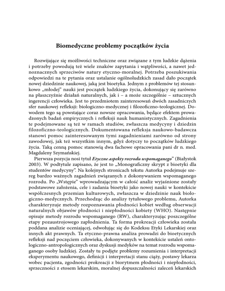 Biomedyczne problemy początków życia Rozwijające się możliwości techniczne oraz związane z tym ludzkie dążenia i potrzeby powodują też wiele znaków zapytania i wątpliwości, a nawet jednoznacznych sprzeciwów natury etyczno-moralnej. Potrzeba poszukiwania odpowiedzi na te pytania oraz ustalanie ogólnoludzkich zasad dało początek nowej dziedzinie naukowej, jaką jest bioetyka. Jednym z problemów tej stosunkowo „młodej” nauki jest początek ludzkiego życia, dokonujący się zarówno na płaszczyźnie działań naturalnych, jak i – a może szczególnie – sztucznych ingerencji człowieka. Jest to przedmiotem zainteresowań dwóch zasadniczych sfer naukowej refleksji: biologiczno-medycznej i filozoficzno-teologicznej. Dowodem tego są powstające coraz nowsze opracowania, będące efektem prowadzonych badań empirycznych i refleksji nauk humanistycznych. Zagadnienia te podejmowane są też w ramach studiów, zwłaszcza medycyny i dziedzin filozoficzno-teologicznych. Dokumentowana refleksja naukowo-badawcza stanowi pomoc zainteresowanym tymi zagadnieniami zarówno od strony zawodowej, jak też wszystkim innym, gdyż dotyczy to początków ludzkiego życia. Taką cenną pomoc stanowią dwa fachowe opracowania pani dr n. med. Magdaleny Szymańskiej. Pierwsza pozycja nosi tytuł Etyczne aspekty rozrodu wspomaganego” (Białystok 2003). W podtytule zapisano, że jest to „Monograficzny skrypt z bioetyki dla studentów medycyny”. Na kolejnych stronicach tekstu Autorka podejmuje szereg bardzo ważnych zagadnień związanych z dokonywaniem wspomaganego rozrodu. Po „Wstępie” wprowadzającym w całość analiz wyjaśnione zostały podstawowe założenia, cele i zadania bioetyki jako nowej nauki w kontekście współczesnych przemian kulturowych, zwłaszcza w dziedzinie nauk biologiczno-medycznych. Przechodząc do analizy tytułowego problemu, Autorka charakteryzuje metody rozpoznawania płodności kobiet według obserwacji naturalnych objawów płodności i niepłodności kobiety (WHO). Następnie opisuje metody rozrodu wspomaganego (RW), charakteryzując poszczególne etapy pozaustrojowego zapłodnienia. Ta forma prokreacji człowieka została poddana analizie oceniającej, odwołując się do Kodeksu Etyki Lekarskiej oraz innych akt prawnych. Ta etyczno-prawna analiza prowadzi do bioetycznych refleksji nad poczęciem człowieka, dokonywanych w kontekście ustaleń ontologiczno‑antropologicznych oraz dyskusji medyków na temat rozrodu wspomaganego osoby ludzkiej. Zostały tu podjęte problemy rozumienia i interpretacji eksperymentu naukowego, definicji i interpretacji stanu ciąży, postawy lekarza wobec pacjenta, zgodności prokreacji z biorytmem płodności i niepłodności, sprzeczności z etosem lekarskim, moralnej dopuszczalności zaleceń lekarskich Sprawozdania i recenzje 221 wobec „leczenia niepłodności”, przeanalizowany został problem podmiotowości zarodka i płodu ludzkiego, poszczególne fazy procedury pozaustrojowego zapłodnienia, fakt i znaczenie zespołu poaborcyjnego, inne dylematy bioetyczne towarzyszące rozrodowi wspomaganemu, w tym szczególnie antagonizacja płci oraz powikłania z tym związane. Analizę tego punktu Autorka kończy postawieniem szeregu wątpliwości i pytań natury etycznej. W ostatniej części zatytułowanej „Podsumowanie” M. Szymańska dokonuje zestawienia faktu i procedury wspomaganego rozrodu z zasadami Karty Pracowników Służby Zdrowia wydanej przez Papieską Radę Duszpasterstwa Służby Zdrowia, jak też z ludzkim wymiarem aktu małżeńskiego i prawami dziecka. Zestawienia te pozwalają wskazać argumenty przeciwko eksperymentowaniu na życiu ludzkim, co ma miejsce w całej procedurze pozaustrojowego zapłodnienia. Druga z omawianych tu pozycji autorstwa dr. M. Szymańskiej to Bioetyka początków życia (Białystok 2004). Po krótkiej prezentacji problematyki we „Wstępie”, autorka przedstawia problem zatytułowany: „Bioetyczne aspekty diagnostyki prenatalnej”. W ramach analiz tego zagadnienia scharakteryzowała obrazową diagnostykę prenatalną, badanie echo, amniopunkcję, biopsję kosmówki, co pozwoliło dokonać etycznej oceny tych działań medycznych w aspekcie godności i obiektywnego dobra osoby ludzkiej. Kolejny punkt nosi tytuł: „Wczesnoporonne działanie antykoncepcji hormonalnej”. Zostały tu omówione: fizjologia hormonalnego cyklu kobiety, mechanizm działania hormonów płciowych, mechanizm działania hormonalnych środków „antykoncepcyjnych”, antykoncepcja hormonalna (inne rodzaje), działanie uboczne hormonalnej antykoncepcji, wczesnoporonne działanie środków antykoncepcyjnych, przeciwwskazania do stosowania antykoncepcji hormonalnej. Działanie te poddane zostały etycznej ocenie uwzględniającej dobro osób biorących udział w poczęciu – małżonków, etyczną wartość aktu płciowego oraz dobro życia dziecka poczętego. Trzecie zagadnienie omawianej książki to: „Metody naturalnego planowania rodziny”. Spotykamy tu najpierw opis metod naturalnego planowania rodziny: rozpoznawanie płodności u kobiety (według WHO). Następnie przedstawione zostały zalecenia Światowej Organizacji Zdrowia (WHO) dotyczące naturalnego planowania rodziny oraz nauczanie i poradnictwo w tym względzie z uwzględnieniem ekologicznego karmienia. W dalszej części analiz tego zagadnienia ukazana została historia naturalnego planowania rodziny oraz zalety tego rodzaju metod kierowania płodnością. Kontynuując swoje analizy prokreacji człowieka, M. Szymańska podejmuje problem: „Etyka wobec medycznie wspomaganej prokreacji”. Najpierw opisuje rozród wspomagany i jego metody od strony medycznej. Następnie zestawia to z normami etycznymi w tym względzie, uwzględniając następujące zagadnienia: etyczny wymiar eksperymentów naukowych, rozumienie i interpretacja stanu ciąży, istotę i znaczenie prokreacji zgodnej z biorytmem płodności i niepłod- 222 Sprawo