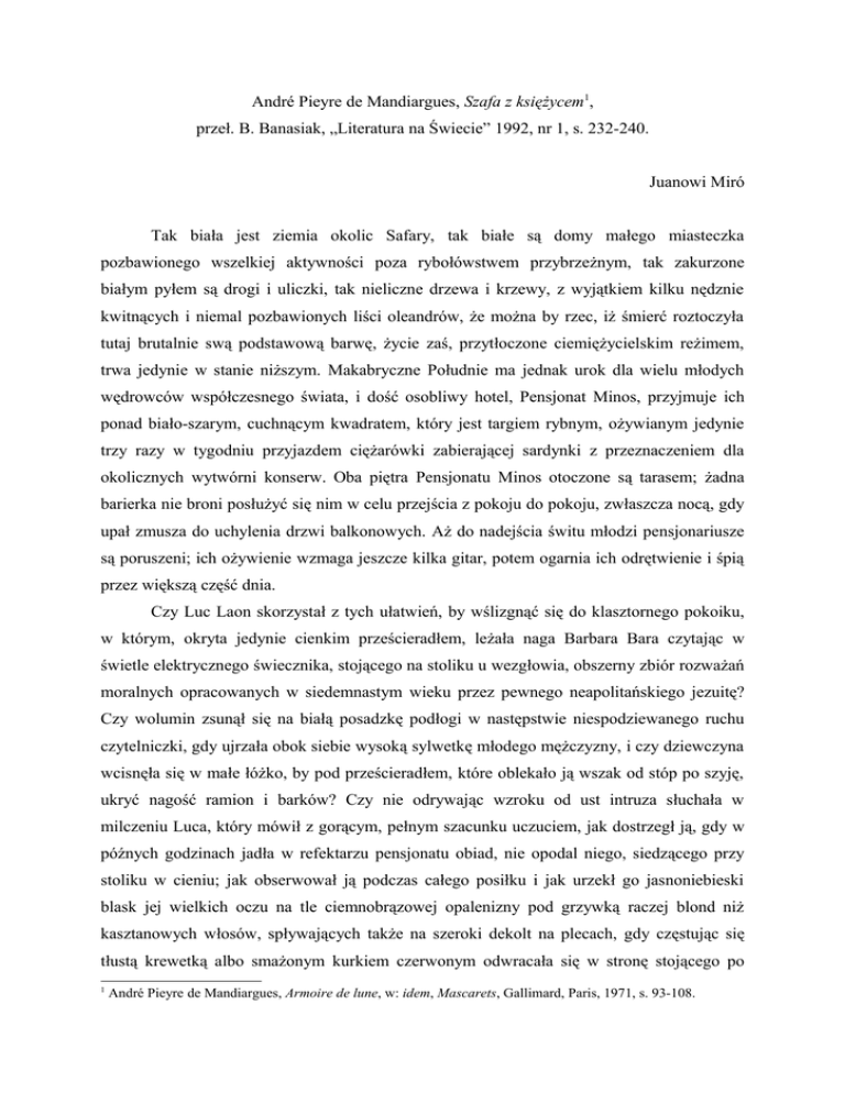 André Pieyre de Mandiargues, Szafa z księżycem1, przeł. B. Banasiak, „Literatura na Świecie” 1992, nr 1, s. 232-240. Juanowi Miró Tak biała jest ziemia okolic Safary, tak białe są domy małego miasteczka pozbawionego wszelkiej aktywności poza rybołówstwem przybrzeżnym, tak zakurzone białym pyłem są drogi i uliczki, tak nieliczne drzewa i krzewy, z wyjątkiem kilku nędznie kwitnących i niemal pozbawionych liści oleandrów, że można by rzec, iż śmierć roztoczyła tutaj brutalnie swą podstawową barwę, życie zaś, przytłoczone ciemiężycielskim reżimem, trwa jedynie w stanie niższym. Makabryczne Południe ma jednak urok dla wielu młodych wędrowców współczesnego świata, i dość osobliwy hotel, Pensjonat Minos, przyjmuje ich ponad biało-szarym, cuchnącym kwadratem, który jest targiem rybnym, ożywianym jedynie trzy razy w tygodniu przyjazdem ciężarówki zabierającej sardynki z przeznaczeniem dla okolicznych wytwórni konserw. Oba piętra Pensjonatu Minos otoczone są tarasem; żadna barierka nie broni posłużyć się nim w celu przejścia z pokoju do pokoju, zwłaszcza nocą, gdy upał zmusza do uchylenia drzwi balkonowych. Aż do nadejścia świtu młodzi pensjonariusze są poruszeni; ich ożywienie wzmaga jeszcze kilka gitar, potem ogarnia ich odrętwienie i śpią przez większą część dnia. Czy Luc Laon skorzystał z tych ułatwień, by wślizgnąć się do klasztornego pokoiku, w którym, okryta jedynie cienkim prześcieradłem, leżała naga Barbara Bara czytając w świetle elektrycznego świecznika, stojącego na stoliku u wezgłowia, obszerny zbiór rozważań moralnych opracowanych w siedemnastym wieku przez pewnego neapolitańskiego jezuitę? Czy wolumin zsunął się na białą posadzkę podłogi w następstwie niespodziewanego ruchu czytelniczki, gdy ujrzała obok siebie wysoką sylwetkę młodego mężczyzny, i czy dziewczyna wcisnęła się w małe łóżko, by pod prześcieradłem, które oblekało ją wszak od stóp po szyję, ukryć nagość ramion i barków? Czy nie odrywając wzroku od ust intruza słuchała w milczeniu Luca, który mówił z gorącym, pełnym szacunku uczuciem, jak dostrzegł ją, gdy w późnych godzinach jadła w refektarzu pensjonatu obiad, nie opodal niego, siedzącego przy stoliku w cieniu; jak obserwował ją podczas całego posiłku i jak urzekł go jasnoniebieski blask jej wielkich oczu na tle ciemnobrązowej opalenizny pod grzywką raczej blond niż kasztanowych włosów, spływających także na szeroki dekolt na plecach, gdy częstując się tłustą krewetką albo smażonym kurkiem czerwonym odwracała się w stronę stojącego po 1 André Pieyre de Mandiargues, Armoire de lune, w: idem, Mascarets, Gallimard, Paris, 1971, s. 93-108. lewej stronie półmiska; jak rozkosznie uwiodła go przemyślność jej łakomstwa, a także nieskazitelna uroda i swego rodzaju wspaniała świeżość, która upodabniała ją do zaledwie rozkwitłego w poszyciu leśnym kwiatu lub młodziutkiego grzybka albo też do rzadkiej ryby oglądanej przez szkło maski nurka; jak zrozumiał, że ta młoda kobieta była ucieleśnieniem pożądania, którego w roztargnieniu i leniwie doznawał wobec wszystkich młodych kobiet, jakie znalazły się w zasięgu jego ramion, że była absolutną postacią tego wiecznego pożądania, mogącego znaleźć zaspokojenie wyłącznie w ciele kobiety, od której dzielił go najwyżej metr lub dwa, z którą jednak utrzymywał już pewną bliskość, porównywalną jedynie do tego, co znajdował w lustrze na wprost własnego odbicia; jak dowiedział się jej imienia, na którym piętrze mieszkała, gdzie znajdował się jej pokój, i jak wszedł przez okno (w taki zresztą sposób, jak większość mieszkańców pensjonatu), ażeby zaproponować jej, by oddała się jego gwałtownemu pożądaniu i pozwoliła się objąć pod jasnym nocnym niebem, przy dźwiękach gitar w rękach młodzieńców nie mających jeszcze pary; jak miał nadzieję, iż bez zbędnych komplikacji przystanie na propozycję, która dla współczesnych wędrowców podczas lata w rejonie Południa była w powszechnym użyciu i która nie powinna być przyczyną innej niespodzianki niż pojawienie się, pochlebne zresztą, jak sądził, pożądania równie namiętnego, jak te jego postacie, które pod wspólnym imieniem miłości natchnęły autorów najpiękniejszych poematów czasów przeszłych? Czy trwając w bezruchu pod prześcieradłem, które z jej rozciągniętego ciała czyniło najbardziej zmysłową leżącą statuę na nie istniejącej krypcie, Barbara Bara odparła, iż jego propozycję odczuła raczej jako nadzwyczajną niż niespodziewaną, i doznała podobnego pragnienia, by wyjść na spotkanie pragnieniu, tak jak usta zbliżają się ku własnemu odbiciu w lustrze i do niego przylegają, ale że była dziewicą, jakkolwiek mogło się to wydawać zaskakujące, i że pokój w Pensjonacie Minos, swego rodzaju bezpłatnym burdelu, jakim on go niemal określił, naprawdę nie był odpowiednim miejscem na złożenie siebie w ofierze, której szybkiego spełnienia pragnęła, tak, i której chciała się oddawać całą sobą, w myślach i w wyobraźni, co najmniej przez dwadzieścia cztery godziny? Czy dodała, że następna noc przyniesie pełnię księżyca i czas osiągnie wówczas pewną dojrzałość, odpowiednią dla żniwa krwi i rozkoszy? Co do miejsca, to czy młoda dziewczyna wybrała cmentarz, którego kredowy płaskowyż wznosił się wyraźnie nad Safarą, i czy powiedziała Lucowi Laonowi, zmieszanemu początkowo takim wyborem, że nigdzie indziej, tylko tam, pośród grobów dawnych mieszkańców Safary, jej ciało połączyłoby się z jego ciałem, przybierając wszystkie pozy, jakie byłyby mu miłe, i że w całym tego słowa znaczeniu byłaby mu bardziej bezwzględnie uległa niż odbicie przedmiotowi, który je wywołuje? Czy Luc Laon wysłuchał w końcu prośby Barbary Bara, by t