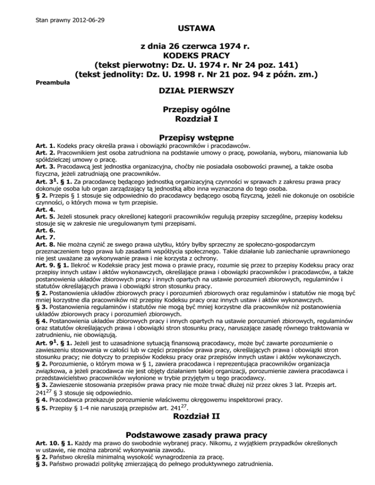 Stan prawny 2012-06-29 USTAWA z dnia 26 czerwca 1974 r. KODEKS PRACY (tekst pierwotny: Dz. U. 1974 r. Nr 24 poz. 141) (tekst jednolity: Dz. U. 1998 r. Nr 21 poz. 94 z późn. zm.) Preambuła DZIAŁ PIERWSZY Przepisy ogólne Rozdział I Przepisy wstępne Art. 1. Kodeks pracy określa prawa i obowiązki pracowników i pracodawców. Art. 2. Pracownikiem jest osoba zatrudniona na podstawie umowy o pracę, powołania, wyboru, mianowania lub spółdzielczej umowy o pracę. Art. 3. Pracodawcą jest jednostka organizacyjna, choćby nie posiadała osobowości prawnej, a także osoba fizyczna, jeżeli zatrudniają one pracowników. Art. 31. § 1. Za pracodawcę będącego jednostką organizacyjną czynności w sprawach z zakresu prawa pracy dokonuje osoba lub organ zarządzający tą jednostką albo inna wyznaczona do tego osoba. § 2. Przepis § 1 stosuje się odpowiednio do pracodawcy będącego osobą fizyczną, jeżeli nie dokonuje on osobiście czynności, o których mowa w tym przepisie. Art. 4. Art. 5. Jeżeli stosunek pracy określonej kategorii pracowników regulują przepisy szczególne, przepisy kodeksu stosuje się w zakresie nie uregulowanym tymi przepisami. Art. 6. Art. 7. Art. 8. Nie można czynić ze swego prawa użytku, który byłby sprzeczny ze społeczno-gospodarczym przeznaczeniem tego prawa lub zasadami współżycia społecznego. Takie działanie lub zaniechanie uprawnionego nie jest uważane za wykonywanie prawa i nie korzysta z ochrony. Art. 9. § 1. Ilekroć w Kodeksie pracy jest mowa o prawie pracy, rozumie się przez to przepisy Kodeksu pracy oraz przepisy innych ustaw i aktów wykonawczych, określające prawa i obowiązki pracowników i pracodawców, a także postanowienia układów zbiorowych pracy i innych opartych na ustawie porozumień zbiorowych, regulaminów i statutów określających prawa i obowiązki stron stosunku pracy. § 2. Postanowienia układów zbiorowych pracy i porozumień zbiorowych oraz regulaminów i statutów nie mogą być mniej korzystne dla pracowników niż przepisy Kodeksu pracy oraz innych ustaw i aktów wykonawczych. § 3. Postanowienia regulaminów i statutów nie mogą być mniej korzystne dla pracowników niż postanowienia układów zbiorowych pracy i porozumień zbiorowych. § 4. Postanowienia układów zbiorowych pracy i innych opartych na ustawie porozumień zbiorowych, regulaminów oraz statutów określających prawa i obowiązki stron stosunku pracy, naruszające zasadę równego traktowania w zatrudnieniu, nie obowiązują. Art. 91. § 1. Jeżeli jest to uzasadnione sytuacją finansową pracodawcy, może być zawarte porozumienie o zawieszeniu stosowania w całości lub w części przepisów prawa pracy, określających prawa i obowiązki stron stosunku pracy; nie dotyczy to przepisów Kodeksu pracy oraz przepisów innych ustaw i aktów wykonawczych. § 2. Porozumienie, o którym mowa w § 1, zawiera pracodawca i reprezentująca pracowników organizacja związkowa, a jeżeli pracodawca nie jest objęty działaniem takiej organizacji, porozumienie zawiera pracodawca i przedstawicielstwo pracowników wyłonione w trybie przyjętym u tego pracodawcy. § 3. Zawieszenie stosowania przepisów prawa pracy nie może trwać dłużej niż przez okres 3 lat. Przepis art. 24127 § 3 stosuje się odpowiednio. § 4. Pracodawca przekazuje porozumienie właściwemu okręgowemu inspektorowi pracy. § 5. Przepisy § 1-4 nie naruszają przepisów art. 24127. Rozdział II Podstawowe zasady prawa pracy Art. 10. § 1. Każdy ma prawo do swobodnie wybranej pracy. Nikomu, z wyjątkiem przypadków określonych w ustawie, nie można zabronić wykonywania zawodu. § 2. Państwo określa minimalną wysokość wynagrodzenia za pracę. § 3. Państwo prowadzi politykę zmierzającą do pełnego produktywnego zatrudnienia. Art. 11. Nawiązanie stosunku pracy oraz ustalenie warunków pracy i płacy, bez względu na podstawę prawną tego stosunku, wymaga zgodnego oświadczenia woli pracodawcy i pracownika. Art. 111. Pracodawca jest obowiązany szanować godność i inne dobra osobiste pracownika. Art. 112. Pracownicy mają równe prawa z tytułu jednakowego wypełniania takich samych obowiązków; dotyczy to w szczególności równego traktowania mężczyzn i kobiet w zatrudnieniu. Art. 113. Jakakolwiek dyskryminacja w zatrudnieniu, bezpośrednia lub pośrednia, w szczególności ze względu na płeć, wiek, niepełnosprawność, rasę, religię, narodowość, przekonania polityczne, przynależność związkową, pochodzenie etniczne, wyznanie, orientację seksualną, a także ze względu na zatrudnienie na czas określony lub nieokreślony albo w pełnym lub w niepełnym wymiarze czasu pracy - jest niedopuszczalna. Art. 12. Art. 13. Pracownik ma prawo do godziwego wynagrodzenia za pracę. Warunki realizacji tego prawa określają przepisy prawa pracy oraz polityka państwa w dziedzinie płac, w szczególności poprzez ustalanie minimalnego wynagrodzenia za pracę. Art. 14. Pracownik ma prawo do wypoczynku, który zapewniają przepisy o czasie pracy, dniach wolnych od pracy oraz o urlopach wypoczynkowych. Art. 15. Pracodawca jest obowiązany zapewnić pracownikom bezpieczne i higieniczne warunki pracy. Art. 16. Pracodawca, stosownie do możliwości i warunków, zaspokaja bytowe, socjalne i kulturalne potrzeby pracowników. Art. 17. Pracodawca jest obowiązany ułatwiać pracownikom podnoszenie kwalifikacji zawodowych. Art. 18. § 1. Postanowienia umów o pracę oraz innych aktów, na których podstawie powstaje stosunek pracy, nie mogą być mniej korzystne dla pracownika niż przepisy prawa pracy. § 2. Postanowienia umów i aktów, o których mowa w § 1, mniej korzystne dla pracownika niż przepisy prawa pracy są nieważne; zamiast nich stosuje się odpowiednie przepisy prawa pracy. § 3. Postanowienia umów o pracę i innych aktów, na podstawie których powstaje stosunek pracy, naruszające zasadę równego traktowania w zatrudnieniu są nieważne. Zami