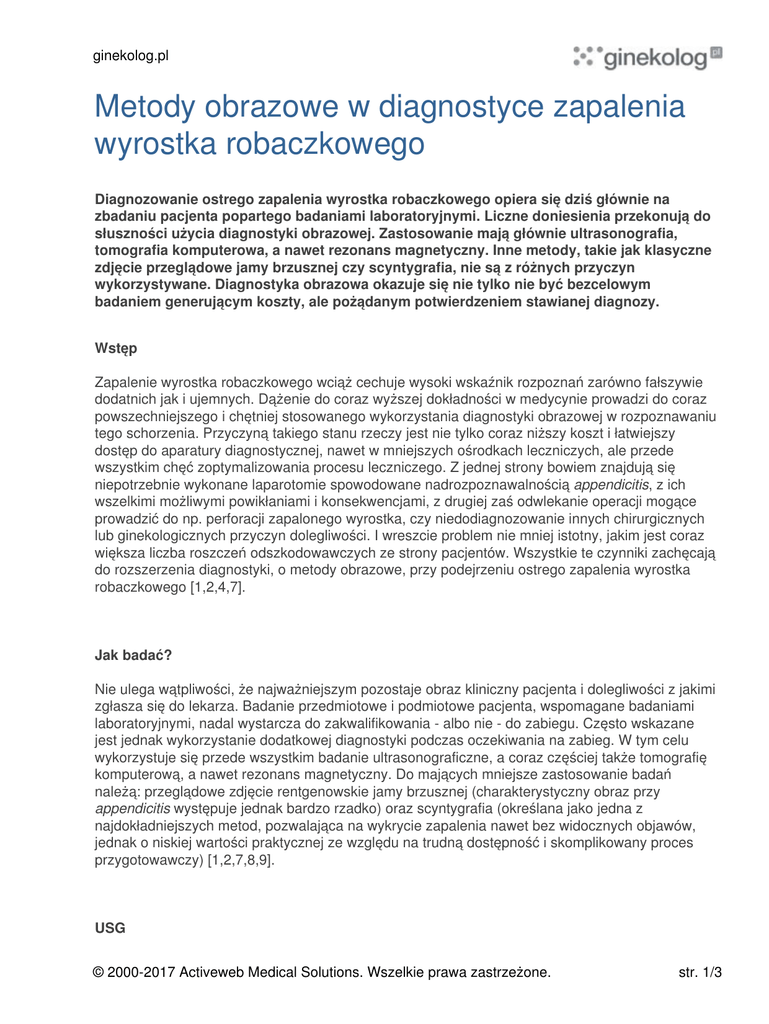ginekolog.pl Metody obrazowe w diagnostyce zapalenia wyrostka robaczkowego Diagnozowanie ostrego zapalenia wyrostka robaczkowego opiera się dziś głównie na zbadaniu pacjenta popartego badaniami laboratoryjnymi. Liczne doniesienia przekonują do słuszności użycia diagnostyki obrazowej. Zastosowanie mają głównie ultrasonografia, tomografia komputerowa, a nawet rezonans magnetyczny. Inne metody, takie jak klasyczne zdjęcie przeglądowe jamy brzusznej czy scyntygrafia, nie są z różnych przyczyn wykorzystywane. Diagnostyka obrazowa okazuje się nie tylko nie być bezcelowym badaniem generującym koszty, ale pożądanym potwierdzeniem stawianej diagnozy. Wstęp Zapalenie wyrostka robaczkowego wciąż cechuje wysoki wskaźnik rozpoznań zarówno fałszywie dodatnich jak i ujemnych. Dążenie do coraz wyższej dokładności w medycynie prowadzi do coraz powszechniejszego i chętniej stosowanego wykorzystania diagnostyki obrazowej w rozpoznawaniu tego schorzenia. Przyczyną takiego stanu rzeczy jest nie tylko coraz niższy koszt i łatwiejszy dostęp do aparatury diagnostycznej, nawet w mniejszych ośrodkach leczniczych, ale przede wszystkim chęć zoptymalizowania procesu leczniczego. Z jednej strony bowiem znajdują się niepotrzebnie wykonane laparotomie spowodowane nadrozpoznawalnością appendicitis, z ich wszelkimi możliwymi powikłaniami i konsekwencjami, z drugiej zaś odwlekanie operacji mogące prowadzić do np. perforacji zapalonego wyrostka, czy niedodiagnozowanie innych chirurgicznych lub ginekologicznych przyczyn dolegliwości. I wreszcie problem nie mniej istotny, jakim jest coraz większa liczba roszczeń odszkodowawczych ze strony pacjentów. Wszystkie te czynniki zachęcają do rozszerzenia diagnostyki, o metody obrazowe, przy podejrzeniu ostrego zapalenia wyrostka robaczkowego [1,2,4,7]. Jak badać? Nie ulega wątpliwości, że najważniejszym pozostaje obraz kliniczny pacjenta i dolegliwości z jakimi zgłasza się do lekarza. Badanie przedmiotowe i podmiotowe pacjenta, wspomagane badaniami laboratoryjnymi, nadal wystarcza do zakwalifikowania - albo nie - do zabiegu. Często wskazane jest jednak wykorzystanie dodatkowej diagnostyki podczas oczekiwania na zabieg. W tym celu wykorzystuje się przede wszystkim badanie ultrasonograficzne, a coraz częściej także tomografię komputerową, a nawet rezonans magnetyczny. Do mających mniejsze zastosowanie badań należą: przeglądowe zdjęcie rentgenowskie jamy brzusznej (charakterystyczny obraz przy appendicitis występuje jednak bardzo rzadko) oraz scyntygrafia (określana jako jedna z najdokładniejszych metod, pozwalająca na wykrycie zapalenia nawet bez widocznych objawów, jednak o niskiej wartości praktycznej ze względu na trudną dostępność i skomplikowany proces przygotowawczy) [1,2,7,8,9]. USG © 2000-2017 Activeweb Medical Solutions. Wszelkie prawa zastrzeżone. str. 1/3 ginekolog.pl Jest to bez wątpienia badanie, które ma bardzo mocną pozycję i wielu zwolenników ze względu na szeroką dostępność, niski koszt i nieinwazyjność. Te cechy są szczególnie przydatne u dzieci i kobiet w ciąży (lub z prawdopodobieństwem ciąży), gdzie narażenie na promieniowanie jonizujące nie jest bez znaczenia. Dokładność diagnostyczna kształtuje się na poziomie 71 do 97 proc., w zależności od umiejętności badającego. Prawidłowy wyrostek robaczkowy w USG widoczny jest jako ślepo zakończona, tubularna struktura nie posiadająca perystaltyki, o grubości ściany do 2 mm i średnicy nieprzekraczającej 6-7 mm. Wyrostek zapalny posiada natomiast następujące cechy: pogrubiałą ścianę, średnicę przekraczającą 6-7 mm, światło wypełnione płynem. Ponadto występuje ból przy ucisku głowicą, brak odkształcania wyrostka przy ucisku, a także płyn wokół wyrostka mogący sugerować jego perforację. W jednym z badań przeprowadzonym na pacjentach pediatrycznych, zgłaszających się do szpitala z powodu podejrzenia ostrego zapalenia wyrostka robaczkowego, porównano dokładność diagnostyki stosując jedynie objawy kliniczne - w jednej grupie, z diagnostyką dodatkowo wykorzystującą USG - w drugiej grupie. Zastosowanie ultrasonografii pozwoliło zredukować liczbę wykonanych appendektomii z 75,5 do 70,6 proc. Ponadto badanie wykazało wysoką swoistość zastosowania USG (90,7 w porównaniu do 70,47 proc. bez USG). Wartość predykcyjna dodatnia ultrasonografii wyniosła 95,72 proc., a wartość predykcyjna ujemna 100 proc. Zastosowanie dodatkowo diagnostyki obrazowej w postaci USG pomaga zatem zredukować liczbę niepotrzebnie wykonanych appendektomii. Podobne wyniki uzyskiwano również w innych doniesieniach, dotyczących także pacjentów dorosłych [1,2,3,4,5,8]. Jeśli nie USG, to co? Niekiedy zastosowanie ultrasonografii nie daje odpowiedzi, czy mamy do czynienia z zapaleniem wyrostka czy nie. W takiej sytuacji pomocna może się okazać tomografia komputerowa. Jest to badanie dużo bardziej dokładne i cechujące się wyższą powtarzalnością w stosunku do USG. Wskaźnik dokładności diagnostycznej wynosi od 93 do 98 proc. Najczęściej podczas badania stosowano kontrast podawany dożylnie, doustnie lub przezodbytniczo. Pozwalało to ułatwić wizualizację wyrostka, a tym samym zwiększyć skuteczność badania. Obraz zapalnego wyrostka kształtuje się podobnie jak w przypadku stosowania metody USG, czyli pogrubienie ściany, poszerzenie średnicy powyżej 6mm, mocniejsze wykontrastowanie ściany wyrostka. Dodatkowo CT pozwala uwidocznić także zajęcie procesem zapalnym okolicy około-wyrostkowej, ropień, wolny płyn i pęcherzyki powietrza. Ponadto badanie tomograficzne pozwala na, nie tylko wykluczenie appendicitis, ale też wykrycie innej przyczyny dolegliwości pacjenta - jak np. zapalenie uchyłków czy torbieli jajnika i podjęcie stosownych kroków celem wyleczenia pacjenta [2,4,5,6,7,8]. Nie ma róży bez kolców Niestety liczne zalety i dokładność badania