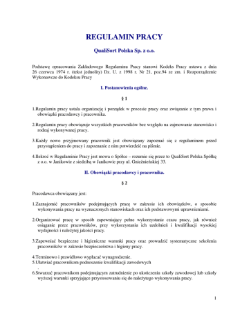 REGULAMIN PRACY QualiSort Polska Sp. z o.o. Podstawę opracowania Zakładowego Regulaminu Pracy stanowi Kodeks Pracy ustawa z dnia 26 czerwca 1974 r. (tekst jednolity) Dz. U. z 1998 r. Nr 21, poz.94 ze zm. i Rozporządzenie Wykonawcze do Kodeksu Pracy I. Postanowienia ogólne. §1 1.Regulamin pracy ustala organizację i porządek w procesie pracy oraz związanie z tym prawa i obowiązki pracodawcy i pracownika. 2.Regulamin pracy obowiązuje wszystkich pracowników bez względu na zajmowanie stanowisko i rodzaj wykonywanej pracy. 3.Każdy nowo przyjmowany pracownik jest obowiązany zapoznać się z regulaminem przed przystąpieniem do pracy i zapoznanie z nim potwierdzić na piśmie. 4.Ilekroć w Regulaminie Pracy jest mowa o Spółce – rozumie się przez to QualiSort Polska Spółkę z o.o. w Janikowie z siedzibą w Janikowie przy ul. Gnieźnieńskiej 33. II. Obowiązki pracodawcy i pracownika. §2 Pracodawca obowiązany jest: 1.Zaznajomić pracowników podejmujących pracę w zakresie ich obowiązków, o sposobie wykonywania pracy na wyznaczonych stanowiskach oraz ich podstawowymi uprawnieniami. 2.Organizować pracę w sposób zapewniający pełne wykorzystanie czasu pracy, jak również osiąganie przez pracowników, przy wykorzystaniu ich uzdolnień i kwalifikacji wysokiej wydajności i należytej jakości pracy. 3.Zapewniać bezpieczne i higieniczne warunki pracy oraz prowadzić systematyczne szkolenia pracowników w zakresie bezpieczeństwa i higieny pracy. 4.Terminowo i prawidłowo wypłacać wynagrodzenie. 5.Ułatwiać pracownikom podnoszenie kwalifikacji zawodowych . 6.Stwarzać pracownikom podejmującym zatrudnienie po ukończeniu szkoły zawodowej lub szkoły wyższej warunki sprzyjające przystosowaniu się do należytego wykonywania pracy. 1 7.Zaspokajać w miarę posiadanych środków socjalne potrzeby pracowników. 8.Stosować obiektywne i sprawiedliwe kryteria oceny pracowników oraz wyników ich pracy. 9.Prowadzić dokumentację w sprawach związanych ze stosunkiem pracy oraz akta osobowe pracownika. 10. Wpływać na kształtowanie w Spółce właściwych zasad współżycia społecznego. 11. Pracodawca jest obowiązany zawrzeć z pracownikiem umowę o pracę na piśmie, zgodnie z obowiązującymi wymogami zawartymi w art. 29 § 1,2 i 3 Kodeksu pracy z wyraźnym określeniem rodzaju i warunków umowy, która w szczególności powinna określać: !rodzaj pracy i miejsce wykonywania oraz termin rozpoczęcia pracy, !wynagrodzenie odpowiadające rodzajowi pracy ze wskazaniem składników wynagrodzenia oraz wymiar czasu pracy. Jeżeli umowa o pracę nie została zawarta na piśmie, pracodawca powinien najpóźniej w dniu rozpoczęcia pracy przez pracownika, potwierdzić pracownikowi na piśmie rodzaj umowy i jej warunki. Pracodawca ponadto informuje pracownika w formie pisemnej, nie później niż w ciągu 7 dni od dnia zawarcia umowy, o obowiązującej dobowej i tygodniowej normie czasu pracy, częstotliwości wypłaty wynagrodzenia za pracę, urlopie wypoczynkowym oraz długości okresu wypowiedzenia umowy o pracę. Podstawowe obowiązki pracodawcy dotyczące bezpieczeństwa i higieny pracy oraz ochrony przeciwpożarowej, informowanie pracowników o ryzyku zawodowym, które wiąże się z wykonywaną pracą. 12.Pracodawca obowiązany jest: a) chronić zdrowie i życie pracowników poprzez zapewnienie bezpieczeństwa i higienicznych warunków pracy przy odpowiednim wykorzystaniu osiągnięć nauki i techniki, b) organizować pracę w sposób zapewniający bezpieczne i higieniczne warunki pracy, c) zapewniać przestrzeganie w Spółce przepisów oraz zasad bezpieczeństwa i higieny pracy, wydawać polecenia usunięcia uchybień w tym zakresie oraz kontrolować wykonanie tych poleceń, d) zapewniać wykonanie zaleceń Społecznego Inspektora Pracy, e) zapewniać, aby budowa lub przebudowa obiektu budowlanego, w którym przewiduje się pomieszczenia pracy, była wykonywana na podstawie projektów uwzględniających wymagania bezpieczeństwa i higieny pracy pozytywnie zaopiniowanych przez uprawnionych rzeczoznawców, zgodnie z odrębnymi przepisami, f) zapewniać , aby pomieszczenia pracy były odpowiednie do rodzaju wykonywanej pracy i liczby zatrudnionych pracowników, 2 g) zapewniać wykonanie nakazów, wystąpień, decyzji i zarządzeń wydawanych przez organy nadzoru nad warunkami pracy, h) utrzymać obiekty budowlane i pomieszczenia pracy, a także tereny i urządzenia z nim i związane w stanie zapewniającym bezpieczne i higieniczne warunki pracy, i) zapewnić, aby prace, przy których istnieje możliwość wystąpienia szczególnego zagrożenia dla zdrowia lub życia ludzkiego, były wykonywane przez co najmniej dwie osoby, w celu zapewnienia asekuracji, j) stosować środki zapobiegające chorobom zawodowym i innym chorobom związanym z wykonywaną pracą, w szczególności: !utrzymywać w stanie stałym sprawności urządzenia ograniczające i eliminujące szkodliwe dla zdrowia czynniki środowiska pracy, !przeprowadzać na swój koszt badania i pomiary czynników szkodliwych dla zdrowia, rejestrować i przechowywać wyniki tych badań i pomiarów oraz udostępniać je pracownikom. k) skierować nowoprzyjętego pracownika na wstępne badania lekarskie: wstępnym badaniom lekarskim podlegają pracownicy młodociani, przenoszeni na inne stanowiska pracy i inni pracownicy przenoszeni na stanowiska pracy, na których występują czynniki szkodliwe dla zdrowia lub warunki uciążliwe, okresowe i kontrolne badania lekarskie przeprowadza się w miarę możliwości w godzinach pracy, badania, o których wyżej mowa są przeprowadzane na koszt pracodawcy. l)zapewnić przeszkolenie pracownika w zakresie bezpieczeństwa i higieny pracy przed dopuszczeniem go do pracy oraz prowadzenie okresowych szkoleń w tym zakresie, obejmujące m.in. informowanie pracowników o ryzyku zawodowym, które wiąże się z wykonywaną pracą oraz o zasadach ochrony przed zagrożeniami, m) zaznajom