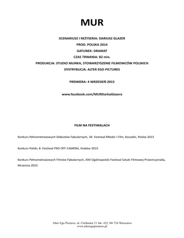 MUR SCENARIUSZ I REŻYSERIA: DARIUSZ GLAZER PROD. POLSKA 2014 GATUNEK: DRAMAT CZAS TRWANIA: 82 min. PRODUKCJA: STUDIO MUNKA, STOWARZYSZENIE FILMOWCÓW POLSKICH DYSTRYBUCJA: ALTER EGO PICTURES PREMIERA: 4 WRZESIEŃ 2015 www.facebook.com/MURDarkaGlazera FILM NA FESTIWALACH Konkurs Pełnometrażowych Debiutów Fabularnych, 34. Festiwal Młodzi i Film, Koszalin, Polska 2015 Konkurs Polski, 8. Festiwal PKO OFF CAMERA, Kraków 2015 Konkurs Pełnometrażowych Filmów Fabularnych, XXII Ogólnopolski Festiwal Sztuki Filmowej Prowincjonalia, Września 2015 Alter Ego Pictures, ul. Chełmska 21 lok. 422, 00-724 Warszawa www.alteregopictures.pl OBSADA: Mariusz Tomasz Schuchardt Matka Aleksandra Konieczna Dziewczyna Marta Nieradkiewicz Piotrek „Młody” Krzysztof Olszewski matka Agaty Ewa Telega sąsiadka Ewa Kolasińska Ewa Ewa Kasprzyk lekarz Piotr Machalica Bolek Rafał Maćkowiak EKIPA: Scenariusz i reżyseria: Dariusz Glazer Zdjęcia: Wojciech Staroń Montaż: Jarosław Kamiński, Mateusz Romaszkan Scenografia: Anna Wunderlich Kostiumy: Natalia Czeczott Charakteryzacja: Janusz Kaleja Dźwięk: Maria Chilarecka Kierownictwo Produkcji: Sylwia Rajdaszka Opieka artystyczna: Joanna Kos-Krauze, Edward Żebrowski Produkcja: Studio Munka, Stowarzyszenie Filmowców Polskich Koprodukcja: Telewizja Polska Dystrybucja: Alter Ego Pictures Projekt współfinansowany przez Polski Instytut Sztuki Filmowej Alter Ego Pictures, ul. Chełmska 21 lok. 422, 00-724 Warszawa www.alteregopictures.pl O FILMIE Ten mur nie rzuca się w oczy. Jest prawie niewidzialny. Zwłaszcza dla tych, którzy odgradzają nim swoje strzeżone osiedla od tych wszystkich, z którymi nie chcą mieć nic do czynienia. Po drugiej stronie muru, w ciasnym mieszkaniu, z chorą na depresję matką mieszka Mariusz (Tomasz Schuchardt). Na życie zarabia remontowaniem mieszkań w tych „lepszych” dzielnicach. Marzy, że kiedyś zamieszka w jednym z nich – i konsekwentnie do tego dąży, zarabiając pieniądze legalnie i nielegalnie. Wierzy, że może przekroczyć mur – być jednym z lokatorów apartamentowca, mieć miejsce w podziemnym garażu i robić zakupy w luksusowym centrum handlowym. To synonim innego, lepszego życia, w którym nie jest się niewidzialnym. Plan się udaje – odłożone pieniądze wystarczają na wynajem dobrego mieszkania. Z czystą klatką schodową, błyszczącą windą i atrakcyjną sąsiadką (Marta Nieradkiewicz). Wieczór przy winie dobrze rokuje – ona, córka dewelopera, samotna matka wydaje się nie widzieć żadnego muru. Ale on powróci – już zaraz. Przy spotkaniu z jej rodzicami, pierwszej selekcji do warszawskiego klubu, telefonie w sprawie matki, która po wylewie wymaga stałej opieki. W starym, ciasnym mieszkaniu. Sen się urywa, wraca rzeczywistość, w której Mariusz będzie musiał na nowo ustawić priorytety, zastanowić się kim jest i czego chce. I po raz kolejny zmierzyć się z murem wokół siebie. Pełnometrażowy debiut Dariusza Glazera to niemal przypowieść, ale pozbawiona morału. Reżyser podejmuje zaniedbywany problem kastowości społeczeństwa, które mimo rozmaitych -izmów (socjalizmu, kapitalizmu, liberalizmu) wciąż ma się dobrze, segregując społeczeństwo i determinując los na podstawie urodzenia. W małej historii przegląda się rozległy społeczny problem – tym lepiej widoczny, kiedy nada się mu osobisty wymiar. EKSPLIKACJA REŻYSERSKA W filmie chciałem przedstawić coraz bardziej jaskrawe zjawisko podziału społeczeństwa na dwie części – bogatą i biedną. Akcja scenariusza toczy się między nowoczesnym, zamkniętym osiedlem apartamentowców, a starą postkomunistyczną zabudową dużego miasta. Elementem łączącym te dwa światy jest postać mieszkającego z chorą matką Mariusza, który ciężko pracuje przy wykańczaniu mieszkań, żeby zdobyć pieniądze na przeprowadzkę. Bohater opuszcza matkę i wynajmuje mieszkanie na nowym osiedlu, stając się tym samym według własnego mniemania kimś bardziej normalnym. Mario szybko przekonuje się jednak o istnieniu tytułowego „Muru”. Przykra rzeczywistość nie pozwoli mu tak łatwo na ucieczkę – bohater uświadamia sobie, że nie może stać się kimś innym, dopóki nie poukłada wszystkich spraw w swoim dotychczasowym życiu. Pisząc scenariusz korzystałem z własnych doświadczeń i obserwacji. Inspiracją była też książka Zygmunta Baumana „Płynna nowoczesność” – ona uświadomiła mi, że staram się zobrazować coś istotnego i aktualnego nie tylko dla mnie. Uznałem, że najlepiej opowiem tę historię dzięki utrzymaniu jej w skromnym, paradokumentalnym stylu znanym z filmów Patrice’a Cherau czy Braci Dardenne. Alter Ego Pictures, ul. Chełmska 21 lok. 422, 00-724 Warszawa www.alteregopictures.pl BIOGRAFIE AKTORÓW PIERWSZOPLANOWYCH TOMASZ SCHUCHARDT - w 2009 roku ukończył krakowską PWST. Laureat m.in. III Nagrody Aktorskiej za rolę Eugeniusza Siergiejewicza Dorna w przedstawieniu "Mewa" na XXVII Festiwalu Szkół Teatralnych w Łodzi, Nagrody im. Andrzeja Nardellego za najlepszy debiut na scenach teatrów dramatycznych w roku 2010, Nagrody za pierwszoplanową rolę męską w filmie „Chrzest” na FPFF Gdynia 2010, Nagrody za drugoplanową rolę męską w filmie „Jesteś bogiem” na FPFF Gdynia 2012. W latach 2010-2014 występował w Teatrze im. Jaracza w Łodzi. Od roku 2014 jest aktorem Teatru Ateneum w Warszawie. ALEKSANDRA KONIECZNA - W 1988 roku ukończyła Państwową Wyższą Szkołę Teatralną im. Aleksandra Zelwerowicza w Warszawie. Jeszcze w czasie studiów zagrała w szkolnych przedstawieniach przygotowanych na podstawie dzieł Stanisława Ignacego Witkiewicza przez opiekuna jej roku, Jana Englerta. Spektakle zostały następnie pokazane w warszawskim Teatrze Polskim. W „Bezimiennym dziele” (1987) aktorka wystąpiła w roli Róży, w „Onych” (1989) stworzyła postać Spiki. Aktorka teatrów warszawskich: w latach 1988-90 występowała w Te