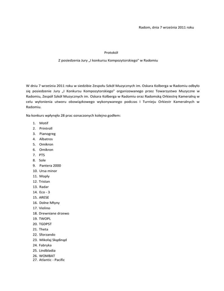 Radom, dnia 7 września 2011 roku Protokół Z posiedzenia Jury „I konkursu Kompozytorskiego" w Radomiu W dniu 7 września 2011 roku w siedzibie Zespołu Szkół Muzycznych im. Oskara Kolberga w Radomiu odbyło się posiedzenie Jury „I Konkursu Kompozytorskiego" organizowanego przez Towarzystwo Muzyczne w Radomiu, Zespół Szkół Muzycznych im. Oskara Kolberga w Radomiu oraz Radomską Orkiestrę Kameralną w celu wyłonienia utworu obowiązkowego wykonywanego podczas I Turnieju Orkiestr Kameralnych w Radomiu. Na konkurs wpłynęło 28 prac oznaczonych kolejno godłem: 1. Motif 2. Printroll 3. Pianogreg 4. Albatros 5. Omikron 6. Omikron 7. PTS 8. Sole 9. Pantera 2000 10. Ursa minor 11. Moply 12. Tristan 13. Radar 14. Eco - 3 15. ARESE 16. Dolne Młyny 17. Violino 18. Drewniane drzewo 19. TWOPL 20. TGDPST 21. Theta 22. Sforzando 23. Mikołaj Skądinąd 24. Fabryka 25. Lindbladia 26. WOMBAT 27. Atlantic - Pacific 28. Lynx lynx Jury w składzie: 1. Prof. Stanisław Moryto (Uniwersytet Muzyczny Fryderyka Chopina w Warszawie - przewodniczący 2. Prof. Eugeniusz Knapik (Akademia Muzyczna w Katowicach) 3. Maciej Żółtowski (Radomska Orkiestra Kameralna) zgodnie z regulaminem Konkursu postanowiło po wnikliwej dyskusji przyznad nagrodę ufundowaną przez Stowarzyszenie Autorów ZAiKS w wysokości 5 000,00 zł oraz prawykonanie utworu podczas I Turnieju Orkiestr Kameralnych w Radomiu, utworowi godło „Sforzando" (Nr 22). Autorem nagrodzonego utworu jest: Natalia Cherniy - Wrocław