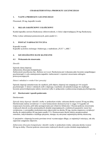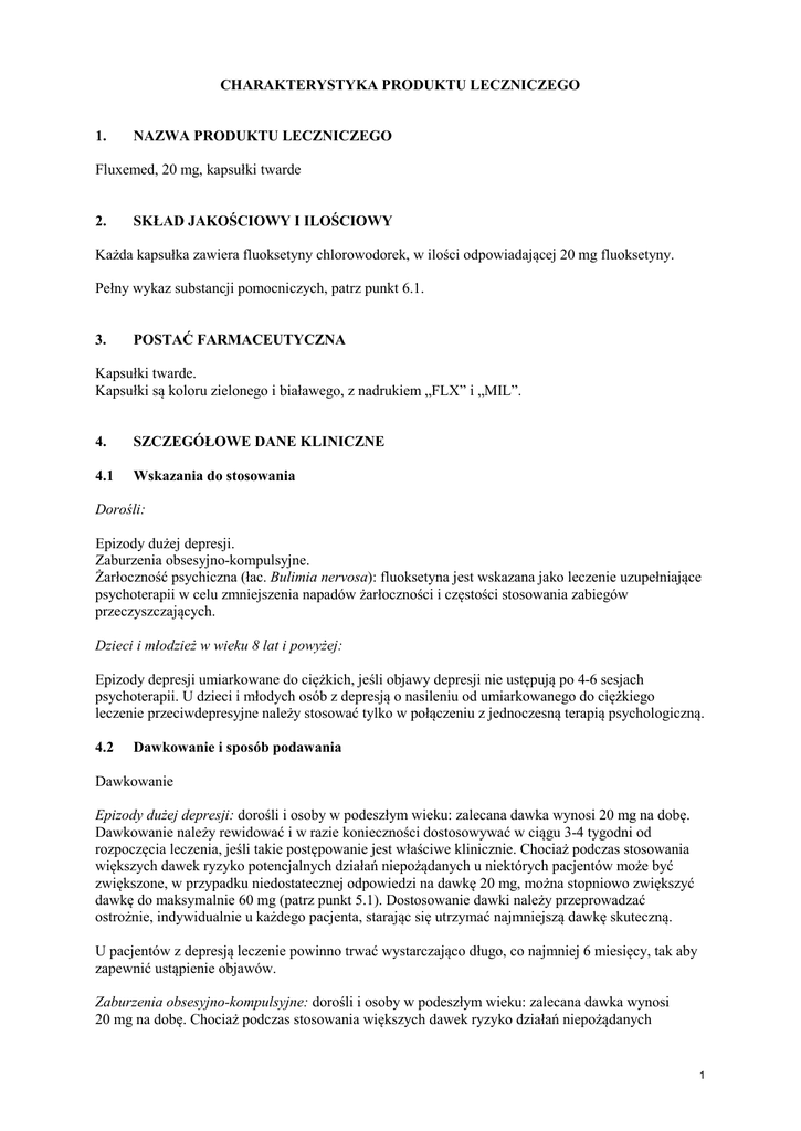CHARAKTERYSTYKA PRODUKTU LECZNICZEGO 1. NAZWA PRODUKTU LECZNICZEGO Fluxemed, 20 mg, kapsułki twarde 2. SKŁAD JAKOŚCIOWY I ILOŚCIOWY Każda kapsułka zawiera fluoksetyny chlorowodorek, w ilości odpowiadającej 20 mg fluoksetyny. Pełny wykaz substancji pomocniczych, patrz punkt 6.1. 3. POSTAĆ FARMACEUTYCZNA Kapsułki twarde. Kapsułki są koloru zielonego i białawego, z nadrukiem „FLX” i „MIL”. 4. SZCZEGÓŁOWE DANE KLINICZNE 4.1 Wskazania do stosowania Dorośli: Epizody dużej depresji. Zaburzenia obsesyjno-kompulsyjne. Żarłoczność psychiczna (łac. Bulimia nervosa): fluoksetyna jest wskazana jako leczenie uzupełniające psychoterapii w celu zmniejszenia napadów żarłoczności i częstości stosowania zabiegów przeczyszczających. Dzieci i młodzież w wieku 8 lat i powyżej: Epizody depresji umiarkowane do ciężkich, jeśli objawy depresji nie ustępują po 4-6 sesjach psychoterapii. U dzieci i młodych osób z depresją o nasileniu od umiarkowanego do ciężkiego leczenie przeciwdepresyjne należy stosować tylko w połączeniu z jednoczesną terapią psychologiczną. 4.2 Dawkowanie i sposób podawania Dawkowanie Epizody dużej depresji: dorośli i osoby w podeszłym wieku: zalecana dawka wynosi 20 mg na dobę. Dawkowanie należy rewidować i w razie konieczności dostosowywać w ciągu 3-4 tygodni od rozpoczęcia leczenia, jeśli takie postępowanie jest właściwe klinicznie. Chociaż podczas stosowania większych dawek ryzyko potencjalnych działań niepożądanych u niektórych pacjentów może być zwiększone, w przypadku niedostatecznej odpowiedzi na dawkę 20 mg, można stopniowo zwiększyć dawkę do maksymalnie 60 mg (patrz punkt 5.1). Dostosowanie dawki należy przeprowadzać ostrożnie, indywidualnie u każdego pacjenta, starając się utrzymać najmniejszą dawkę skuteczną. U pacjentów z depresją leczenie powinno trwać wystarczająco długo, co najmniej 6 miesięcy, tak aby zapewnić ustąpienie objawów. Zaburzenia obsesyjno-kompulsyjne: dorośli i osoby w podeszłym wieku: zalecana dawka wynosi 20 mg na dobę. Chociaż podczas stosowania większych dawek ryzyko działań niepożądanych 1 u niektórych pacjentów może być zwiększone, w przypadku niedostatecznej po 2 tygodniach odpowiedzi na dawkę 20 mg, można stopniowo zwiększyć dawkę do maksymalnie 60 mg. Jeżeli nie obserwuje się poprawy w ciągu 10 tygodni, należy ponownie rozważyć zasadność leczenia fluoksetyną. W przypadku uzyskania korzystnej odpowiedzi terapeutycznej, leczenie można kontynuować w dawce dostosowanej do indywidualnych potrzeb pacjenta. Mimo braku systematycznych badań pozwalających odpowiedzieć na pytanie, jak długo należy stosować leczenie fluoksetyną, ze względu na przewlekły charakter zaburzeń obsesyjno-kompulsyjnych wydaje się, że u pacjentów wykazujących odpowiedź terapeutyczną kontynuacja leczenia ponad 10 tygodni jest uzasadniona. Dostosowanie dawki należy przeprowadzać ostrożnie, indywidualnie u każdego pacjenta, starając się utrzymać najmniejszą dawkę skuteczną. Należy okresowo oceniać konieczność dalszego leczenia. Niektórzy lekarze zalecają równoczesne stosowanie psychoterapii behawioralnej u pacjentów, którzy dobrze reagują na leczenie farmakologiczne. Nie wykazano długotrwałej (powyżej 24 tygodni) skuteczności leczenia zaburzeń obsesyjnokompulsyjnych. Bulimia nervosa: dorośli i osoby w podeszłym wieku: zalecana dawka wynosi 60 mg/dobę. Nie wykazano długotrwałej skuteczności (powyżej 3 miesięcy) w leczeniu żarłoczności psychicznej. Dorośli – wszystkie wskazania: zalecana dawka może być zwiększana lub zmniejszana. Dawki powyżej 80 mg na dobę nie były systematycznie oceniane. Po przerwaniu podawania, substancje czynne utrzymują się w ustroju przez kilka tygodni. Należy to uwzględnić w przypadku rozpoczynania lub przerywania leczenia. Dzieci i młodzież w wieku 8 lat i powyżej (epizody depresji umiarkowane do ciężkich): leczenie należy rozpoczynać pod nadzorem specjalisty, on też powinien je monitorować. Dawka początkowa wynosi 10 mg. Dawkę należy dostosowywać ostrożnie, indywidualnie u każdego pacjenta, starając się utrzymać najmniejszą dawkę skuteczną. Po 1-2 tygodniach dawkę można zwiększyć do 20 mg/dobę. Doświadczenie z badań klinicznych dotyczące dawek dobowych większych niż 20 mg jest minimalne. Dane dotyczące leczenia trwającego powyżej 9 tygodni są ograniczone. Dzieci o mniejszej masie ciała: ze względu na większe stężenia w osoczu u dzieci o mniejszej masie ciała, działanie terapeutyczne można uzyskać po zastosowaniu mniejszych dawek (patrz punkt 5.2). U pacjentów pediatrycznych, którzy odpowiadają na leczenie, po upływie 6 miesięcy należy ocenić konieczność dalszego leczenia. Jeżeli po 9 tygodniach nie występuje poprawa kliniczna, należy ponownie rozważyć konieczność leczenia. Osoby starsze: zalecana jest ostrożność podczas zwiększania dawki, a dawka dobowa nie powinna na ogół być większa niż 40 mg. Zalecana maksymalna dawka wynosi 60 mg na dobę. U pacjentów z zaburzeniami czynności wątroby (patrz punkt 5.2) lub u pacjentów przyjmujących jednocześnie leki, które mogą potencjalnie wykazywać interakcje z fluoksetyną (patrz punkt 4.5) należy rozważyć zmniejszenie dawki lub częstości podawania produktu (np. 20 mg co drugi dzień). Objawy odstawienia obserwowane po przerwaniu stosowania fluoksetyny: należy unikać nagłego przerywania leczenia. Jeśli leczenie fluoksetyną ma być przerwane, należy stopniowo zmniejszać dawkę przez okres co najmniej 2 tygodni, aby zmniejszyć ryzyko reakcji odstawienia (patrz punkt 4.4 i punkt 4.8). Jeżeli po zmniejszeniu dawki albo po przerwaniu leczenia występują objawy, których pacjent nie toleruje, należy rozważyć powrót do poprzedniego dawkowania. Następnie lekarz może rozważyć ponownie zmniejszenie dawki, ale bardziej stopniowe. 2 Sposób 