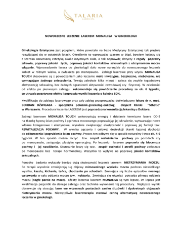 NOWOCZESNE LECZENIE LASEREM MONALIISA W GINEKOLOGII Ginekologia Estetyczna jest pojęciem, które powstało na bazie Medycyny Estetycznej tak prężnie rozwijającej się w ostatnich latach. Określenie to wprowadza czasem w błąd, bowiem kojarzy się z szeroko rozumianą estetyką okolic intymnych ciała, a tak naprawdę dotyczy z reguły poprawy zdrowia, poprawy jakości życia, poprawy jakości kontaktów seksualnych z utrzymaniem moczu włącznie. Wprowadzenie lasera do ginekologii dało nowe narzędzie do nowoczesnego leczenia kobiet w różnym wieku, a zwłaszcza po menopauzie. Zabiegi laserowe przy użyciu MONALISA TOUCH stosowane są z powodzeniem jako leczenie mało inwazyjne, bezpieczne, niebolesne, nie wymagające żadnego znieczulenia. Trwają zaledwie kilka minut i zaleca się zwykle tygodniową abstynencję seksualną, bez żadnych ograniczeo aktywności zawodowej czy fizycznej. W zależności od efektu po pierwszym zabiegu rekomenduje się powtórzenie procedury za ok. 6 tygodni, co utrwala pozytywne efekty i poprawia wyniki leczenia o kolejne 50%. Kwalifikację do zabiegu laserowego oraz cały zabieg przeprowadza doświadczony lekarz dr n. med. BOHDAN DŹWIGAŁA - specjalista położnik-ginekolog-onkolog, ekspert Kliniki "Sthetic" w Warszawie. Procedura leczenia LASEREM jest poprzedzona konsultacją lekarską u Doktora. Zabiegi laserowe MONALISA TOUCH wykorzystują energię i działanie termiczne lasera CO-2 na tkankę łączną ścian pochwy i pęcherza moczowego poprawiając jej ukrwienie, wytwarzając nowe włókna kolagenowe i elastynowe, wyraźnie zwiększając elastycznośd i poprawę jej funkcji tzw. REWITALIZACJA POCHWY. W wyniku ogrzania i celowej destrukcji tkanki łącznej dochodzi do obkurczenia i pogrubienia ścian pochwy. Proces ten odbywa się w sposób naturalny i trwa ok. 4-6 tygodni. W ten sposób można leczyd tzw. zespół rozluźnienia pochwy po porodach czy po menopauzie, zastępując plastykę operacyjną. Po leczeniu laserem poprawia się biocenoza pochwy i jej nawilżenie. Skutecznie leczy się tzw. zespół suchości i atrofii pochwy zwłaszcza po menopauzie bez terapii hormonalnej. Wszystko to wpływa na poprawę jakości kontaktów seksualnych. Ponadto badania wykazały bardzo dużą skutecznośd leczenia laserem NIETRZYMANIA MOCZU. Po terapii wyraźnie zmniejszają się objawy mimowolnego wycieku moczu podczas niewielkiego wysiłku, kaszlu, kichania, taoca, chodzeniu po schodach. Zmniejsza się liczba epizodów nocnego wstawania w celu oddania moczu tzw. nokturia. Zmniejsza się również potrzeba pilnego oddania moczu (nagłe parcie na mocz). Efekty leczenia laserem MONALISA są tym lepsze, im lepsza jest kwalifikacja pacjentki do danego zabiegu oraz technika wykonania tej procedury. Najlepsze wyniki obserwuje się stosując laser we wczesnych postaciach zaniku śluzówki i dyskretnych objawach nietrzymania moczu. Niewątpliwie laseroterapia stanowi cenną alternatywę nowoczesnego leczenia w ginekologii.
