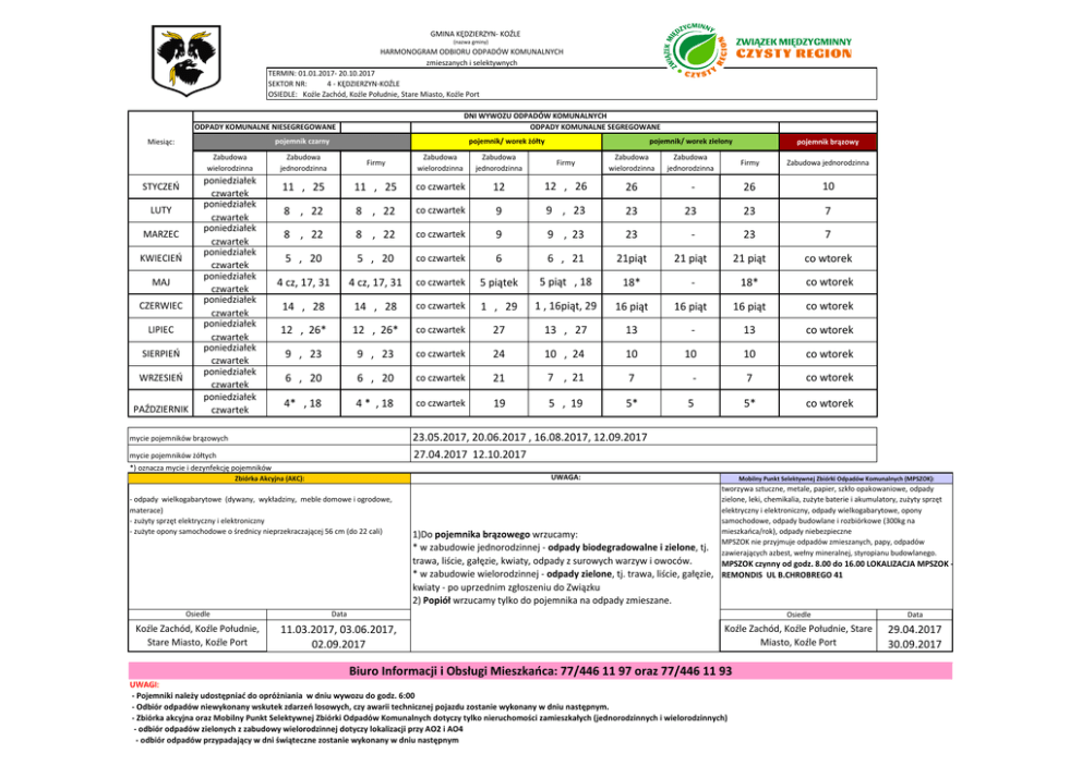 GMINA KĘDZIERZYN- KOŹLE (nazwa gminy) HARMONOGRAM ODBIORU ODPADÓW KOMUNALNYCH zmieszanych i selektywnych TERMIN: 01.01.2017- 20.10.2017 SEKTOR NR: 4 - KĘDZIERZYN-KOŹLE OSIEDLE: Koźle Zachód, Koźle Południe, Stare Miasto, Koźle Port DNI WYWOZU ODPADÓW KOMUNALNYCH ODPADY KOMUNALNE SEGREGOWANE ODPADY KOMUNALNE NIESEGREGOWANE pojemnik czarny Miesiąc: Zabudowa wielorodzinna STYCZEO LUTY MARZEC KWIECIEO MAJ CZERWIEC LIPIEC SIERPIEO WRZESIEO PAŹDZIERNIK poniedziałek czwartek poniedziałek czwartek poniedziałek czwartek poniedziałek czwartek poniedziałek czwartek poniedziałek czwartek poniedziałek czwartek poniedziałek czwartek poniedziałek czwartek poniedziałek czwartek Zabudowa jednorodzinna pojemnik/ worek żółty pojemnik/ worek zielony Firmy Zabudowa wielorodzinna Zabudowa jednorodzinna Firmy Zabudowa wielorodzinna 11 , 25 11 , 25 co czwartek 12 12 , 26 26 8 , 22 8 , 22 co czwartek 9 9 , 23 8 , 22 8 , 22 co czwartek 9 5 , 20 5 , 20 co czwartek 4 cz, 17, 31 4 cz, 17, 31 14 , 28 Zabudowa jednorodzinna pojemnik brązowy Firmy Zabudowa jednorodzinna - 26 10 23 23 23 7 9 , 23 23 - 23 7 6 6 , 21 21piąt 21 piąt 21 piąt co wtorek co czwartek 5 piątek 5 piąt , 18 18* - 18* co wtorek 14 , 28 co czwartek 1 , 29 1 , 16piąt, 29 16 piąt 16 piąt 16 piąt co wtorek 12 , 26* 12 , 26* co czwartek 27 13 , 27 13 - 13 co wtorek 9 , 23 9 , 23 co czwartek 24 10 , 24 10 10 10 co wtorek 6 , 20 6 , 20 co czwartek 21 7 , 21 7 - 7 co wtorek 4* , 18 4 * , 18 co czwartek 19 5 , 19 5* 5 5* co wtorek 23.05.2017, 20.06.2017 , 16.08.2017, 12.09.2017 27.04.2017 12.10.2017 mycie pojemników brązowych mycie pojemników żółtych *) oznacza mycie i dezynfekcję pojemników UWAGA: Zbiórka Akcyjna (AKC): - odpady wielkogabarytowe (dywany, wykładziny, meble domowe i ogrodowe, materace) - zużyty sprzęt elektryczny i elektroniczny - zużyte opony samochodowe o średnicy nieprzekraczającej 56 cm (do 22 cali) Mobilny Punkt Selektywnej Zbiórki Odpadów Komunalnych (MPSZOK): tworzywa sztuczne, metale, papier, szkło opakowaniowe, odpady zielone, leki, chemikalia, zużyte baterie i akumulatory, zużyty sprzęt elektryczny i elektroniczny, odpady wielkogabarytowe, opony samochodowe, odpady budowlane i rozbiórkowe (300kg na mieszkaoca/rok), odpady niebezpieczne MPSZOK nie przyjmuje odpadów zmieszanych, papy, odpadów zawierających azbest, wełny mineralnej, styropianu budowlanego. 1)Do pojemnika brązowego wrzucamy: * w zabudowie jednorodzinnej - odpady biodegradowalne i zielone, tj. trawa, liście, gałęzie, kwiaty, odpady z surowych warzyw i owoców. MPSZOK czynny od godz. 8.00 do 16.00 LOKALIZACJA MPSZOK * w zabudowie wielorodzinnej - odpady zielone, tj. trawa, liście, gałęzie, REMONDIS UL B.CHROBREGO 41 kwiaty - po uprzednim zgłoszeniu do Związku 2) Popiół wrzucamy tylko do pojemnika na odpady zmieszane. Osiedle Data Osiedle Data Koźle Zachód, Koźle Południe, Stare Miasto, Koźle Port 11.03.2017, 03.06.2017, 02.09.2017 Koźle Zachód, Koźle Południe, Stare Miasto, Koźle Port 29.04.2017 30.09.2017 Biuro Informacji i Obsługi Mieszkaoca: 77/446 11 97 oraz 77/446 11 93 UWAGI: - Pojemniki należy udostępniad do opróżniania w dniu wywozu do godz. 6:00 - Odbiór odpadów niewykonany wskutek zdarzeo losowych, czy awarii technicznej pojazdu zostanie wykonany w dniu następnym. - Zbiórka akcyjna oraz Mobilny Punkt Selektywnej Zbiórki Odpadów Komunalnych dotyczy tylko nieruchomości zamieszkałych (jednorodzinnych i wielorodzinnych) - odbiór odpadów zielonych z zabudowy wielorodzinnej dotyczy lokalizacji przy AO2 i AO4 - odbiór odpadów przypadający w dni świąteczne zostanie wykonany w dniu następnym