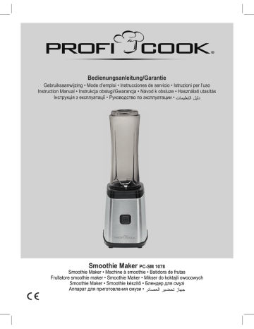 Bedienungsanleitung/Garantie *HEUXLNVDDQZLM]LQJ0RGHG¶HPSORL,QVWUXFFLRQHVGHVHUYLFLR,VWUX]LRQLSHUO¶XVR ,QVWUXFWLRQ0DQXDO,QVWUXNFMDREVáXJL*ZDUDQFMD1iYRGNREVOX]H+DV]QiODWLXWDVtWiV ȱɧɫɬɪɭɤɰɿɹɡɟɤɫɩɥɭɚɬɚɰɿʀɊɭɤɨɜɨɞɫɬɜɨɩɨɷɤɫɩɥɭɚɬɚɰɢɢ Smoothie Maker PC-SM 1078 6PRRWKLH0DNHU0DFKLQHjVPRRWKLH%DWLGRUDGHIUXWDV )UXOODWRUHVPRRWKLHPDNHU6PRRWKLH0DNHU0LNVHUGRNRNWDMOLRZRFRZ\FK 6PRRWKLH0DNHU6PRRWKLHNpV]tWĘȻɥɟɧɞɟɪɞɥɹɫɦɭɡɿ Ⱥɩɩɚɪɚɬɞɥɹɩɪɢɝɨɬɨɜɥɟɧɢɹɫɦɭɡɢ Übersicht der Bedienelemente 2YHU]LFKWYDQGHEHGLHQLQJVHOHPHQWHQ/LVWHGHVGLIIpUHQWVpOpPHQWVGHFRPPDQGH ,QGLFDFLyQGHORVHOHPHQWRVGHPDQHMR(OHPHQWLGLFRPDQGR2YHUYLHZRIWKH&RPSRQHQWV 3U]HJOąGHOHPHQWyZREáVXJL3ĜHKOHGVRXþiVWt$NH]HOĘHOHPHNiWWHNLQWpVH ɈɝɥɹɞɟɥɟɦɟɧɬɿɜɭɩɪɚɜɥɿɧɧɹɈɛɡɨɪɞɟɬɚɥɟɣɩɪɢɛɨɪɚ 3 Instrukcja obsługi Dziękujemy za wybór naszego produktu. Mamy nadzieję, że korzystanie z urządzenia sprawi Państwu radość. Symbole użyte w tej instrukcji obsługi Ważne informacje dotyczące bezpieczeństwa użytkownika są specjalnie wyróżnione. Koniecznie stosuj się do tych wskazówek, aby uniknąć wypadków i uszkodzenia urządzenia: OSTRZEŻENIE: 0TUS[FHBQS[FE[BHSPijFOJBNJEMB[ESPXJBJXTLBzuje na potencjalne ryzyka obrażeń. UWAGA: Wskazuje na potencjalne zagrożenia dla urządzenia lub innych przedmiotów. q WSKAZÓWKA: Wyróżnia porady i informacje ważne dla użytkownika. Spis treści Przegląd elementów obłsugi ...................................3 Uwagi ogólne ........................................................42 Specjalne wskazówki bezpieczeństwadla urządzenia.............................................................42 Wypakowanie urządzenia .....................................44 Przegląd elementów obłsugi / Zakres dostawy.....44 Użytkowanie ..........................................................44 Wskazówki i przepisy ............................................45 Czyszczenie ..........................................................46 Przechowywanie ...................................................46 Usuwanie usterek .................................................47 Dane techniczne ...................................................47 0HØMOFXBSVOLJHXBSBODKJ .....................................47 Usuwanie...............................................................47 Uwagi ogólne Przed uruchomieniem urządzenia proszę bardzo dokładnie przeczytać instrukcję obsługi. Proszę zachować ją wraz z kartą gwarancyjną, paragonem i w miarę możliwości również kartonem z opakowaniem wewnętrznym. Przekazując urządzenie innej osobie, oddaj jej także instrukcję obsługi. t 1SPT[ĥXZLPS[ZTUZXBĠVS[ğE[FOJFKFEZOJF dla prywatnego celu, jaki został przewidziany dla urządzenia. Urządzenie to nie zostało przewidziane do użytku w ramach działalności gospodarczej. t 1SPT[ĥOJFLPS[ZTUBĠ[VS[ğE[FOJBOB[FXOğUS[ Proszę trzymać urządzenie z daleka od ciepła, bezpośredniego promieniowania słonecznego, wilgoci (w żadnym wypadku nie zanurzać w substancjach płynnych) oraz ostrych krawędzi. Proszę nie obsługiwać urządzenia wilgotnymi dłońmi. Jeżeli urządzenie jest wilgotne lub mokre, proszę natychmiast wyciągnąć wtyczkę (należy ciągnąć za wtyczkę, nie za przewód). t /BMFijZSFHVMBSOJFTQSBXE[BĠD[ZVS[ğE[FOJF i kabel sieciowy nie są uszkodzone. W razie uszkodzenia należy przestać korzystać z urządzenia. t 1SPT[ĥTUPTPXBĠUZMLPPSZHJOBMOFBLDFTPSJB t %MBCF[QJFD[FĩTUXBE[JFDJQSPT[ĥOJF[PTUBXJBĠ swobodnie dostępnych części opakowania (torby plastikowe, kartony, styropian itp.). OSTRZEŻENIE! Nie pozwalaj dzieciom bawić się folią. Niebezpieczeństwo uduszenia! Specjalne wskazówki bezpieczeństwadla urządzenia OSTRZEŻENIE: t 3Z[ZLPTLBMFD[FOJB0TUS[FNJLTFSBKFTUPTUSF 42 OSTRZEŻENIE: t 1S[FEXZNJBOğBLDFTPSJØXMVCEPEBULPXZDID[ĥĭDJLUØSFQPSVszają się podczas pracy urządzenia, urządzenie należy wyłączyć i odłączyć od zasilania. t /JFOBMFijZEPUZLBĠQPSVT[BKğDZDITJĥD[ĥĭDJ t 1S[FEXğD[FOJFNVS[ğE[FOJBOBMFijZ[BXT[FTQSBXE[JĠD[ZBLDFsoria zostały trwale i bezpiecznie zamocowane. t ;BXT[FPEğD[BĠVS[ğE[FOJFPE[BTJMBOJBLJFEZKFTUQP[PTUBXJPOF bez nadzoru i przed montażem, demontażem lub czyszczeniem. t /JFOBQSBXJBĠVS[ğE[FOJBTBNPE[JFMOJF/BMFijZTLPOUBLUPXBĠTJĥ[ upoważnionym pracownikiem. Aby uniknąć zagrożenia, uszkodzony kabel zasilania powinien wymienić producent, pracownik naszego punktu obsługi klienta lub inny wykwalifikowany specjalista. t %[JFDJOJFNPHğLPS[ZTUBĠ[VS[ğE[FOJB t 5S[ZNBĠVS[ğE[FOJFJQS[FXØEQP[B[BTJĥHJFNE[JFDJ t %[JFDJOJFNPHğCBXJĠTJĥVS[ğE[FOJFN t 6S[ğE[FOJBNPHğCZĠVijZULPXBOFQS[F[PTPCZ[PHSBOJD[POZNJ zdolnościami fizycznymi, czuciowymi lub mentalnymi oraz bez doświadczenia i wiedzy w zakresie użytkowania, jeśli znajdują się pod nadzorem lub zostały poinstruowane odnośnie użytkowania urządzenia w bezpieczny sposób i rozumieją związane z tym ryzyko. t 6S[ğE[FOJBUFHPOJFXPMOP[BOVS[BĠXXPE[JFQPED[BTD[ZT[D[Fnia. Prosimy korzystać z instrukcji podanych w rozdziale „Czyszczenie”. t /JFVijZXBĠVS[ğE[FOJB[QVTUZNE[CBOLJFNEPNJFT[BOJB t /JFVijZXBĠUFHPVS[ğE[FOJBEVijFKOJijQS[F[TFLVOE/BTUĥQOJF pozostawić na ok. 60 sekund do schłodzenia przed ponownym jego włączeniem. 43 t 1SPTJNZOJFNBOJQVMPXBĠQS[ZXZğD[OJLBDICF[QJFD[FĩTUXB t /JF[EFKNPXBĠCVUFMLJQPED[BTQSBDZVS[ğE[FOJB t /JF[CMJijBĠSğLEPXJSVKğDZDIOPijZ Wypakowanie urządzenia 1. Wyjmij urządzenie z opakowania. 2. Usuń wszystkie elementy opakowania, takie jak folia, materiał wypełniający, zaciski do kabli i karton. 3. Sprawdź, czy w dostarczonym opakowaniu znajdowały się wszystkie elementy. q WSKAZÓWKA: Na urządzeniu może występować osad produkcyjny lub kurz. Zalecane jest wyczyszczenie urządzenia zgodnie z rozdziałem „Czyszczenie”. Przegląd elementów obłsugi / Zakres dostawy 4 5 6 7 8 1PLSZXLBY 1JFSĭDJFĩVT[D[FMOJBKğDZQPLSZXLJY #VUMBY
