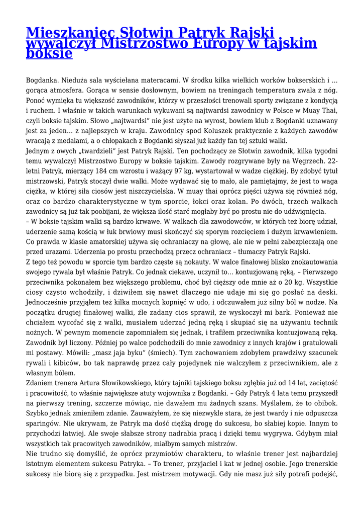 Mieszkaniec Słotwin Patryk Rajski wywalczył Mistrzostwo Europy w tajskim boksie Bogdanka. Nieduża sala wyściełana materacami. W środku kilka wielkich worków bokserskich i … gorąca atmosfera. Gorąca w sensie dosłownym, bowiem na treningach temperatura zwala z nóg. Ponoć wymięka tu większość zawodników, którzy w przeszłości trenowali sporty związane z kondycją i ruchem. I właśnie w takich warunkach wykuwani są najtwardsi zawodnicy w Polsce w Muay Thai, czyli boksie tajskim. Słowo „najtwardsi” nie jest użyte na wyrost, bowiem klub z Bogdanki uznawany jest za jeden… z najlepszych w kraju. Zawodnicy spod Koluszek praktycznie z każdych zawodów wracają z medalami, a o chłopakach z Bogdanki słyszał już każdy fan tej sztuki walki. Jednym z owych „twardzieli” jest Patryk Rajski. Ten pochodzący ze Słotwin zawodnik, kilka tygodni temu wywalczył Mistrzostwo Europy w boksie tajskim. Zawody rozgrywane były na Węgrzech. 22letni Patryk, mierzący 184 cm wzrostu i ważący 97 kg, wystartował w wadze ciężkiej. By zdobyć tytuł mistrzowski, Patryk stoczył dwie walki. Może wydawać się to mało, ale pamiętajmy, że jest to waga ciężka, w której siła ciosów jest niszczycielska. W muay thai oprócz pięści używa się również nóg, oraz co bardzo charakterystyczne w tym sporcie, łokci oraz kolan. Po dwóch, trzech walkach zawodnicy są już tak poobijani, że większa ilość starć mogłaby być po prostu nie do udźwignięcia. – W boksie tajskim walki są bardzo krwawe. W walkach dla zawodowców, w których też biorę udział, uderzenie samą kością w łuk brwiowy musi skończyć się sporym rozcięciem i dużym krwawieniem. Co prawda w klasie amatorskiej używa się ochraniaczy na głowę, ale nie w pełni zabezpieczają one przed urazami. Uderzenia po prostu przechodzą przecz ochraniacz – tłumaczy Patryk Rajski. Z tego też powodu w sporcie tym bardzo częste są nokauty. W walce finałowej blisko znokautowania swojego rywala był właśnie Patryk. Co jednak ciekawe, uczynił to… kontuzjowaną ręką. – Pierwszego przeciwnika pokonałem bez większego problemu, choć był cięższy ode mnie aż o 20 kg. Wszystkie ciosy czysto wchodziły, i dziwiłem się nawet dlaczego nie udaje mi się go posłać na deski. Jednocześnie przyjąłem też kilka mocnych kopnięć w udo, i odczuwałem już silny ból w nodze. Na początku drugiej finałowej walki, źle zadany cios sprawił, że wyskoczył mi bark. Ponieważ nie chciałem wycofać się z walki, musiałem uderzać jedną ręką i skupiać się na używaniu technik nożnych. W pewnym momencie zapomniałem się jednak, i trafiłem przeciwnika kontuzjowaną ręką. Zawodnik był liczony. Później po walce podchodzili do mnie zawodnicy z innych krajów i gratulowali mi postawy. Mówili: „masz jaja byku” (śmiech). Tym zachowaniem zdobyłem prawdziwy szacunek rywali i kibiców, bo tak naprawdę przez cały pojedynek nie walczyłem z przeciwnikiem, ale z własnym bólem. Zdaniem trenera Artura Słowikowskiego, który tajniki tajskiego boksu zgłębia już od 14 lat, zaciętość i pracowitość, to właśnie największe atuty wojownika z Bogdanki. – Gdy Patryk 4 lata temu przyszedł na pierwszy trening, szczerze mówiąc, nie dawałem mu żadnych szans. Myślałem, że to obibok. Szybko jednak zmieniłem zdanie. Zauważyłem, że się niezwykle stara, że jest twardy i nie odpuszcza sparingów. Nie ukrywam, że Patryk ma dość ciężką drogę do sukcesu, bo słabiej kopie. Innym to przychodzi łatwiej. Ale swoje słabsze strony nadrabia pracą i dzięki temu wygrywa. Gdybym miał wszystkich tak pracowitych zawodników, miałbym samych mistrzów. Nie trudno się domyślić, że oprócz przymiotów charakteru, to właśnie trener jest najbardziej istotnym elementem sukcesu Patryka. – To trener, przyjaciel i kat w jednej osobie. Jego trenerskie sukcesy nie biorą się z przypadku. Jest mistrzem motywacji. Gdy nie masz już siły potrafi podejść, rzucić jedno zdanie i momentalnie człowiek zyskuje potrzebną energię. Bo tak naprawdę, trener oprócz umiejętności, musi też potrafić cię zrozumieć – tłumaczy bokser. Trening mentalny jest o tyle ważny, że uprawianie muay thai na najwyższym poziomie, okupione jest niezwykle ciężką pracą. Patryk trenuje każdego dnia po 2 godziny. Ponieważ nie uprawia boksu w sposób czysto zawodowy, ćwiczy po powrocie z pracy. Pracę fizyczną w koluszkowskiej firmie BUDDROG traktuje po części jako siłownię, miejsce gdzie wyrabia siłę fizyczną. – Na szczęście mam wyrozumiałego pracodawcę, który nie robi mi żadnych problemów. Nie ulega wątpliwości, że o Patryku jeszcze usłyszymy, ponieważ jego dalsze plany życiowe są ściśle powiązane z opisywaną sztuką walki. – Moje marzenie? Wyjechać do Tajlandii ojczyzny tajskiego boksu, by podszkolić moje muay thai i oczywiście pokonać jakiegoś tajskiego wojownika (śmiech). A najbliższa przyszłość? Mój kierunek to walki zawodowe. Pierwsze walki mam już za sobą. Gdyby nie obecna kontuzja, jeszcze w tym roku walczyłbym na jednej z najlepszych gal w Polsce, organizowanej przez Mistrza Świata Tomasza Makowskiego. Ale z tego co słyszałem, dostanę jeszcze szansę by powalczyć na kolejnej tego rodzaju gali. A w dalekiej przyszłości? Cóż, może i samo MMA. Nie wykluczam tego. Boksu tajskiego nie trenuję wyłącznie dla samej przyjemności zmęczenia się. Ja po prostu lubię walczyć na ringu, lubię czuć krew – puentuje naszą rozmowę Patryk Rajski. By osiągnąć powyższe cele, wojownikowi z Bogdanki najbardziej potrzebny jest solidny sponsor. By przejść na zawodowstwo, jak najwięcej należy pokazywać się na ringach amatorskich. Stąd udziały w zawodach rangi mistrzowskiej. Tylko w tym roku, oprócz Mistrzostwa Europy, Patryk wywalczył wicemistrzostwo Polski, oraz dwa złote medale na Pucharze Świata. Problem polega na tym, że poza 