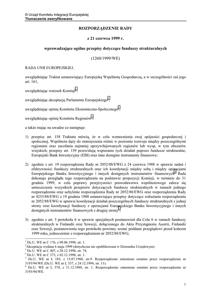 © Urząd Komitetu Integracji Europejskiej Tłumaczenie zweryfikowane ROZPORZĄDZENIE RADY z 21 czerwca 1999 r. wprowadzające ogólne przepisy dotyczące funduszy strukturalnych (1260/1999/WE) RADA UNII EUROPEJSKIEJ, uwzględniając Traktat ustanawiający Europejską Wspólnotę Gospodarczą, a w szczególności zaś jego art. 161, uwzględniając wniosek Komisji1, uwzględniając akceptację Parlamentu Europejskiego2, uwzględniając opinię Komitetu Ekonomiczno-Społecznego3, uwzględniając opinię Komitetu Regionów4, a także mając na uwadze co następuje: 1) przepisy art. 158 Traktatu mówią, że w celu wzmocnienia swej spójności gospodarczej i społecznej, Wspólnota dąży do zmniejszenia różnic w poziomie rozwoju między poszczególnymi regionami oraz zacofania najmniej uprzywilejowanych regionów lub wysp, w tym obszarów wiejskich; przepisy art. 159 przewidują wspieranie tych działań poprzez fundusze strukturalne, Europejski Bank Inwestycyjny (EBI) oraz inne dostępne instrumenty finansowe; 2) zgodnie z art. 19 rozporządzenia Rady nr 2052/88/EWG z 24 czerwca 1988 w sprawie zadań i efektywności funduszy strukturalnych oraz ich koordynacji między sobą i między operacjami Europejskiego Banku Inwestycyjnego i innych dostępnych instrumentów finansowych5 Rada dokonuje przeglądu tego rozporządzenia na podstawie propozycji Komisji, w terminie do 31 grudnia 1999; w celu poprawy przejrzystości prawodawstwa wspólnotowego zaleca się umieszczenie wszystkich przepisów dotyczących funduszy strukturalnych w ramach jednego rozporządzenia oraz uchylenie rozporządzenia Rady nr 2052/88/EWG oraz rozporządzenia Rady nr 4253/88/EWG z 19 grudnia 1988 ustanawiające przepisy dotyczące wdrażania rozporządzenia nr 2052/88/EWG w sprawie koordynacji działań poszczególnych funduszy strukturalnych z jednej strony oraz koordynacji funduszy z operacjami Europejskiego Banku Inwestycyjnego i innych dostępnych instrumentów finansowych z drugiej strony6; 3) zgodnie z art. 5 protokołu 6 w sprawie specjalnych postanowień dla Celu 6 w ramach funduszy strukturalnych w Finlandii oraz Szwecji, dołączonego do Aktu Przystąpienia Austrii, Finlandii oraz Szwecji, postanowienia tego protokołu powinny zostać poddane przeglądowi przed końcem 1999 roku, jednocześnie z rozporządzeniem nr 2052/88/EWG; 1 Dz.U. WE nr C 176, z 09.06.1998, str. 1. Akceptacja wydana 6 maja 1999 (dotychczas nie opublikowana w Dzienniku Urzędowym) 3 Dz.U. WE nr C 407, z 28.12.1998, str. 74. 4 Dz.U. WE nr C 373, z 02.12.1998, str. 1. 5 Dz.U. WE nr L 185, z 15.07.1988, str.9. Rozporządzenie zmienione ostatnio przez rozporządzenie nr 3193/94/WE (Dz.U. WE nr L 337, z 24.12.1994, str. 11). 6 Dz.U. WE nr L 374, z 31.12.1988, str. 1. Rozporządzenie zmienione ostatnio przez rozporządzenie nr 3193/94/WE. 2 1 © Urząd Komitetu Integracji Europejskiej Tłumaczenie zweryfikowane 4) w celu zwiększenia koncentracji i uproszczenia operacji funduszy strukturalnych liczba celów priorytetowych powinna zostać zmniejszona w porównaniu z rozporządzeniem nr 2052/88/EWG; cele te powinny zostać ponownie zdefiniowane jako promowanie rozwoju i strukturalnego dostosowania regionów opóźnionych w rozwoju, przekształcenia ekonomiczne i społeczne oraz zmiana profilu polityki społecznej na obszarach z trudnościami strukturalnymi oraz dostosowanie i modernizacja polityk i systemów edukacyjnych, szkoleniowych oraz w zakresie zatrudnienia; 5) w swoich działaniach zmierzających do wzmocnienia spójności ekonomicznej i społecznej Wspólnota stara się promować harmonijny i zrównoważony rozwój działalności gospodarczej, wysoki poziom zatrudnienia, równe traktowanie kobiet i mężczyzn oraz wysoki poziom ochrony i poprawy stanu środowiska; wysiłki te powinny w szczególności włączać w proces przygotowywania i wdrażania operacji funduszy strukturalnych wymogi ochrony środowiska, a także służyć eliminowaniu nierówności i promowaniu równego traktowania kobiet i mężczyzn; operacje funduszy mogą także przyczyniać się do zwalczania wszelkich form dyskryminacji na gruncie rasy, pochodzenia etnicznego, niepełnosprawności lub wieku, w szczególności za pomocą oceny potrzeb, zachęt finansowych oraz poszerzonego partnerstwa; 6) rozwój kulturalny, jakość środowiska naturalnego i antropogenicznego, jakościowy i kulturowy wymiar życia, a także rozwój turystyki przyczyniają się do gospodarczego i społecznego wzrostu atrakcyjności regionów, o tyle o ile zachęcają one do tworzenia zrównoważonego zatrudnienia; 7) Europejski Fundusz Rozwoju Regionalnego (ERDF) przyczynia się przede wszystkim do osiągnięcia celu polegającego na promowaniu rozwoju i przekształcenia strukturalnego regionów opóźnionych w rozwoju oraz gospodarczego i społecznego przekształcenia obszarów z trudnościami strukturalnymi; 8) zadania Europejskiego Funduszu Społecznego (ESF) powinny być dostosowane w celu uwzględnienia i wdrażania europejskiej strategii zatrudnienia; 9) strukturalne aspekty wspólnej polityki rybołówstwa zostały włączone jako pełnoprawna polityka strukturalna do zasad rządzących funduszami strukturalnymi od roku 1993; wdrażanie poprzez Finansowy Instrument Wspierania Rybołówstwa (FIFG) w ramach Funduszy Strukturalnych powinno być kontynuowane; zważywszy że pomoc z FIFG w ramach Celu 1 powinna tworzyć część programowania tego Celu, natomiast pomoc poza Celem 1 powinna być przedmiotem jednolitego programu w każdym państwie członkowskim; 10) Wspólnota podjęła reformę wspólnej polityki rolnej, która zawiera działania strukturalne i towarzyszące, służące rozwojowi obszarów wiejskich; w tym kontekście sekcja „Orientacja” Europejskiego Funduszu Orientacji i Gwarancji Rolnej (EAGGF) powinna w dalszym ciągu przyczyniać się do osiągania celu priorytetowego polegającego na rozwoju i strukturalnym dopasowaniu regionów opóźnionych w rozwoju poprzez popr