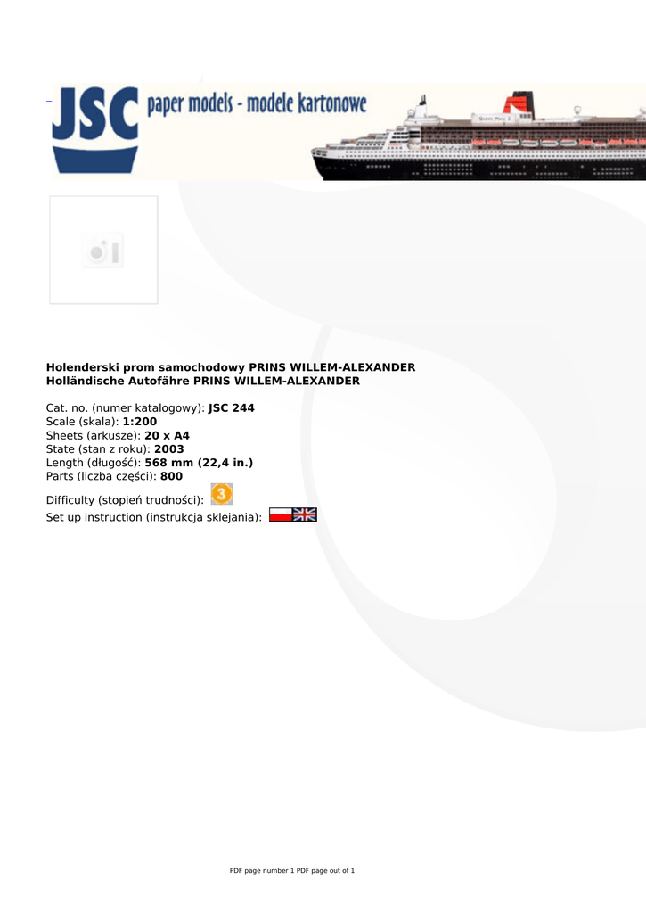 Holenderski prom samochodowy PRINS WILLEM-ALEXANDER Holländische Autofähre PRINS WILLEM-ALEXANDER Cat. no. (numer katalogowy): JSC 244 Scale (skala): 1:200 Sheets (arkusze): 20 x A4 State (stan z roku): 2003 Length (długość): 568 mm (22,4 in.) Parts (liczba części): 800 Difficulty (stopień trudności): Set up instruction (instrukcja sklejania): PDF page number 1 PDF page out of 1
