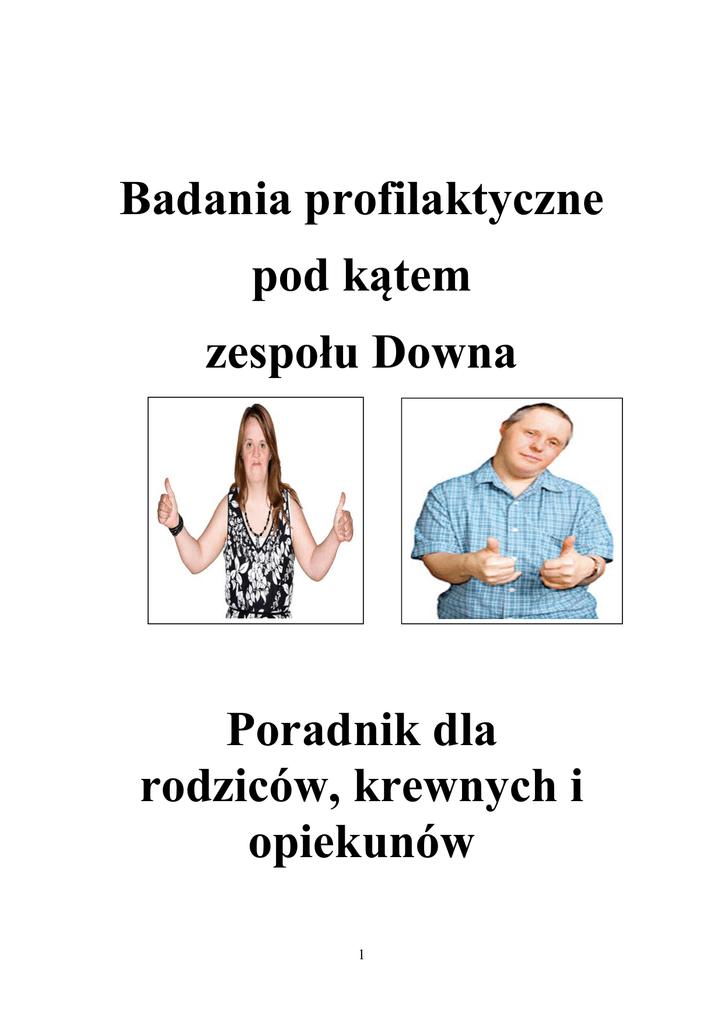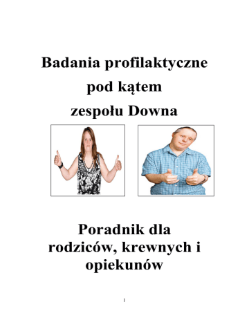 Badania profilaktyczne pod kątem zespołu Downa Poradnik dla rodziców, krewnych i opiekunów 1 Zespół Downa – co to jest? Zespół Downa to najczęściej rozpoznawalny rodzaj upośledzenia umysłowego. W genotypie człowieka zazwyczaj występują 23 pary chromosomów, 23 odziedziczone po matce i 23 odziedziczone po ojcu, czyli razem 46. Ludzie z zespołem Downa mają dodatkową kopię chromosomu 21, a więc ich genotyp zawiera w sumie 47 chromosomów. Znane są trzy formy zespołu Downa: trisomia prosta 21, która jest najbardziej rozpowszechniona (94%), trisomia translokacyjna (4%) i trisomia mozaikowa (2%). Zespół ten pojawia się przypadkowo podczas poczęcia, występuje u osób obojga płci i rzadko jest dziedziczny. Jest to przypadłość na całe życie i jest nieuleczalna. Istnieje jednak wiele możliwości wsparcia i pomocy dla ludzi z zespołem Downa, dzięki czemu mogą oni prowadzić długie i wartościowe życie. Średnia długość życia u osób z zespołem Downa wydłużyła się do lat 60, a nawet dłużej. W wyniku tego jednak, ludzie z zespołem Downa obecnie często cierpią na choroby wieku starszego, takie jak otępienie starcze lub choroba Alzheimera. Wiele dzieci z zespołem Downa uczy się w szkołach w normalnym nurcie, a wielu dorosłych pracuje i prowadzi niezależne życie. Jak wszyscy, ludzie z zespołem Downa mają swoje indywidualne zalety, zdolności i cechy osobowości. 2 Diagnoza Zespół Downa jest najczęściej rozpoznawany tuż po urodzeniu, choć można postawić diagnozę również w czasie trwania ciąży przy pomocy amniopunkcji. Ludzie z zespołem Downa mają zazwyczaj podobne cechy fizyczne. Należą do nich: Słabe naprężenie mięśni powodujące wiotkość. Mały nos i spłaszczona nasada nosa. Szerokie dłonie o krótkich palcach. Waga i wzrost w chwili urodzenia poniżej średniej. Małe usta. Skośnie ustawione oczy skierowane ku górze. Niekiedy dłonie mają tylko pojedynczą poprzeczną bruzdę. Potrzeby Zdrowotne Niektóre problemy zdrowotne występują częściej u osób z zespołem Downa. Oprócz normalnych badań okresowych ogólnie dostępnych dla wszystkich, osoby z zespołem Downa powinny podlegać dodatkowym badaniom kontrolnym pod kątem szczególnych problemów zdrowotnych częściej pojawiających się u tej grupy osób. Zalicza się do nich: Problemy ze słuchem Problemy ze wzrokiem Problemy z uzębieniem Problemy z tarczycą Padaczka Szczytowo-obrotowa niestabilność 3 Problemy z układem oddychania Wady serca Zaburzenia zdrowia psychicznego Choroba Alzheimera i otępienie starcze Problemy skórne Kontrola: Profilaktyczne badania krwi Kontrola wagi ciała i wzrostu Słuch U ludzi z zespołem Downa przewody uszne są często wąskie, dlatego też do trzeciego roku życia badania audiometryczne należy przeprowadzać co 6 miesięcy, a następnie raz w roku. Wzrok Choroby wzroku takie jak katarakta i ametropia u ludzi z zespołem Downa mogą się rozwinąć pomiędzy 3 a 5 rokiem życia. W związku z tym, zanim dziecko ukończy 6 miesięcy, należy skierować je na badania profilaktyczne w poradni okulistycznej dla dzieci. Powszechnie w tej grupie występujące choroby wzroku to katarakta, stożek rogówki, zez, ambliopia (‘leniwe oko’), krótkowzroczność i dalekowzroczność. Zaleca się doroczne badanie wzroku. 4 Uzębienie Rozwój zębów jest zazwyczaj spowolniony. Często brakuje niektórych zębów, są małe o nieregularnym kształcie, często zachodzące na siebie z uwagi na mały rozmiar jamy ustnej. Oddychanie przez usta może doprowadzić do popękania ust i języka. Zaleca się wstępną ocenę stomatologiczną w wieku dwóch lat, a następnie regularne wizyty u dentysty co pół roku jak również wtedy, gdy pojawią się problemy między wizytami. Badania profilaktyczne tarczycy Należy zweryfikować wyniki badań profilaktycznych tarczycy przeprowadzonych w okresie okołoporodowym. Z uwagi na ryzyko nabytej choroby tarczycy, badanie należy powtórzyć w wieku 6 i 12 miesięcy, a następnie raz w roku. Nierozpoznane zaburzenie tarczycy może zachwiać normalne funkcjonowanie w życiu codziennym. Padaczka Należy zwracać uwagę na pojawienie się objawów epileptycznych, ponieważ dwukrotnie w ciągu życia osoby z zespołem Downa, pojawia się zwiększone ryzyko rozwinięcia się padaczki. Pierwszy taki moment pojawia się w okresie niemowlęcym, a drugi okres zwiększonego ryzyka występuje w okresie dojrzałości. Uważa się, że pojawienie się objawów epileptycznych związane jest z początkiem i rozwojem choroby Alzheimera. 5 Szczytowo-obrotowa niestabilność Zespół Downa związany jest z niewłaściwą produkcją kolagenu, co powoduje rozluźnienie więzadeł, które nie są w stanie właściwie utrzymać stawów (słabość więzadeł). Rozwija się w ten sposób skłonność do przedwczesnego zwyrodnienia stawów. Zaleca się w związku z tym skierowanie dzieci z zespołem Downa na badania rentgenowskie kręgosłupa pomiędzy 3 a 5 rokiem życia. Niestabilność-szczytowo obrotowa może prowadzić do dyslokacji oraz uszkodzenia rdzenia kręgowego. Zaleca się przeprowadzenie badania przedmiotowego i powtórzenie prześwietlenia kręgosłupa szyjnego w przypadku pojawienia się jakichś zastrzeżeń związanych z niestabilnością szczytowo-obrotową, jak również przed podjęciem sportów kontaktowych lub wytężonej aktywności fizycznej. Efekt niestabilności szczytowo-obrotowej musi być oceniony przez zabiegami wymagającymi ogólnej narkozy. Drogi Oddechowe Należy prowadzić dokładną ocenę i kontrolę dróg oddechowych pod kątem infekcji jak również obturacyjnego bezdechu sennego, który, jak się szacuje, występuje u połowy osób z zespołem Downa. Zaleca się skierowanie do specjalisty, jeśli pojawią się problemy tego typu. Wady Serca Stan serca należy dokładnie kontrolować i w razie jakichkolwiek zastrzeżeń, skierować niezwłocznie do kardiologa. 6 Zdrowie