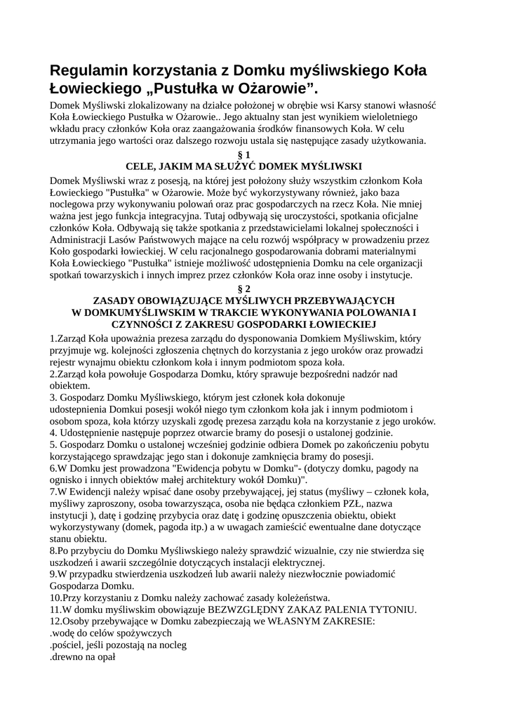Regulamin korzystania z Domku myśliwskiego Koła Łowieckiego „Pustułka w Ożarowie”. Domek Myśliwski zlokalizowany na działce położonej w obrębie wsi Karsy stanowi własność Koła Łowieckiego Pustułka w Ożarowie.. Jego aktualny stan jest wynikiem wieloletniego wkładu pracy członków Koła oraz zaangażowania środków finansowych Koła. W celu utrzymania jego wartości oraz dalszego rozwoju ustala się następujące zasady użytkowania. §1 CELE, JAKIM MA SŁUŻYĆ DOMEK MYŚLIWSKI Domek Myśliwski wraz z posesją, na której jest położony służy wszystkim członkom Koła Łowieckiego "Pustułka" w Ożarowie. Może być wykorzystywany również, jako baza noclegowa przy wykonywaniu polowań oraz prac gospodarczych na rzecz Koła. Nie mniej ważna jest jego funkcja integracyjna. Tutaj odbywają się uroczystości, spotkania oficjalne członków Koła. Odbywają się także spotkania z przedstawicielami lokalnej społeczności i Administracji Lasów Państwowych mające na celu rozwój współpracy w prowadzeniu przez Koło gospodarki łowieckiej. W celu racjonalnego gospodarowania dobrami materialnymi Koła Łowieckiego "Pustułka" istnieje możliwość udostępnienia Domku na cele organizacji spotkań towarzyskich i innych imprez przez członków Koła oraz inne osoby i instytucje. §2 ZASADY OBOWIĄZUJĄCE MYŚLIWYCH PRZEBYWAJĄCYCH W DOMKUMYŚLIWSKIM W TRAKCIE WYKONYWANIA POLOWANIA I CZYNNOŚCI Z ZAKRESU GOSPODARKI ŁOWIECKIEJ 1.Zarząd Koła upoważnia prezesa zarządu do dysponowania Domkiem Myśliwskim, który przyjmuje wg. kolejności zgłoszenia chętnych do korzystania z jego uroków oraz prowadzi rejestr wynajmu obiektu członkom koła i innym podmiotom spoza koła. 2.Zarząd koła powołuje Gospodarza Domku, który sprawuje bezpośredni nadzór nad obiektem. 3. Gospodarz Domku Myśliwskiego, którym jest członek koła dokonuje udostepnienia Domkui posesji wokół niego tym członkom koła jak i innym podmiotom i osobom spoza, koła którzy uzyskali zgodę prezesa zarządu koła na korzystanie z jego uroków. 4. Udostępnienie następuje poprzez otwarcie bramy do posesji o ustalonej godzinie. 5. Gospodarz Domku o ustalonej wcześniej godzinie odbiera Domek po zakończeniu pobytu korzystającego sprawdzając jego stan i dokonuje zamknięcia bramy do posesji. 6.W Domku jest prowadzona "Ewidencja pobytu w Domku"- (dotyczy domku, pagody na ognisko i innych obiektów małej architektury wokół Domku)". 7.W Ewidencji należy wpisać dane osoby przebywającej, jej status (myśliwy – członek koła, myśliwy zaproszony, osoba towarzysząca, osoba nie będąca członkiem PZŁ, nazwa instytucji ), datę i godzinę przybycia oraz datę i godzinę opuszczenia obiektu, obiekt wykorzystywany (domek, pagoda itp.) a w uwagach zamieścić ewentualne dane dotyczące stanu obiektu. 8.Po przybyciu do Domku Myśliwskiego należy sprawdzić wizualnie, czy nie stwierdza się uszkodzeń i awarii szczególnie dotyczących instalacji elektrycznej. 9.W przypadku stwierdzenia uszkodzeń lub awarii należy niezwłocznie powiadomić Gospodarza Domku. 10.Przy korzystaniu z Domku należy zachować zasady koleżeństwa. 11.W domku myśliwskim obowiązuje BEZWZGLĘDNY ZAKAZ PALENIA TYTONIU. 12.Osoby przebywające w Domku zabezpieczają we WŁASNYM ZAKRESIE: .wodę do celów spożywczych .pościel, jeśli pozostają na nocleg .drewno na opał .worki na śmieci .środki czystości 13.Osoby przebywające w Domku będą aktywnie uczestniczyć w czynnościach porządkowych i gospodarczych organizowanych w Domku i na posesji wokół niego przez GospodarzaDomku. 14.Opuszczając Domek należy zostawić go w takim stanie, w jakim chciałoby się go zastać: .Zajmowane pomieszczenia winny być posprzątane, odkurzone i opróżnione ze śmieci i pustych opakowań po produktach spożywczych. W kuchni nie można zostawiać pozostałości żywności. Można zostawić artykuły spożywcze niepsujące się w zamkniętych pojemnikach (cukier, kawa, herbata, przyprawy itp.) ·.Należy umyć używane naczynia, sztućce i sprzęt kuchenny. .Pojemniki na śmieci należy opróżnić, a śmieci zabrać z Domku i z terenu posesji. Dotyczy to całego obiektu również pojemników na zewnątrz domku. .Kuchnia kaflowa musi być wygaszona, a popiół wybrany. .Wyłączyć zasilanie elektryczne wyłącznikiem głównym. §3 ZASADY OBOWIĄZUJĄCE INNE OSOBY (NIE MYŚLIWYCH KOŁA) PRZEBYWAJĄCE W DOMKU MYŚLIWSKIM 1.W Domku Myśliwskim mogą przebywać osoby zaproszone przez członka Koła przy zachowaniu zasady bezwzględnej obecności w czasie ich pobytu zapraszającego. 2.Istnieje możliwość udostępnienia Domku na cele organizacji spotkań towarzyskich i innych imprez innym osobom i instytucjom na warunkach indywidualnie wynegocjowanych z Zarządem Koła. 3.W trakcie imprez, istnieje zasada bezwzględnej obecności w czasie jej trwania organizatora, jeżeli jest nim członek koła lub wyznaczonego przez zarząd innego członka koła. §4 ZASADY POSTĘPOWANIA Z BRONIĄ W OBRĘBIE OBIEKTU 1.Zgodnie z polskim prawem za broń i jej przechowywanie pełną odpowiedzialność ponosi jej właściciel. §5 SPRAWY FINANSOWE (OPŁATY) 1.Myśliwy członek, koła, który przebywa w Domku Myśliwskim nie ponosi z tego tytułu żadnych kosztów. Dotyczy to również myśliwych spoza koła zaproszonych przez zarząd koła oraz myśliwych wykonujących prace gospodarcze. 2. Z opłat zwolnione są także następujące instytucje: szkoły z terenu gmin na których terenie koło dzierżawi obwody łowieckie, Urzędu Miasta i Gminy Ożarowa, Cementowni „Ożarów S. A. „ 2.Zarząd przy podejmowaniu decyzji o udostępnieniu Domku na cele organizacji spotkań towarzyskich i innych imprez przy ustalaniu warunków finansowych ich dotyczących kierował się będzie szeroko rozumianym dobrem Koła. 4.Za wszelkie szkody powstałe w Domku Myśliwskim , małej architekturze wokół Domku jak również na terenie posesji odpowiedzialnoś