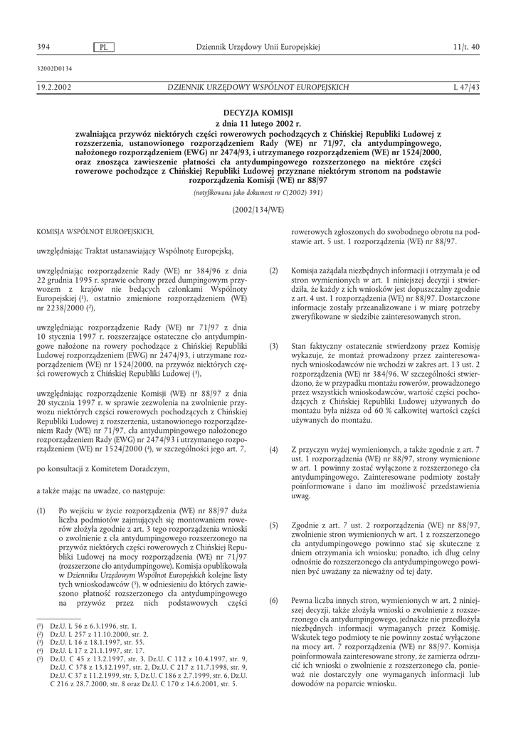 394 Dziennik Urzędowy Unii Europejskiej 11/t. 40 DZIENNIK URZĘDOWY WSPÓLNOT EUROPEJSKICH L 47/43 PL 32002D0134 19.2.2002 DECYZJA KOMISJI z dnia 11 lutego 2002 r. zwalniająca przywóz niektórych części rowerowych pochodzących z Chińskiej Republiki Ludowej z rozszerzenia, ustanowionego rozporządzeniem Rady (WE) nr 71/97, cła antydumpingowego, nałożonego rozporządzeniem (EWG) nr 2474/93, i utrzymanego rozporządzeniem (WE) nr 1524/2000, oraz znosząca zawieszenie płatności cła antydumpingowego rozszerzonego na niektóre części rowerowe pochodzące z Chińskiej Republiki Ludowej przyznane niektórym stronom na podstawie rozporządzenia Komisji (WE) nr 88/97 (notyfikowana jako dokument nr C(2002) 391) (2002/134/WE) rowerowych zgłoszonych do swobodnego obrotu na podstawie art. 5 ust. 1 rozporządzenia (WE) nr 88/97. KOMISJA WSPÓLNOT EUROPEJSKICH, uwzględniając Traktat ustanawiający Wspólnotę Europejską, uwzględniając rozporządzenie Rady (WE) nr 384/96 z dnia 22 grudnia 1995 r. sprawie ochrony przed dumpingowym przywozem z krajów nie bedących członkami Wspólnoty Europejskiej (1), ostatnio zmienione rozporządzeniem (WE) nr 2238/2000 (2), uwzględniając rozporządzenie Rady (WE) nr 71/97 z dnia 10 stycznia 1997 r. rozszerzające ostateczne cło antydumpingowe nałożone na rowery pochodzące z Chińskiej Republiki Ludowej rozporządzeniem (EWG) nr 2474/93, i utrzymane rozporządzeniem (WE) nr 1524/2000, na przywóz niektórych części rowerowych z Chińskiej Republiki Ludowej (3), uwzględniając rozporządzenie Komisji (WE) nr 88/97 z dnia 20 stycznia 1997 r. w sprawie zezwolenia na zwolnienie przywozu niektórych części rowerowych pochodzących z Chińskiej Republiki Ludowej z rozszerzenia, ustanowionego rozporządzeniem Rady (WE) nr 71/97, cła antydumpingowego nałożonego rozporządzeniem Rady (EWG) nr 2474/93 i utrzymanego rozporządzeniem (WE) nr 1524/2000 (4), w szczególności jego art. 7, (2) Komisja zażądała niezbędnych informacji i otrzymała je od stron wymienionych w art. 1 niniejszej decyzji i stwierdziła, że każdy z ich wniosków jest dopuszczalny zgodnie z art. 4 ust. 1 rozporządzenia (WE) nr 88/97. Dostarczone informacje zostały przeanalizowane i w miarę potrzeby zweryfikowane w siedzibie zainteresowanych stron. (3) Stan faktyczny ostatecznie stwierdzony przez Komisję wykazuje, że montaż prowadzony przez zainteresowanych wnioskodawców nie wchodzi w zakres art. 13 ust. 2 rozporządzenia (WE) nr 384/96. W szczególności stwierdzono, że w przypadku montażu rowerów, prowadzonego przez wszystkich wnioskodawców, wartość części pochodzących z Chińskiej Republiki Ludowej używanych do montażu była niższa od 60 % całkowitej wartości części używanych do montażu. (4) Z przyczyn wyżej wymienionych, a także zgodnie z art. 7 ust. 1 rozporządzenia (WE) nr 88/97, strony wymienione w art. 1 powinny zostać wyłączone z rozszerzonego cła antydumpingowego. Zainteresowane podmioty zostały poinformowane i dano im możliwość przedstawienia uwag. (5) Zgodnie z art. 7 ust. 2 rozporządzenia (WE) nr 88/97, zwolnienie stron wymienionych w art. 1 z rozszerzonego cła antydumpingowego powinno stać się skuteczne z dniem otrzymania ich wniosku; ponadto, ich dług celny odnośnie do rozszerzonego cła antydumpingowego powinien być uważany za nieważny od tej daty. (6) Pewna liczba innych stron, wymienionych w art. 2 niniejszej decyzji, także złożyła wnioski o zwolnienie z rozszerzonego cła antydumpingowego, jednakże nie przedłożyła niezbędnych informacji wymaganych przez Komisję. Wskutek tego podmioty te nie powinny zostać wyłączone na mocy art. 7 rozporządzenia (WE) nr 88/97. Komisja poinformowała zainteresowane strony, że zamierza odrzucić ich wnioski o zwolnienie z rozszerzonego cła, ponieważ nie dostarczyły one wymaganych informacji lub dowodów na poparcie wniosku. po konsultacji z Komitetem Doradczym, a także mając na uwadze, co następuje: (1) (1) (2) (3) (4) (5) Po wejściu w życie rozporządzenia (WE) nr 88/97 duża liczba podmiotów zajmujących się montowaniem rowerów złożyła zgodnie z art. 3 tego rozporządzenia wnioski o zwolnienie z cła antydumpingowego rozszerzonego na przywóz niektórych części rowerowych z Chińskiej Republiki Ludowej na mocy rozporządzenia (WE) nr 71/97 (rozszerzone cło antydumpingowe). Komisja opublikowała w Dzienniku Urzędowym Wspólnot Europejskich kolejne listy tych wnioskodawców (5), w odniesieniu do których zawieszono płatność rozszerzonego cła antydumpingowego na przywóz przez nich podstawowych części Dz.U. L 56 z 6.3.1996, str. 1. Dz.U. L 257 z 11.10.2000, str. 2. Dz.U. L 16 z 18.1.1997, str. 55. Dz.U. L 17 z 21.1.1997, str. 17. Dz.U. C 45 z 13.2.1997, str. 3, Dz.U. C 112 z 10.4.1997, str. 9, Dz.U. C 378 z 13.12.1997, str. 2, Dz.U. C 217 z 11.7.1998, str. 9, Dz.U. C 37 z 11.2.1999, str. 3, Dz.U. C 186 z 2.7.1999, str. 6, Dz.U. C 216 z 28.7.2000, str. 8 oraz Dz.U. C 170 z 14.6.2001, str. 5. 11/t. 40 Dziennik Urzędowy Unii Europejskiej PL 395 (7) Ponieważ strony wymienione w art. 2 nie wypełniły kryteriów zwolnienia, zawieszenie płatności rozszerzonego cła antydumpingowego powinno zostać zniesione, a rozszerzone cło antydumpingowe powinno zostać pobrane od dnia otrzymania ich wniosków. (8) Po przyjęciu niniejszej decyzji, w Dzienniku Urzędowym Wspólnot Europejskich seria C powinna zostać opublikowana, zgodnie z art. 16 ust. 2 rozporządzenia (WE) nr 88/97, uaktualniona lista stron wyłączonych na podstawie art. 7 wspomnianego rozporządzenia oraz lista podmiotów, których wnioski na podstawie art. 3 wspomnianego rozporządzenia są w trakcie rozpatrywania, PRZYJMUJE NINIEJSZĄ DECYZJĘ: Artykuł 1 Wyłącza się strony wymienione poniżej z rozszerzenia na mocy rozporządzenia (WE) nr 71/97 ostatecznego cła antydumpingowego na przywóz niektórych części rowerowych z Chińskiej Republiki Ludowej nałożonego na rowery p