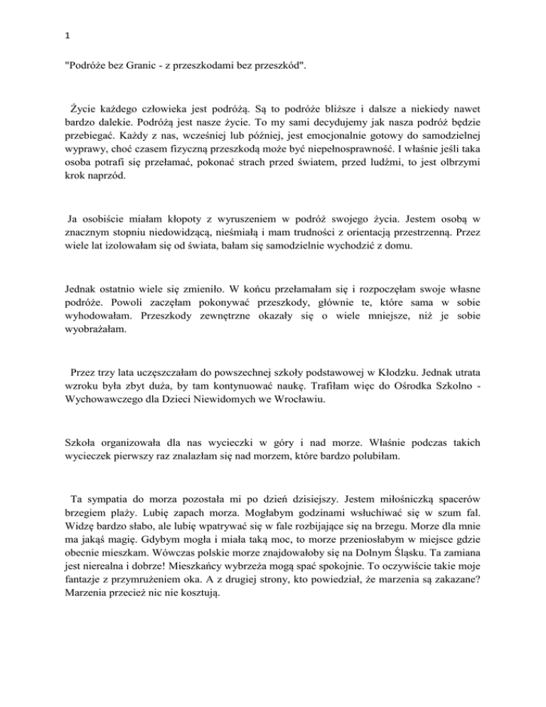 1 "Podróże bez Granic - z przeszkodami bez przeszkód". Życie każdego człowieka jest podróżą. Są to podróże bliższe i dalsze a niekiedy nawet bardzo dalekie. Podróżą jest nasze życie. To my sami decydujemy jak nasza podróż będzie przebiegać. Każdy z nas, wcześniej lub później, jest emocjonalnie gotowy do samodzielnej wyprawy, choć czasem fizyczną przeszkodą może być niepełnosprawność. I właśnie jeśli taka osoba potrafi się przełamać, pokonać strach przed światem, przed ludźmi, to jest olbrzymi krok naprzód. Ja osobiście miałam kłopoty z wyruszeniem w podróż swojego życia. Jestem osobą w znacznym stopniu niedowidzącą, nieśmiałą i mam trudności z orientacją przestrzenną. Przez wiele lat izolowałam się od świata, bałam się samodzielnie wychodzić z domu. Jednak ostatnio wiele się zmieniło. W końcu przełamałam się i rozpoczęłam swoje własne podróże. Powoli zaczęłam pokonywać przeszkody, głównie te, które sama w sobie wyhodowałam. Przeszkody zewnętrzne okazały się o wiele mniejsze, niż je sobie wyobrażałam. Przez trzy lata uczęszczałam do powszechnej szkoły podstawowej w Kłodzku. Jednak utrata wzroku była zbyt duża, by tam kontynuować naukę. Trafiłam więc do Ośrodka Szkolno Wychowawczego dla Dzieci Niewidomych we Wrocławiu. Szkoła organizowała dla nas wycieczki w góry i nad morze. Właśnie podczas takich wycieczek pierwszy raz znalazłam się nad morzem, które bardzo polubiłam. Ta sympatia do morza pozostała mi po dzień dzisiejszy. Jestem miłośniczką spacerów brzegiem plaży. Lubię zapach morza. Mogłabym godzinami wsłuchiwać się w szum fal. Widzę bardzo słabo, ale lubię wpatrywać się w fale rozbijające się na brzegu. Morze dla mnie ma jakąś magię. Gdybym mogła i miała taką moc, to morze przeniosłabym w miejsce gdzie obecnie mieszkam. Wówczas polskie morze znajdowałoby się na Dolnym Śląsku. Ta zamiana jest nierealna i dobrze! Mieszkańcy wybrzeża mogą spać spokojnie. To oczywiście takie moje fantazje z przymrużeniem oka. A z drugiej strony, kto powiedział, że marzenia są zakazane? Marzenia przecież nic nie kosztują. 2 To, że jestem zakochana w morzu, nie znaczy, że nie lubię swojego miasta. Mieszkam w pięknej części naszego kraju. Jest to Kotlina Kłodzka leżąca na Dolnym Śląsku. Niejednokrotnie z rodzicami organizowaliśmy sobie takie małe lokalne podróże. Miały one na celu miłe spędzenie czasu i oczywiście poznanie naszych pięknych okolic. A jest tu co zwiedzać! Wymienię przykładowo kilka miejsc godnych uwagi. Poleciłabym Kaplicę Czaszek w Kudowie-Czermnej, Błędne Skały i Sanktuarium Maryjne w Wambierzycach. Jest też możliwość wędrowania po górach. Wędrować mogą nawet osoby z dysfunkcją wzroku. Większość szlaków nadaje się dla osób, które nie są zaprawione w wędrówkach górskich. Często podróżujemy z kołem Polskiego Związku Niewidomych z mojego miasta. Zwiedziliśmy ogród japoński w Jarkowicach. Ta atrakcja znajduje się blisko mojego miasta Kłodzka. Jest godna obejrzenia. Właściciel tego pięknego miejsca pozwolił osobom niewidomym dotykać roślin, by mogły poczuć piękno tego niesamowitego ogrodu. Godne polecenia jest również arboretum znajdujące się w Wojsławicach. Znajdziemy tam rośliny z różnych części globu. Jest także możliwość grillowania w indiańskim wigwamie. Można się tam zaopatrzyć w sadzonki interesujących roślin. Interesujący jest Klasztor w Lubiążu, który powoli wraca do swojej świetności. Zamek w Wałbrzychu-Książu też jest ciekawym obiektem i również coraz bardziej zadbanym. Kiedyś miałam możność obejrzeć tam wystawę wyrobów porcelanowych. Dolny Śląsk nie jest miejscem mego urodzenia. Dlatego też często podróżujemy z rodzicami w nasze rodzinne strony. Jest to województwo lubelskie. Ściślej mówiąc to region Włodawy. Są tam piękne miejsca Pojezierza Łenczyńsko -Włodawskiego. Sama Włodawa jest bardzo ciekawym miastem. Przed II wojną światową była miastem trzech kultur. Mieszkali tam zgodnie Polacy, Ukraińcy i Żydzi. Dzisiaj możemy podziwiać piękne świątynie. Kościół Paulinów św. Ludwika, cerkiew prawosławną i synagogę. Pamiętam wizytę w cerkwi i przemiłego duchownego, który zapoznał nas z rytem Prawosławia i historią świątyni. Są piękne tereny zielone nad Bugiem. Rzeka Bug dzieli Polskę z Białorusią. Rzeka co prawda jest niebezpieczna. Ja osobiście nie polecam rekreacji wodnych, ale spacery jak najbardziej. Jednak nad takimi dziko płynącymi rzekami wskazana jest ostrożność. Bug to 3 ostatnia w Polsce dziko płynąca rzeka. Stosunkowo blisko Włodawy znajduje się miejscowość Okuninka położona nad Białym Jeziorem. Można tam wypocząć i spędzić miło wolne chwile. Tamtejsze regiony to piękna ostoja fauny i flory. To wspaniała gratka dla ludzi fascynujących się przyrodą. Polecam również uwadze Zamość i okolice. Rynek w Zamościu jest ogromny. Miasto posiada wiele zabytków sakralnych, obok których nie można przejść obojętnie. Ten region naszego kraju, o którym piszę jest bardzo mi bliski i właśnie dlatego znam te okolice dość dobrze. Bardzo polecam te piękne zakątki. Teraz wrócę do mojego rodzinnego miasta Kłodzka. Tu jest naprawdę co podziwiać. Są tu zabytkowe kościoły, twierdza, most kamienny i wiele innych. Mamy w Kłodzku gotycki zabytkowy most kamienny, którego budowę szacuje się na około XIII wiek. Na przełomie wieku XVI i XVII był przebudowywany i rozbudowywany. Zdobią go piękne rzeźby jak np. św. Trójcy czy św. Franciszka Ksawerego, który jest patronem miasta. Most jest podobny do mostu Karola w Pradze lecz jest starszy od niego Z mostu roztacza się piękny widok, a będzie on jeszcze atrakcyjniejszy po zakończeniu prac budowlanych, które obecnie są w toku. Sam most również niedawno przeszedł gruntowną renowację. Kośc
