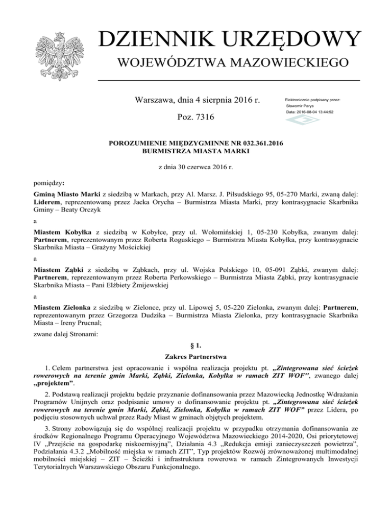 DZIENNIK URZĘDOWY WOJEWÓDZTWA MAZOWIECKIEGO Warszawa, dnia 4 sierpnia 2016 r. Elektronicznie podpisany przez: Sławomir Parys Poz. 7316 Data: 2016-08-04 13:44:52 POROZUMIENIE MIĘDZYGMINNE NR 032.361.2016 BURMISTRZA MIASTA MARKI z dnia 30 czerwca 2016 r. pomiędzy: Gminą Miasto Marki z siedzibą w Markach, przy Al. Marsz. J. Piłsudskiego 95, 05-270 Marki, zwaną dalej: Liderem, reprezentowaną przez Jacka Orycha – Burmistrza Miasta Marki, przy kontrasygnacie Skarbnika Gminy – Beaty Orczyk a Miastem Kobyłka z siedzibą w Kobyłce, przy ul. Wołomińskiej 1, 05-230 Kobyłka, zwanym dalej: Partnerem, reprezentowanym przez Roberta Roguskiego – Burmistrza Miasta Kobyłka, przy kontrasygnacie Skarbnika Miasta – Grażyny Mościckiej a Miastem Ząbki z siedzibą w Ząbkach, przy ul. Wojska Polskiego 10, 05-091 Ząbki, zwanym dalej: Partnerem, reprezentowanym przez Roberta Perkowskiego – Burmistrza Miasta Ząbki, przy kontrasygnacie Skarbnika Miasta – Pani Elżbiety Żmijewskiej a Miastem Zielonka z siedzibą w Zielonce, przy ul. Lipowej 5, 05-220 Zielonka, zwanym dalej: Partnerem, reprezentowanym przez Grzegorza Dudzika – Burmistrza Miasta Zielonka, przy kontrasygnacie Skarbnika Miasta – Ireny Prucnal; zwane dalej Stronami: § 1. Zakres Partnerstwa 1. Celem partnerstwa jest opracowanie i wspólna realizacja projektu pt. „Zintegrowana sieć ścieżek rowerowych na terenie gmin Marki, Ząbki, Zielonka, Kobyłka w ramach ZIT WOF'', zwanego dalej „projektem”. 2. Podstawą realizacji projektu będzie przyznanie dofinansowania przez Mazowiecką Jednostkę Wdrażania Programów Unijnych oraz podpisanie umowy o dofinansowanie projektu pt. „Zintegrowana sieć ścieżek rowerowych na terenie gmin Marki, Ząbki, Zielonka, Kobyłka w ramach ZIT WOF” przez Lidera, po podjęciu stosownych uchwał przez Rady Miast w gminach objętych projektem. 3. Strony zobowiązują się do wspólnej realizacji projektu w przypadku otrzymania dofinansowania ze środków Regionalnego Programu Operacyjnego Województwa Mazowieckiego 2014-2020, Osi priorytetowej IV „Przejście na gospodarkę niskoemisyjną”, Działania 4.3 „Redukcja emisji zanieczyszczeń powietrza”, Podziałania 4.3.2 „Mobilność miejska w ramach ZIT”, Typ projektów Rozwój zrównoważonej multimodalnej mobilności miejskiej – ZIT – Ścieżki i infrastruktura rowerowa w ramach Zintegrowanych Inwestycji Terytorialnych Warszawskiego Obszaru Funkcjonalnego. Dziennik Urzędowy Województwa Mazowieckiego –2– Poz. 7316 § 2. Reprezentacja Partnerstwa Partnerstwo jest reprezentowane przez Lidera, który jest uprawniony do reprezentowania Partnerstwa przed Instytucją Wdrażającą – Mazowiecką Jednostką Wdrażania Programów Unijnych, we wszystkich kwestiach dotyczących Partnerstwa. W tym zakresie Lider działa również w imieniu i na rzecz Partnerów. § 3. Zadania i obowiązki Partnerów 1. Każda ze Stron będzie odpowiedzialna za należyte i terminowe wykonanie przypisanych jej obowiązków, o których mowa w § 4 oraz § 5 niniejszego porozumienia. 2. Każda ze Stron odpowiada za szkody wyrządzone drugiej Stronie lub osobom trzecim przy realizacji niniejszego porozumienia z przyczyn, za które ponosi odpowiedzialność. 3. Strony w trakcie realizacji umowy będą współpracować ze sobą oraz przekazywać sobie wszystkie informacje mające istotne znaczenie dla jego realizacji. 4. Obowiązki i zadania Stron zostaną szczegółowo opisane odrębną umową partnerską po uzyskaniu decyzji o otrzymaniu dofinansowania. § 4. Obowiązki i zadania Lidera Do obowiązków Lidera należy: 1) przygotowanie oraz złożenie wniosku o dofinansowanie projektu pt. „Zintegrowana sieć ścieżek rowerowych na terenie gmin Marki, Ząbki, Zielonka, Kobyłka w ramach ZIT WOF”; 2) realizacja projektu zgodnie z wnioskiem o dofinansowanie projektu; 3) przekazywanie na bieżąco telefonicznie lub e-mailowo informacji dotyczących wszystkich zdarzeń mających bezpośredni wpływ na realizację projektu; 4) kontrola wydatków projektu oraz nadzór nad finansową realizacją całości projektu; 5) sporządzanie i przedkładanie wymaganych przez Instytucję Pośredniczącą dokumentów, w tym wniosków o płatność. § 5. Obowiązki i zadania Partnerów Do obowiązków każdego z Partnerów należy: 1) współpraca przy przygotowaniu wniosku o dofinansowanie projektu pt. „Zintegrowana sieć ścieżek rowerowych na terenie gmin Marki, Ząbki, Zielonka, Kobyłka w ramach ZIT WOF''; 2) realizacja projektu zgodnie z wnioskiem o dofinansowanie projektu; 3) informowanie Lidera o wszystkich problemach związanych z realizacją zadań mu przypisanych w projekcie; 4) udostępnianie do wglądu Liderowi, na jego wezwanie, wszelkich dokumentów i danych źródłowych związanych z realizacją projektu oraz zestawienia wydatków niezbędnych do sporządzenia sprawozdań oraz wniosków o płatność, w terminach określonych przez Instytucję Pośredniczącą; 5) przekazywanie na bieżąco – telefonicznie lub e-mailowo informacji dotyczących wszystkich zdarzeń mających bezpośredni wpływ na realizację projektu. § 6. Plan finansowy oraz zasady zarządzania 1. Lider będzie prowadził wyodrębnioną ewidencję wydatków w ramach projektu w sposób przejrzysty i zgodny z zasadami dotyczącymi realizacji projektów w ramach Regionalnego Programu Operacyjnego Województwa Mazowieckiego na lata 2014-2020, tak, aby możliwa była identyfikacja poszczególnych operacji związanych z projektem. Dziennik Urzędowy Województwa Mazowieckiego –3– Poz. 7316 2. W przypadku otrzymania dofinasowania, o którym mowa w § 1 ust. 2 Strony określą w umowie partnerskiej sposób realizacji przepływów finansowych pomiędzy Partnerami, wysokość wkładu własnego, a także wyodrębnią ewidencję wydatków w ramach projektu w sposób przejrzysty i zgodny z zasadami dotyczącymi realizacji projektów w ramach Regionalnego Programu Operacyjnego