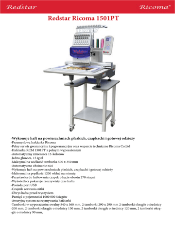 Redstar Ricoma 1501PT -Wykonuje haft na powierzchniach płaskich, czapkachi i gotowej odzieży -Przemysłowa hafciarka Ricoma -Pełny serwis gwarancyjny i pogwarancyjny oraz wsparcie techniczne Ricoma Co.Ltd -Hafciarka RCM 1501PT z pełnym wyposażeniem -Automatyczny zmieniacz 15-kolorów -Jedna głowica, 15 igieł -Maksymalna wielkość tamborka 500 x 350 mm -Automatyczne obcinanie nici -Wykonuje haft na powierzchniach płaskich, czapkachi i gotowej odzieży -Maksymalna prędkość 1200 wkłuć na minutę -Przystawka do haftowania czapek o kącie obrotu 270 stopni -Wyświetlacz pokazuje rzeczywisty czas haftu -Posiada port USB -Czujnik zerwania nitki -Obrys haftu przed wyszyciem -Pamięć o pojemności 1000 000 ściegów -Awaryjny system zatrzymywania hafciarki -Tamborki w wyposażeniu: owalny 540 x 360 mm, 2 tamborki 290 x 290 mm 2 tamborki okrągłe o średnicy -200 mm, 2 tamborki okrągłe o średnicy 150 mm, 2 tamborki okrągłe o średnicy 120 mm, 2 tamborki okrą-głe o średnicy 90 mm, -Przyciski funkcyjne na ekranie : menu, zwiększenie lub obniżenie prędkości pracy,uaktywnienie portu USB, ustawienie parametrów, ESC, Enter,Clear itd -Konkretne przyciski numeryczne do selekcji pracujących igieł -Powrót aż do 100 wkłuć igły wstecz -Zmiana ręczna koloru nici jeżeli zajdzie potrzeba (oprócz automatu) -Przyciski funkcyjne przesuwu ramki -Ręczna możliwość obcinania nitki (oprócz automatu) -Akcesoria dodatkowe: przystawka do cekinów, taśmy, kordonka, sznurka ,laserowy system pozycjonowania ( opcja) -Nowe rewelacyjne przystawki pozwalające na haftowanie szalików,krawatów,butów i innych trudnych do założenia w tamborki rzeczy ! W wyposażeniu fabrycznym: - Zestaw podwójnych tamborków płaskich - Zestaw podwójnych tamborkó do czapek - Stolik 70x70x78 cm waga: 38 kg -Waga maszyny poz złożeniu-90 kg - Instrukcja - Zestaw narzędzi - Nawijarka nici do bębenka Można dokupić ( wyposażenie opcjonalne ):