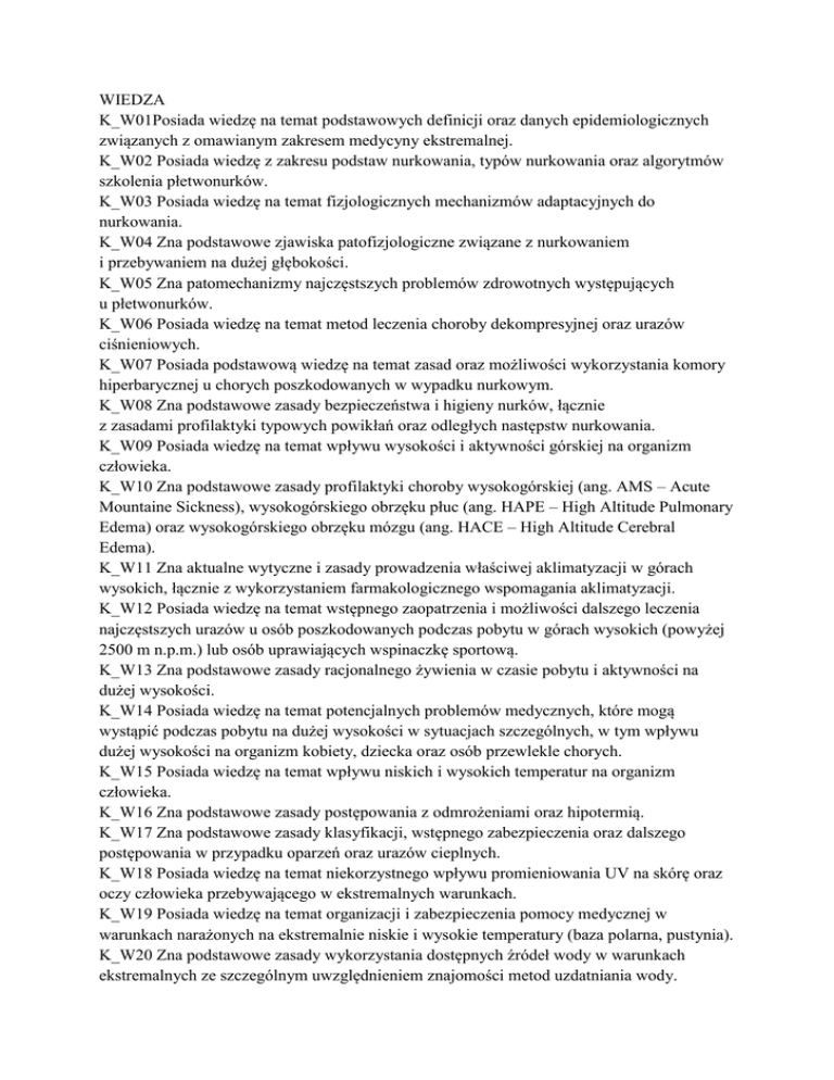 WIEDZA K_W01Posiada wiedzę na temat podstawowych definicji oraz danych epidemiologicznych związanych z omawianym zakresem medycyny ekstremalnej. K_W02 Posiada wiedzę z zakresu podstaw nurkowania, typów nurkowania oraz algorytmów szkolenia płetwonurków. K_W03 Posiada wiedzę na temat fizjologicznych mechanizmów adaptacyjnych do nurkowania. K_W04 Zna podstawowe zjawiska patofizjologiczne związane z nurkowaniem i przebywaniem na dużej głębokości. K_W05 Zna patomechanizmy najczęstszych problemów zdrowotnych występujących u płetwonurków. K_W06 Posiada wiedzę na temat metod leczenia choroby dekompresyjnej oraz urazów ciśnieniowych. K_W07 Posiada podstawową wiedzę na temat zasad oraz możliwości wykorzystania komory hiperbarycznej u chorych poszkodowanych w wypadku nurkowym. K_W08 Zna podstawowe zasady bezpieczeństwa i higieny nurków, łącznie z zasadami profilaktyki typowych powikłań oraz odległych następstw nurkowania. K_W09 Posiada wiedzę na temat wpływu wysokości i aktywności górskiej na organizm człowieka. K_W10 Zna podstawowe zasady profilaktyki choroby wysokogórskiej (ang. AMS – Acute Mountaine Sickness), wysokogórskiego obrzęku płuc (ang. HAPE – High Altitude Pulmonary Edema) oraz wysokogórskiego obrzęku mózgu (ang. HACE – High Altitude Cerebral Edema). K_W11 Zna aktualne wytyczne i zasady prowadzenia właściwej aklimatyzacji w górach wysokich, łącznie z wykorzystaniem farmakologicznego wspomagania aklimatyzacji. K_W12 Posiada wiedzę na temat wstępnego zaopatrzenia i możliwości dalszego leczenia najczęstszych urazów u osób poszkodowanych podczas pobytu w górach wysokich (powyżej 2500 m n.p.m.) lub osób uprawiających wspinaczkę sportową. K_W13 Zna podstawowe zasady racjonalnego żywienia w czasie pobytu i aktywności na dużej wysokości. K_W14 Posiada wiedzę na temat potencjalnych problemów medycznych, które mogą wystąpić podczas pobytu na dużej wysokości w sytuacjach szczególnych, w tym wpływu dużej wysokości na organizm kobiety, dziecka oraz osób przewlekle chorych. K_W15 Posiada wiedzę na temat wpływu niskich i wysokich temperatur na organizm człowieka. K_W16 Zna podstawowe zasady postępowania z odmrożeniami oraz hipotermią. K_W17 Zna podstawowe zasady klasyfikacji, wstępnego zabezpieczenia oraz dalszego postępowania w przypadku oparzeń oraz urazów cieplnych. K_W18 Posiada wiedzę na temat niekorzystnego wpływu promieniowania UV na skórę oraz oczy człowieka przebywającego w ekstremalnych warunkach. K_W19 Posiada wiedzę na temat organizacji i zabezpieczenia pomocy medycznej w warunkach narażonych na ekstremalnie niskie i wysokie temperatury (baza polarna, pustynia). K_W20 Zna podstawowe zasady wykorzystania dostępnych źródeł wody w warunkach ekstremalnych ze szczególnym uwzględnieniem znajomości metod uzdatniania wody. K_W21 Posiada wiedzę na temat aktualnych zagrożeń dla zdrowia wynikających z międzynarodowego ruchu turystycznego. K_W22 Zna podstawowe uwarunkowania środowiskowe, kulturowe i klimatyczne związane z najczęstszymi chorobami zakaźnymi. K_W23 Zna i rozumie wpływ czynników biologicznych, sanitarnych oraz zachowań na zdrowie podróżującego. K_W24 Posiada wiedzę na temat objawów oraz przebiegu klinicznego najczęściej występujących na świecie chorób pasożytniczych, wirusowych i bakteryjnych stanowiących potencjalne ryzyko dla podróżującego. K_W25 Posiada wiedzę dotyczącą działań profilaktycznych obowiązujących przed oraz w trakcie podróży. K_W26 Zna metody ochrony swoistej i nieswoistej przeciwko infekcyjnym chorobom tropikalnym. K_W27 Posiada wiedzę dotyczącą przeciwwskazań do wyjazdu do krajów strefy tropikalnej. K_W28 Zna zagadnienia związane ze zdrowiem podczas podróżowania osób przewlekle chorych, seniorów, dzieci oraz kobiet ciężarnych. K_W29 Zna obowiązujące przepisy prawne dotyczące zasad postępowania sanitarnego, przeciwepidemicznego oraz warunkujące międzynarodowy ruch turystyczny. K_W30 Zna podstawowe problemy zdrowotne charakterystyczne dla medycznego zabezpieczenia grupy ekspedycyjnej. K_W31 Posiada wiedzę na temat możliwości i zasad postępowania w przypadku najczęstszych problemów zdrowotnych mogących wystąpić podczas ekspedycji w warunkach ekstremalnych. K_W32 Posiada wiedzę na temat przygotowania profesjonalnej apteczki służącej do zabezpieczenia grupy ekspedycyjnej. K_W33 Zna i rozumie podstawowe pojęcia z zakresu psychologicznych zachowań człowieka w warunkach ekstremalnych, w tym dotyczących dynamiki procesów grupowych w skrajnych środowiskach. K_W34 Posiada wiedzę na temat zasad organizacji medycznej działalności humanitarnej. K_W35 Zna podstawowe problemy medyczne charakterystyczne dla działalności w ramach niesienia pomocy humanitarnej. K_W36 Zna podstawowe założenia organizacji i niesienia pomocy poszkodowanym podczas klęsk żywiołowych. K_W37 Posiada wiedzę na temat aktualnych standardów postępowania podczas zdarzeń masowych. K_W38 Posiada wiedzę na temat specyfiki działalności medycznej w krajach objętych konfliktem zbrojnym. K_W39 Posiada wiedzę na temat metod natychmiastowego udzielania pomocy poszkodowanym na polu walki. K_W40 Zna aktualne wytyczne taktyczno-bojowej opieki nad poszkodowanym i najnowsze trendy w opiece przedszpitalnej (ang. Combat Trauma System). K_W41 Zna podstawowe zasady organizacji i pracy szpitala polowego. K_W42 Zna podstawowe problemy związane z zabezpieczeniem medycznym ludności cywilnej w rejonach objętych konfliktami zbrojnymi. K_W43 Zna podstawowe zagadnienia związane ze specyfiką ratownictwa górskiego i jaskiniowego. K_W44 Zna podstawowe zagadnienia specyficzne dla ratownictwa wodnego i nurkowego. K_W45 Posiada wiedzę na temat możliwości wykorzystania transportu lotniczego podczas akcji ratunkowych w górach i na wodzie. K_W46 Posiada wiedzę na temat możliwości wykorzystania transportu lotniczego w celu medycznej repa