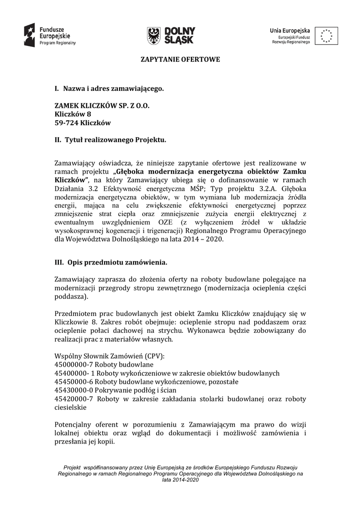 ZAPYTANIEOFERTOWE I. Nazwaiadreszamawiającego. ZAMEKKLICZKÓWSP.ZO.O. Kliczków8 59-724Kliczków II. TytułrealizowanegoProjektu. Zamawiający oświadcza, że niniejsze zapytanie ofertowe jest realizowane w ramach projektu „Głęboka modernizacja energetyczna obiektów Zamku Kliczków”, na który Zamawiający ubiega się o dofinansowanie w ramach Działania 3.2 Efektywność energetyczna MŚP; Typ projektu 3.2.A. Głęboka modernizacja energetyczna obiektów, w tym wymiana lub modernizacja źródła energii, mająca na celu zwiększenie efektywności energetycznej poprzez zmniejszenie strat ciepła oraz zmniejszenie zużycia energii elektrycznej z ewentualnym uwzględnieniem OZE (z wyłączeniem źródeł w układzie wysokosprawnej kogeneracji i trigeneracji) Regionalnego Programu Operacyjnego dlaWojewództwaDolnośląskiegonalata2014–2020. III. Opisprzedmiotuzamówienia. Zamawiający zaprasza do złożenia oferty na roboty budowlane polegające na modernizacji przegrody stropu zewnętrznego (modernizacja ocieplenia części poddasza). Przedmiotem prac budowlanych jest obiekt Zamku Kliczków znajdujący się w Kliczkowie 8. Zakres robót obejmuje: ocieplenie stropu nad poddaszem oraz ocieplenie połaci dachowej na strychu. Wykonawca będzie zobowiązany do realizacjipraczmateriałówwłasnych. WspólnySłownikZamówień(CPV): 45000000-7Robotybudowlane 45400000-1Robotywykończeniowewzakresieobiektówbudowlanych 45450000-6Robotybudowlanewykończeniowe,pozostałe 45430000-0Pokrywaniepodłógiścian 45420000-7 Roboty w zakresie zakładania stolarki budowlanej oraz roboty ciesielskie Potencjalny oferent w porozumieniu z Zamawiającym ma prawo do wizji lokalnej obiektu oraz wgląd do dokumentacji i możliwość zamówienia i przesłaniajejkopii. Projekt współfinansowany przez Unię Europejską ze środków Europejskiego Funduszu Rozwoju Regionalnego w ramach Regionalnego Programu Operacyjnego dla Województwa Dolnośląskiego na lata 2014-2020 Obmiar i rodzaj prac niezbędnych do wykonania zawiera załącznik do niniejszegozapytania„Zestawieniewartościrobótbudowlanych” W przypadku, gdy w opisie przedmiotu zamówienia użyto nazw własnych urządzeń, oprogramowania lub innych rozwiązań technicznych oferent może zaproponować inne urządzenia, oprogramowanie lub rozwiązania techniczne o równoważnychparametrachtechnicznych,jakościowychiużytkowych. IV. Termin,sposóbimiejscerealizacjizamówienia. 1. Wykonawcabędziezobowiązanydorealizacjizamówieniadodnia30.11.2016 namiejscurealizacjiProjektu(miejscepracbudowlanych)–Kliczków8,59-724 Kliczków. 2. Ofertę będąca odpowiedzią na niniejsze zapytanie należy dostarczyć na załączonymformularzu(stanowiącymzał.nr1)dodnia2.06.2016r.dogodziny 1000dosiedzibyZamawiającegowKliczkowie8lubwysłaćzeskanowanąofertę e-mailem na adres [email protected]. Do formularza należy dołączyć wypełniony Załącznik do Formularza ofertowego – prace budowlane opublikowanywrazzniniejszymzapytaniem. V. Rodzajeorazopiskryteriów,którymibędziesiękierowałZamawiającyi ichpunktacja. Zamawiający zastrzega, że oferty nie zapewniające użycia w oferowanych pracach budowlanych materiałów wysokiej jakości zostaną uznane za niespełniającewarunkówzapytaniaibędąodrzuconebezocenyichceny. Z zastrzeżeniem powyższego warunku Zamawiający ustala, że jedynym kryterium, którym będzie siękierował jest cena realizacji zamówienia. Oferta o najniższej cenie spełniająca warunki zamówienia zostanie wybrana, chyba że postępowaniezostanieunieważnione. Zamawiający zastrzega sobie prawo unieważnienia postępowania bez podania przyczyn,wszczególnościwprzypadkuzaoferowaniaprzedmiotuzamówieniao zbytniskiejjakości. VI. OsobauprawnionadokontaktówzWykonawcami. OsobąuprawnionądokontaktówzWykonawcamijestAnnaSerkies,tel.75734 0603,e-mail:[email protected]. VII. Wykluczenie. W celu uniknięcia konfliktu interesów zamówienie nie będzie udzielone podmiotom powiązanym z Zamawiającym osobowo lub kapitałowo. Przez powiązania kapitałowe lub osobowe rozumie się wzajemne powiązania między beneficjentemlubosobamiupoważnionymidozaciąganiazobowiązańwimieniu beneficjenta lub osobami wykonującymi w imieniu beneficjenta czynności Projekt współfinansowany przez Unię Europejską ze środków Europejskiego Funduszu Rozwoju Regionalnego w ramach Regionalnego Programu Operacyjnego dla Województwa Dolnośląskiego na lata 2014-2020 związane z przygotowaniem i przeprowadzeniem procedury wyboru wykonawcyawykonawcą,polegającewszczególnościna: a) uczestniczeniuwspółcejakowspólnikspółkicywilnejlubspółki osobowej, b) posiadaniuconajmniej10%udziałówlubakcji, c) pełnieniufunkcjiczłonkaorganunadzorczegolubzarządzającego, prokurenta,pełnomocnika, d) pozostawaniuwzwiązkumałżeńskim,wstosunkupokrewieństwalub powinowactwawliniiprostej,pokrewieństwadrugiegostopnialub powinowactwadrugiegostopniawliniibocznejlubwstosunku przysposobienia,opiekilubkurateli. VIII. Klauzuledodatkowe. Informujemy, że w przypadku, kiedy w terminie wskazanym przez niniejsze Zapytanie nie wpłynie żadna oferta Zamawiający może unieważnić to postępowanieidokonaćwyborudowolnegowykonawcy,któryspełniwszystkie kryteria i warunki określone w zapytaniu. Zamawiający zastrzega sobie prawo dounieważnieniapostępowaniarównieżzinnychważnychprzyczyn. ZAŁĄCZNIKI Załączniknr1–Formularzofertowy. Projekt współfinansowany przez Unię Europejską ze środków Europejskiego Funduszu Rozwoju Regionalnego w ramach Regionalnego Programu Operacyjnego dla Województwa Dolnośląskiego na lata 2014-2020 ZAŁ.NR1 FORMULARZOFERTOWY Nazwawykonawcy/dostawcy(nazwafirmyiadres) ................................................... ................................................... ................................................... ................................................... ZAMEKKLICZKÓWSP.ZO.O. Kliczków8 59-724Kliczków Odpowiadając na zapytani