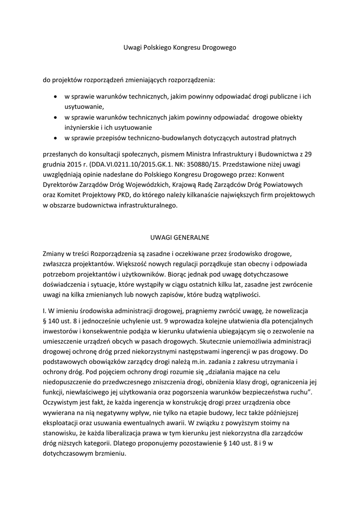 Uwagi Polskiego Kongresu Drogowego do projektów rozporządzeń zmieniających rozporządzenia: w sprawie warunków technicznych, jakim powinny odpowiadać drogi publiczne i ich usytuowanie, w sprawie warunków technicznych jakim powinny odpowiadać drogowe obiekty inżynierskie i ich usytuowanie w sprawie przepisów techniczno-budowlanych dotyczących autostrad płatnych przesłanych do konsultacji społecznych, pismem Ministra Infrastruktury i Budownictwa z 29 grudnia 2015 r. (DDA.VI.0211.10/2015.GK.1. NK: 350880/15. Przedstawione niżej uwagi uwzględniają opinie nadesłane do Polskiego Kongresu Drogowego przez: Konwent Dyrektorów Zarządów Dróg Wojewódzkich, Krajową Radę Zarządców Dróg Powiatowych oraz Komitet Projektowy PKD, do którego należy kilkanaście największych firm projektowych w obszarze budownictwa infrastrukturalnego. UWAGI GENERALNE Zmiany w treści Rozporządzenia są zasadne i oczekiwane przez środowisko drogowe, zwłaszcza projektantów. Większość nowych regulacji porządkuje stan obecny i odpowiada potrzebom projektantów i użytkowników. Biorąc jednak pod uwagę dotychczasowe doświadczenia i sytuacje, które wystąpiły w ciągu ostatnich kilku lat, zasadne jest zwrócenie uwagi na kilka zmienianych lub nowych zapisów, które budzą wątpliwości. I. W imieniu środowiska administracji drogowej, pragniemy zwrócić uwagę, że nowelizacja § 140 ust. 8 i jednocześnie uchylenie ust. 9 wprowadza kolejne ułatwienia dla potencjalnych inwestorów i konsekwentnie podąża w kierunku ułatwienia ubiegającym się o zezwolenie na umieszczenie urządzeń obcych w pasach drogowych. Skutecznie uniemożliwia administracji drogowej ochronę dróg przed niekorzystnymi następstwami ingerencji w pas drogowy. Do podstawowych obowiązków zarządcy drogi należą m.in. zadania z zakresu utrzymania i ochrony dróg. Pod pojęciem ochrony drogi rozumie się „działania mające na celu niedopuszczenie do przedwczesnego zniszczenia drogi, obniżenia klasy drogi, ograniczenia jej funkcji, niewłaściwego jej użytkowania oraz pogorszenia warunków bezpieczeństwa ruchu”. Oczywistym jest fakt, że każda ingerencja w konstrukcję drogi przez urządzenia obce wywierana na nią negatywny wpływ, nie tylko na etapie budowy, lecz także późniejszej eksploatacji oraz usuwania ewentualnych awarii. W związku z powyższym stoimy na stanowisku, że każda liberalizacja prawa w tym kierunku jest niekorzystna dla zarządców dróg niższych kategorii. Dlatego proponujemy pozostawienie § 140 ust. 8 i 9 w dotychczasowym brzmieniu. II. Przepisy rozporządzeń powinny być stosowane do inwestycji przewidywanych po wejściu ich w życie. Dlatego proponujemy dodanie jednobrzmiącego ust. 3 w § 3 projektów rozporządzeń: w sprawie warunków technicznych jakim powinny odpowiadać drogi publiczne i ich usytuowanie oraz w sprawie warunków technicznych jakim powinny odpowiadać drogowe obiekty inżynierskie i ich usytuowanie; wówczas § 3 otrzymałby brzmienie: „§ 3. Jeżeli, przed dniem wejścia w życie niniejszego rozporządzenia, dla inwestycji drogowej: 1) został złożony wniosek o wydanie decyzji o pozwoleniu na budowę lub decyzji o zezwoleniu na realizację inwestycji drogowej, a także odrębny wniosek o zatwierdzenie projektu budowlanego, 2) zostało dokonane zgłoszenie budowy lub wykonywania robót budowlanych, w przypadku, gdy nie jest wymagana decyzja o pozwoleniu na budowę lub decyzja o zezwoleniu na realizację inwestycji drogowej 3) zostało rozstrzygnięte postępowanie o udzielenie zamówienia publicznego na wykonanie dokumentacji technicznej i/lub robót budowlanych dla zadań realizowanych w ramach Regionalnego Programu Operacyjnego (RPO) dla projektów pozakonkursowych - stosuje się przepisy dotychczasowe.”. III. Ponadto wnosimy o wprowadzenie do treści wszystkich trzech rozporządzeń następującego zapisu: „Do realizacji inwestycji drogowych, dla których przed dniem wejścia w życie niniejszego rozporządzenia zostało wszczęte postępowanie o udzielenie zamówienia publicznego na projekt, wykonawstwo lub projekt i wykonawstwo, stosuje się przepisy dotychczasowe.”. IV. Zauważamy brak spójności pomiędzy dwoma projektami: rozporządzenia w sprawie warunków technicznych oraz rozporządzenia "rowerowego". W projekcie rozporządzenia pojawia się pojęcie „ścieżka pieszo-rowerowa”. Z kolei zgodnie z ostatnią poprawką do projektu „rozporządzenia rowerowego” ma nie być "ścieżek pieszo-rowerowych”. Propozycje na spotkaniach zespołów roboczych w zakresie zmiany przedmiotowego rozporządzenia dotyczyły lokalizowania ścieżek rowerowych poza pasem drogowym. Obecna propozycja zmiany rozporządzenia uwzględnia poza pasem drogowym jedynie drogi rowerowe. V. W projekcie rozporządzenia brak jest informacji o promieniach łuku poziomego dla ścieżek rowerowych i ciągów pieszo-rowerowych. Ponadto w treści projektu brakuje wytycznych dotyczących skrzyżowań dwupoziomowych. UWAGI SZCZEGÓŁOWE Rozporządzenie w sprawie warunków technicznych, jakim powinny odpowiadać drogi publiczne i ich usytuowanie 1. Projekt rozporządzenia przewiduje nowe zapisy działu III rozdział 8 pn.: „Część drogi przeznaczona do ruchu pieszych i rowerów”. Z analizy projektu rozporządzenia wynika (brakuje jednak jednoznacznej definicji tego pojęcia), że ścieżka pieszorowerowa to część drogi, na której odbywa się ruch pieszy i rowerowy na wspólnej przestrzeni – w takim przypadku stosuje się znaki C-13/C-16 oddzielone kreską poziomą. W obowiązującym rozporządzeniu jest to odpowiednik ścieżki jednokierunkowej, z której mogą korzystać piesi. W obecnym rozporządzeniu minimalna szerokość takiego ciągu jest określona na 2,5 m. W projekcie rozporządzenia, w obszarze zabudowy lub poza obszarem zabudowy, w przypadku, gdy natężenie ruchu pieszych i rowerów łącznie przekracza 60 osób lub pojazdów na godzinę 