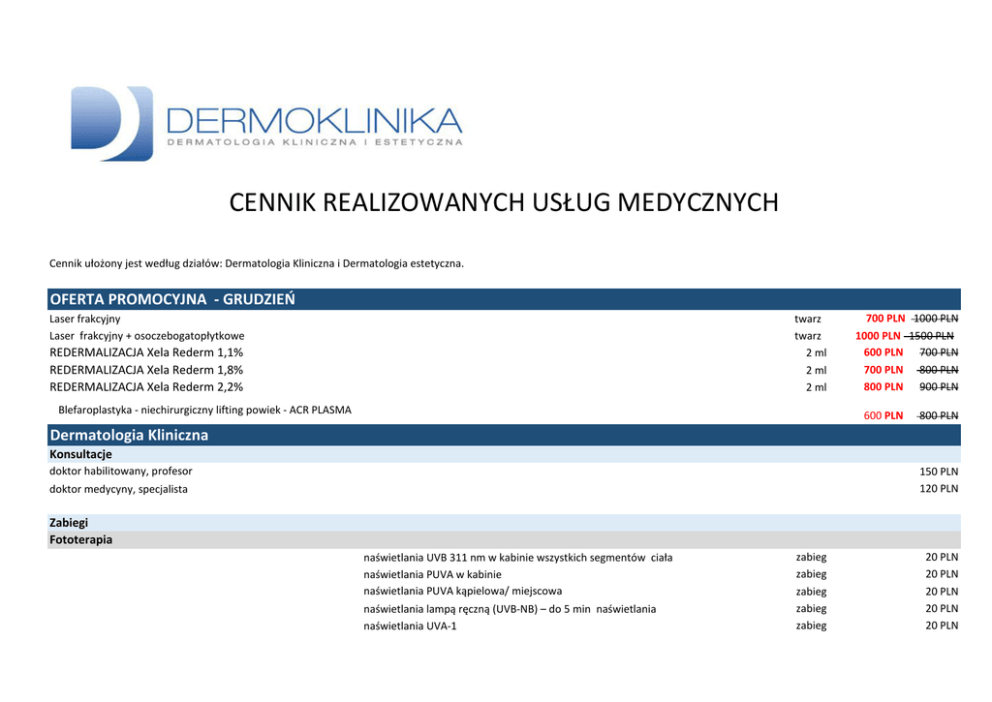 CENNIK REALIZOWANYCH USŁUG MEDYCZNYCH Cennik ułożony jest według działów: Dermatologia Kliniczna i Dermatologia estetyczna. OFERTA PROMOCYJNA - GRUDZIEŃ Laser frakcyjny Laser frakcyjny + osoczebogatopłytkowe twarz twarz 2 ml 2 ml 2 ml REDERMALIZACJA Xela Rederm 1,1% REDERMALIZACJA Xela Rederm 1,8% REDERMALIZACJA Xela Rederm 2,2% Blefaroplastyka - niechirurgiczny lifting powiek - ACR PLASMA 700 PLN 1000 PLN 1000 PLN 1500 PLN 600 PLN 700 PLN 700 PLN 800 PLN 800 PLN 900 PLN 600 PLN 800 PLN Dermatologia Kliniczna Konsultacje doktor habilitowany, profesor 150 PLN 120 PLN doktor medycyny, specjalista Zabiegi Fototerapia naświetlania UVB 311 nm w kabinie wszystkich segmentów ciała naświetlania PUVA w kabinie naświetlania PUVA kąpielowa/ miejscowa naświetlania lampą ręczną (UVB-NB) – do 5 min naświetlania naświetlania UVA-1 zabieg zabieg zabieg zabieg zabieg 20 PLN 20 PLN 20 PLN 20 PLN 20 PLN Zabiegi chirurgiczne 200-300 PLN 200-300 PLN 200 PLN od 200 PLN 100 PLN 250 PLN chirurgiczne wycięcie znamienia chirurgiczne wycięcie zmiany skórnej (kaszaka, tłuszczaka, torbieli) leczenie chirurgiczne paznokcia ektrokoagulacja rozszerzonych naczyń krwionośnych badanie histopatologiczne skóry wycinek skóry/ błony śluzowej z prącia wraz z oceną histopatologiczną Zabiegi kriochirurgii i elektrokoagulacji usuwanie brodawek, włókniaków i naczyniaków metodą elektrokoagulacji lub kriochirurgii do 3 zmian do 5 zmian do 10 zmian 150-200 PLN w zależności od ilości zmian 200-500 PLN następne od 150 PLN 30 PLN 200-250 PLN 450 PLN ACR PLASMA usuwanie włókniaków, brodawek (płaskie, kurzajki, łojotokowe, płciowe) Dermatoskopia (badanie znamion) konsultacja do 3 znamion Leczenie nadpotliwości rąk tolsyna botulinowa 1500 PLN Dermatologia Estetyczna Konsultacje Przy większości zabiegów konieczna jest konsultacja u lekarza medycyny estetycznej przed zabiegiem 150 PLN. Koszt konsultacji wliczany jest w koszt wykonywanego zabiegu. Wizyta kontrola po zabiegu medycyny estetycznej w ciągu 2 tygodni jest bezpłatna. Karboksyterapia *konsultacja u lekarza medycyny estetycznej obowiązkowa przed zabiegiem okolice oka (lifting, redukcja cieni pod oczami oraz obrzęków). Rekomendowane: 4-6 zabiegów podwójny podbródek, chomiki (modelowanie, konturowanie owalu twarzy, redukcja tk. tłuszczowej). Rekomendowanych 4-6 zabiegów. twarz, szyja lub dekolt (lifting, redukcja drobnych zmarszczek i wiotkości skóry). Rekomendowanych 4-6 zabiegów leczenie cellulitu (jeden obszar tzn.: brzuch, całe uda, pośladki itd.). Rekomendowanych: 8-10 zabiegów redukcja tkanki tłuszczowej, modelowanie ciała i poprawa napięcia skóry (1 obszar na ciele). Rekomendowanych 8-10 zabiegów. leczenie rozstępów . Rekomendowane 8-10 zabiegów. leczenie skóry owłosionej głowy (łysienie, wypadanie włosów, poprawa kondycji). Rekomendowane 8-10 zabiegów zaburzenia krążenia, obrzęki, opuchlizna nóg. Rekomendowane 8-10 zabiegów zaburzenia erekcji 150-200 PLN 150-200 PLN 200-300 PLN 300-400 PLN 300-400 PLN 200-300 PLN 300-400 PLN 150 PLN 100 PLN NOWOŚĆ FILORGA HYDRA BOOSTER Innowacyjny zabieg odmładzający skórę wykorzystujący kwas hialuronowy i 53 inne substancje aktywne 800 PLN NOWOŚĆ DR. CYJ HAIR FILER Innowacyjna rewitalizacja komórek włosa i skóry głowy z wykorzystaniem kompleksu peptydowego NOWOŚĆ - REDERMALIZACJA Xela Rederm 1,1% Xela Rederm 1,8% Xela Rederm 2,2% 500 PLN 2 ml 2 ml 2 ml 600 PLN 700 PLN 800 PLN 700 PLN 800 PLN 900 PLN Strefa wokół oczu NOWOŚĆ blefaroplastyka - niechirurgiczny lifting powiek - ACR PLASMA NOWOŚĆ płytkie i głębokie zmarszczki – okolica oka - ACR PLASMA Rewitalizacja skóry wokół oczu "light eyes" Korekcja cieni i dołów pod oczami 600 PLN 800 PLN 600 PLN 800 PLN 300 PLN 750 PLN Laser frakcyjny strefy realizacji zabiegu twarz dekolt szyja twarz, szyja, dekolt, powieki 700 PLN 1000 PLN 800 PLN 700 PLN 2000 PLN jedna ampułka powyżej trzech ampułek, koszt jednej wynosi 350 PLN 250 PLN Lipoliza iniekcyjna Cenę zabiegu kształtuje ilość zużytego preparatu Mezobotox 700-800 PLN zabieg Mezoterapia igłowa *konsultacja u lekarza medycyny estetycznej obowiązkowa przed zabiegiem strefy realizacji zabiegu skóra głowy twarz, szyja szyja, dekolt grzbiety rąk ciało – łagodzenie rozstępów i cellulitu 250 PLN 250-550 PLN 450 PLN 300 PLN 350-450 PLN Nici hialuronowe 1000-1500 wolumetria twarzy, modelowanie owalu twarzy Nici liftingujące PDO zabieg normal 1 nić First Lift Barbry - z haczykami 1 nić 70 PLN 500 PLN Osocze bogatopłytkowe * Podane ceny to koszt jednego zabiegu strefy realizacji zabiegu okolica oka (lifting, redukcja zmarszczek, cieni pod oczami). Rekomendowana ilość 4-6 zabiegów twarz lub szyja lub dekolt (lifting, redukcja drobnych zmarszczek, wiotkości skóry). Rekomendowana ilość 4-6 zabiegów twarz + szyja (lifting, redukcja drobnych zmarszczek, wiotkości skóry). Rekomendowana ilość 4-6 zabiegów twarz + szyja + dekolt (lifting, redukcja drobnych zmarszczek, wiotkości skóry). Rekomendowana ilość 4-6 zabiegów powierzchnia grzbietowa rąk (lifting, redukcja drobnych zmarszczek, wiotkości skóry). Rekomendowana ilość 4-6 zabiegów twarz + szyja + dekolt + powierzchnia grzbietowa rąk (lifting, redukcja drobnych zmarszczek, wiotkości skóry). Rekomendowana ilość 4-6 zabiegów redukcja wiotkości, ujędrnianie ciała, poprawa napięcia skóry (1 dowolny obszar na ciele np.: piersi, ramiona, brzuch, uda, pośladki itd.) Rekomendowana ilość zabiegów:4-6 300-400 PLN 700 PLN 800 PLN 1000-1100 PLN 300-400 PLN 1200-1300 PLN 600-700 PLN Osocze bogatopłytkowe + Karboksyterapia * Podane ceny to koszt jednego zabiegu strefy realizacji zabiegu okolica oka (lifting, redukcja zmarszczek, cieni pod oczami). Rekomendowana ilość 4-6 zabiegów twarz lub szyja lub dekolt (lifting, redukcja drobnych zmarszczek, wiotkości skóryoraz przebarwień). Rekomendowana ilość 4-6 zabiegów twarz + szyja (lifting, re