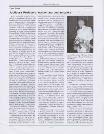 Wiadomości Akademickie Jubileusz Profesora Waldemara Jędrzejczyka Kilka niezwykle ważnych okazji według organizatorów przekroczył sumę złożyło się na piękną uroczystość jaką 15 tysięcy złotych, zostanie przeznaczony zorganizowały prof. dr. hab. med. Walde na zakup urządzeń niezbędnych do marowi Jędrzejczykowi - kierownikowi dalszego funkcjonowania obu hospicjów. Katedry i Kliniki Chirurgii Ogólnej, Gastroenterologicznej i Onkologicznej Główny bohater - beneficjent Waldemar Jędrzejczyk urodził się 1 sty Akademii Medycznej w Bydgoszczy cznia 1933 r. w Skarżysku Kamiennej. z siedzibą w Toruniu Wojewódzki Szpital Szkołę średnią ukończył w rodzinnym Zespolony w Toruniu oraz Rotary Club mieście, by w 1952 r. rozpocząć studia Młyniec Drugi. 70-lecie urodzin Profe na Akademii Medycznej w Białymstoku. sora, 45-lecie Jego pracy zawodowej oraz W 195 9 r. poszukując pracy trafił do 32 lata od momentu objęcia funkcji Torunia, miasta powiatowego z ogrom ordynatora chirurgii toruńskiego szpitala nymi tradycjami medycznymi. Został zostały uwiecznione wspaniałym bene asystentem wybitnego chirurga doktora fisem, który odbył się w toruńskim Teatrze Stefana Myszki, ordynatora Oddziału Wilama Horzycy dnia 29 września br. Chirurgicznego I Szpitala Miejskiego im. Pośród znakomitych gości znaleźli się M. Kopernika. To pod jego bokiem sta liczni przyjaciele i współpracownicy wiał pierwsze kroki w trudnej profesji Profesora. Na uroczystość przybyły wła chirurga, on też zaszczepił w przyszłym dze Akademii w osobach prof. dr hab. Profesorze pasje do tej dziedziny medy med. Danuty Miścickiej-Śliwki - JM cyny. W 1962 r. zdał egzamin na pierwszy Rektora Akademii Medycznej w Bydgo stopień specjalizacji, a pięć lat później - stażem klinicznym młodego doktora szczy; dr. hab. Stanisława Dąbrowie na drugi. habilitowanego w Royal Free Hospital ckiego, prof. AM - Prorektora ds. Zainteresowania naukowe zaowoco Klinicznych i Kształcenia Podyplomo wały pracą doktorską pt. „Operacyjne Profesor chętnie włączał się w różnego wego AM oraz prof. dr hab. Gerarda leczenie zespołów poresekcyjnych w ma rodzaju przedsięwziecia natury organiza w Londynie. Drewy - Dziekana Wydziału Lekarskiego teriałach oddziału chirurgicznego I Szpi cyjnej, zwłaszcza na polu towarzystw AM. Nie zabrakło również reprezen tala Miejskiego w Toruniu", którą obronił naukowych. Zarząd Główny Towarzystwa tantów - tak bliskiego Profesorowi - w Akademii Medycznej w Gdańsku Chirurgów Polskich powierzył mu orga toruńskiego środowiska naukowego w grudniu 1969 r. Był jedynym asy nizację 49. Zjazdu Towarzystwa Chi z prof. dr. hab. Janem Kopcewiczem - stentem oddziału, który uzyskał stopień rurgów Polskich w 1978 r. Odbył się on JM Rektorem Uniwersytetu Mikołaja naukowy. po raz pierwszy w ośrodku pozaakade Kopernika oraz prof. dr. Marianem W dwa lata później dr med. Waldemar Biskupem - Prezesem Toruńskiego Towa Jędrzejczyk wygrał konkurs na stano kolejne zjazdy krajowe i międzynarodowe rzystwa Naukowego na czele. Benefis wisko ordynatora Oddziału Chirurgii (Sekcja Videochirurgii - 1997, Sympo mickim. W dorobku profesora są również uświetnili swą obecnością - by wspom w nowo powstałym Szpitalu Miejskim zjum Młodych Europejskich Chirurgów nieć tylko o przedstawicielach władz nr 2 w Toruniu. Od początku oddział, - 1998). samorządowych i miejskich - Marszałek a potem Klinika reprezentowały dzia Towarzystwo Chirurgów Polskich Województwa Kujawsko-Pomorskiego łalność o profilu gastroenterologicznym zawsze było w centrum zainteresowania Waldemar Achramowicz, z-ca Prezydenta i naczyniowym. Inspirowany pracami Profesora Waldemara Jędrzejczyka. Pre Miasta Torunia Zbigniew Fiderewicz oraz R.M. Kirka z Londynu wprowadził na zentował swoje doniesienia na zebraniach poseł na Sejm Rzeczypospolitej Bogdan swoim oddziale antrektomię śluzówkową TChP, przez trzy kadencje pełnił funkcję Lewandowski. Instytucje organizujące i resekcję śluzówkową żołądka. W kwie prezesa Oddziału Bydgosko-Toruńskiego uroczystość reprezentowali Dyrektor tniu 1977 r., na podstawie oceny ogól Towarzystwa, był wieloletnim członkiem Wojewódzkiego Szpitala Zespolonego nego dorobku naukowego i rozprawy Zarządu Głównego (5 kadencji). Starał się w Toruniu Andrzej Wiśnicki oraz Prezy habilitacyjnej pt. „Antrektomia śluzów o podniesienie prestiżu rydygierowskiej dent Rotary Club Młyniec Drugi Janusz kowa Kirka w modyfikacji własnej w le korporacji chirurgów. W śród rozlicznych odznaczeń szczególnie ceni sobie tytuł Budzyński wraz z Mistrzem Ceremonii czeniu choroby wrzodowej żołądka Jerzym Bańkowskim. Organizatorom i dwunastnicy", uzyskał stopień doktora Honorowego Członka Towarzystwa Chi - obok uczczenia jubileuszu Profesora - habilitowanego w Akademii Medycznej rurgów Polskich przyświecał szczytny cel pomocy dwom w Poznaniu. (I 997). Ambicja zawodowa, dokonania nau hospicjom Szukając inspiracji i nowych dróg kowe nie pozostały niezauważone. Samo „Światło" i „Nadzieja", których przed w chirurgii, przebywał na stażach nau tny docent w Toruniu stał się przedmiotem stawicielki - Panie Janina Mirończuk kowych w klinikach prof. J. Nielubowicza zainteresowań akademii medycznych. i Olena Bożemska ogromnie rade z hoj w Warszawie, prof. Grassiego w Rzymie, W latach 1979-1984 w Oddziale Chirur działającym w mieście ności ofiarodawców, nie kryjąc łez w Mary Hitchcock Hospital w Vermont gicznym Wojewódzkiego Szpitala Zespo wzruszenia składały podziękowania (USA) i w Budapeszcie. Korespondencja lonego ćwiczenia odbywali studenci Aka w imieniu swych podopiecznych na ręce z twórcą metody antrektomii śluzów demii Medycznej w Gdańsku. W 1989 r. Profesora. Dochód z benefisu, który kowej R.M. Kirkiem zaowocowała związał się na stałe z Akademią Medyczną - 8 - Wiadomości Akademickie